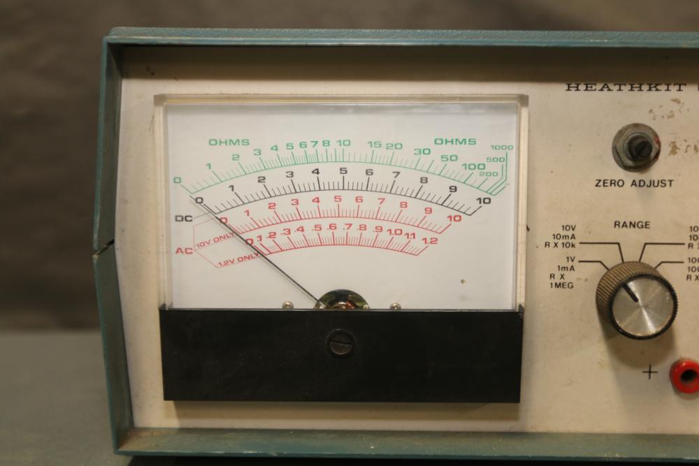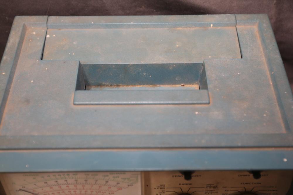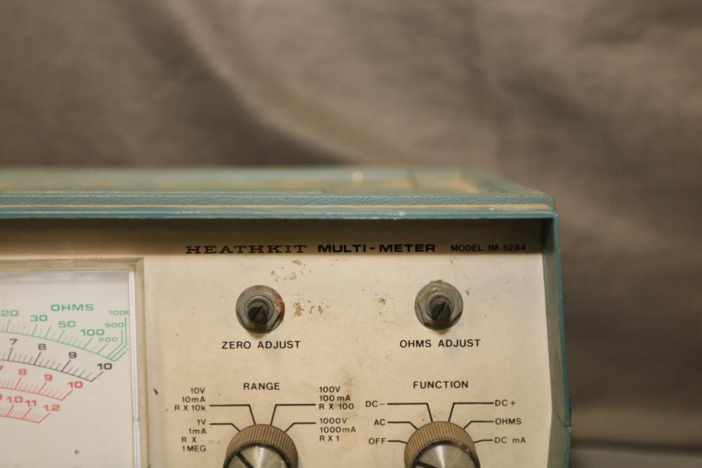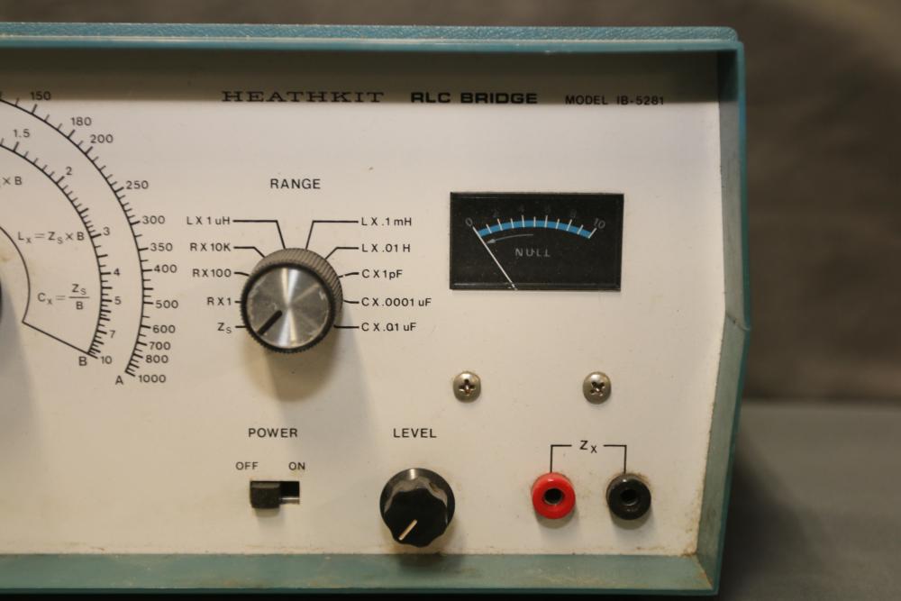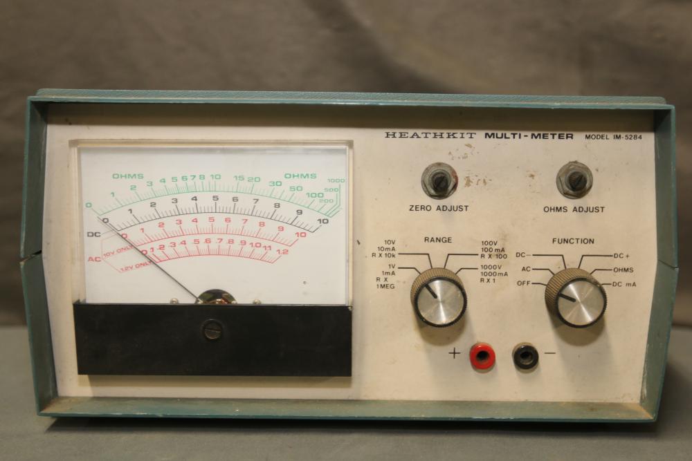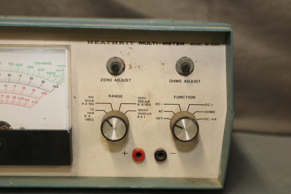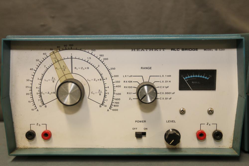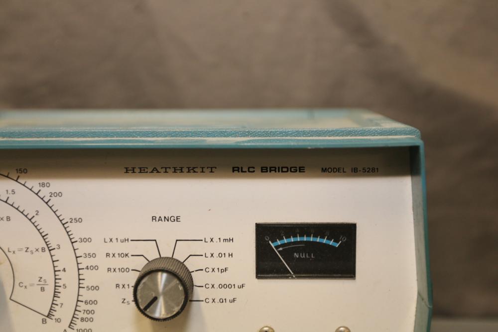 Heathkit IB-5281 RLC Bridge Tester and Heathkit IM-5284 Multimeter. The IB-5281 is designed for measuring resistances, capacitances, and inductances over a range of values. The IM-5284 is a multimeter capable of measuring voltage, current, and resistance. Both units show some signs of use and wear. Pickup only.