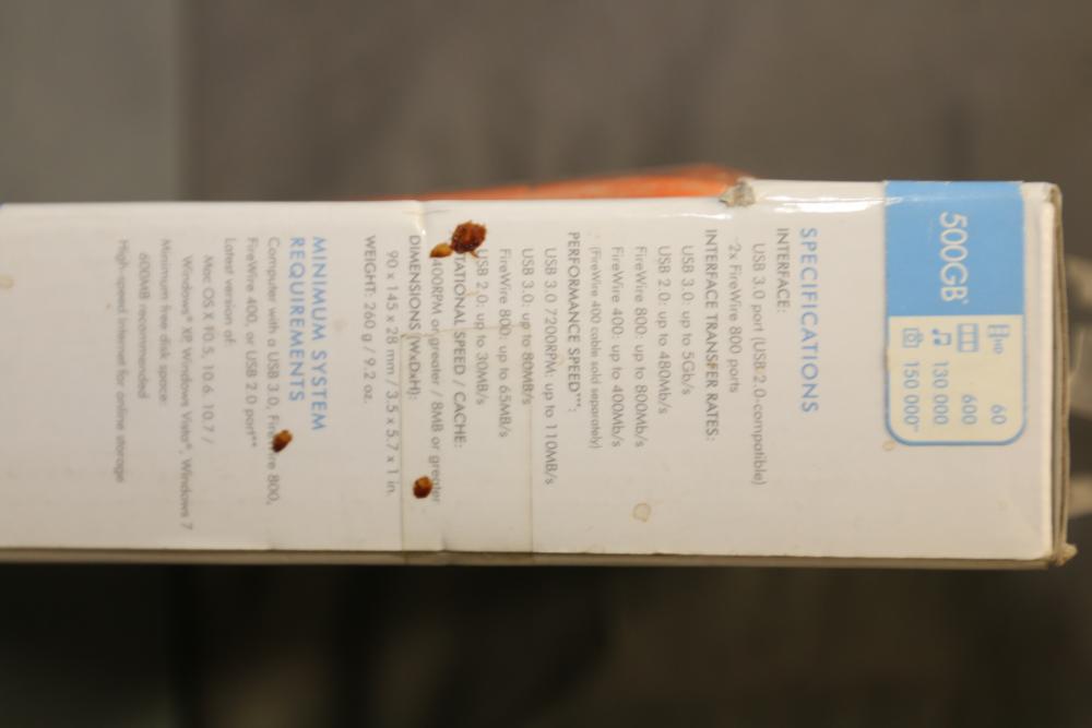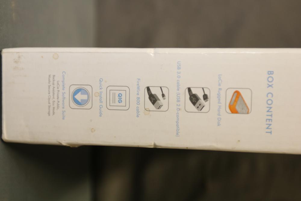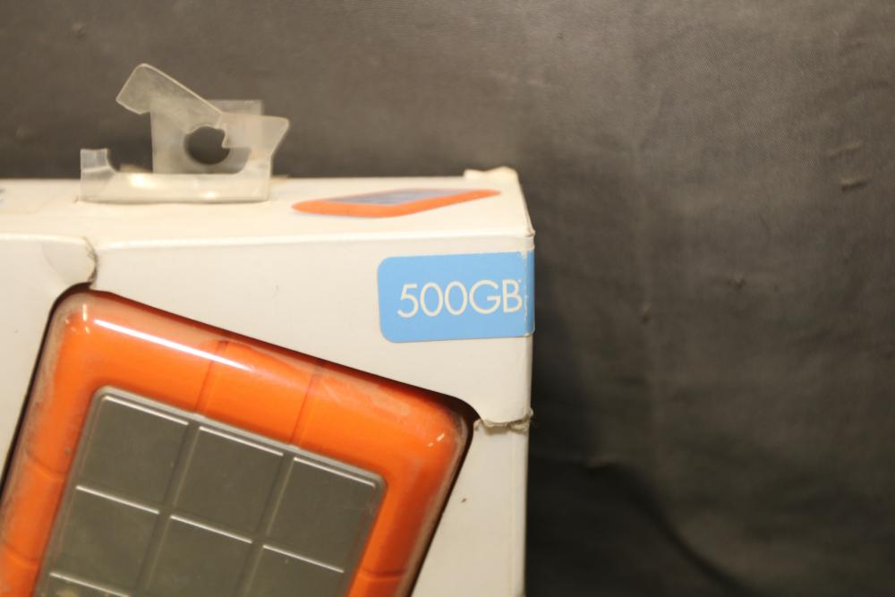 LaCie Rugged Triple 500 GB External Hard Drive includes USB 3.0, USB 2.0, and FireWire 800 connectivity. Features AES 256 encryption, compatibility with Mac OS and Windows, and drop resistance up to 2 meters. Box includes the drive, USB 3.0 and FireWire cables, a quick installation guide, and software suite. Pickup only.