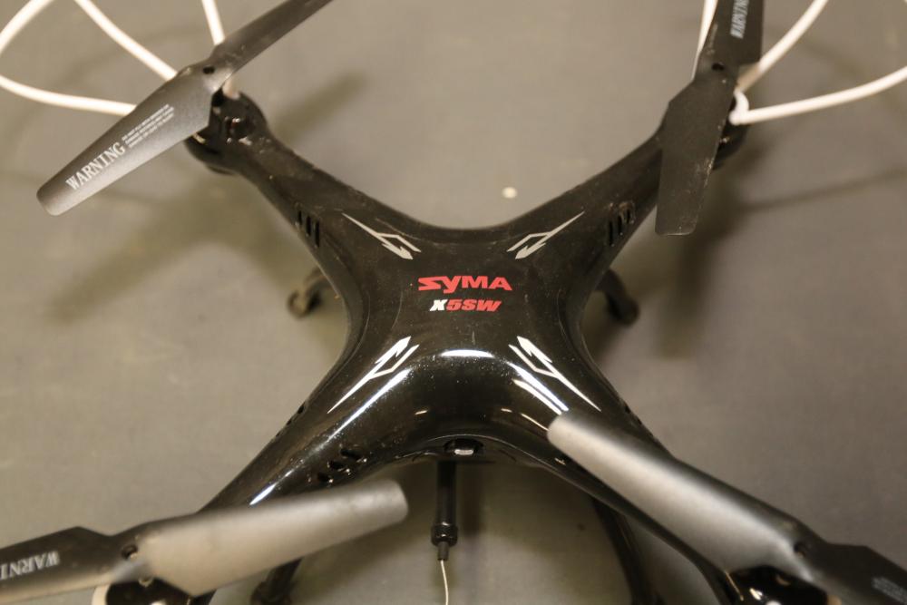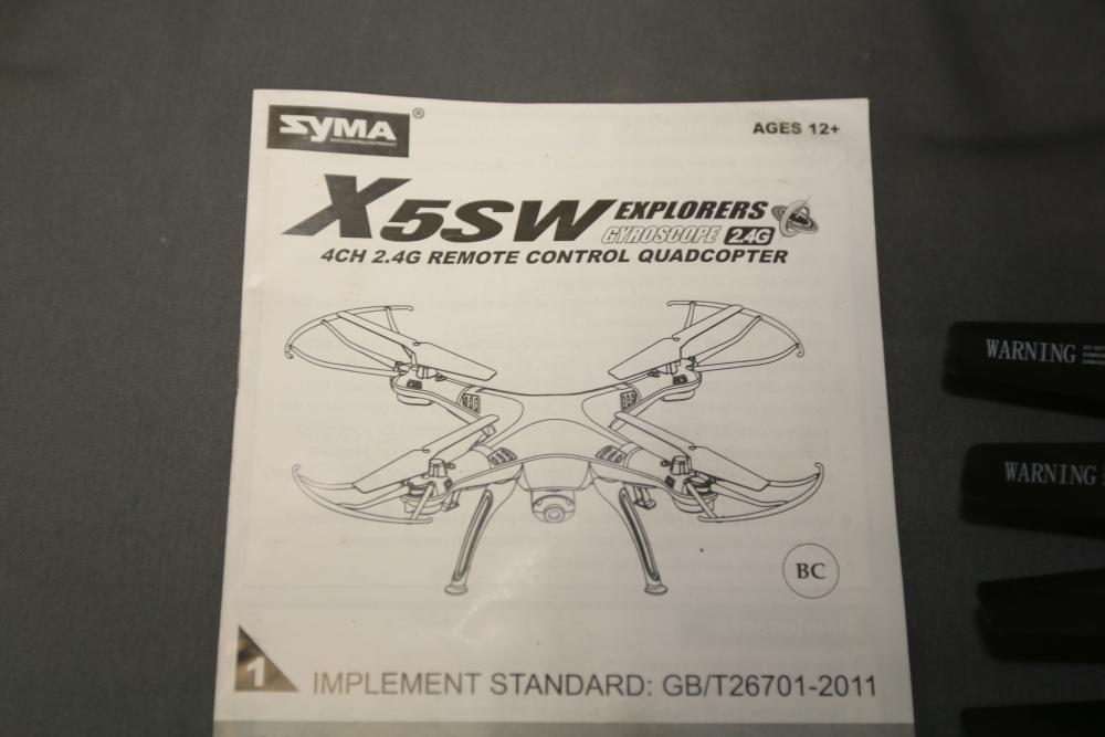 Syma X5SW 4CH 2.4G Remote Control Quadcopter with Remote. Includes a quadcopter with propeller guards, 2.4G remote control, extra propellers, and instruction manual. Designed for ages 12 and up. Pickup only.
