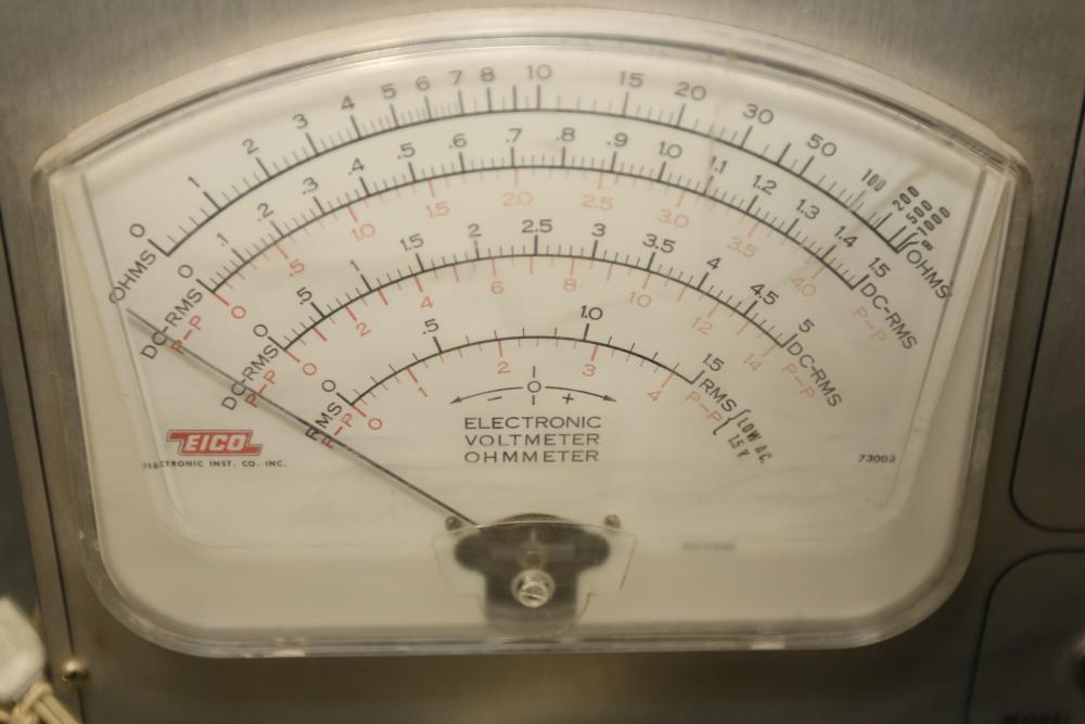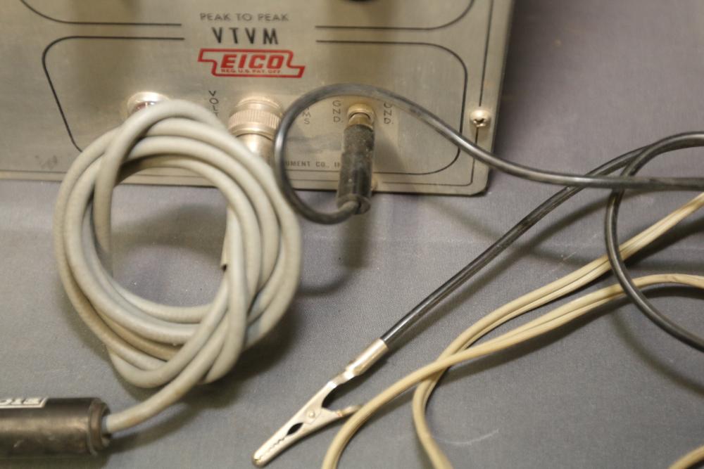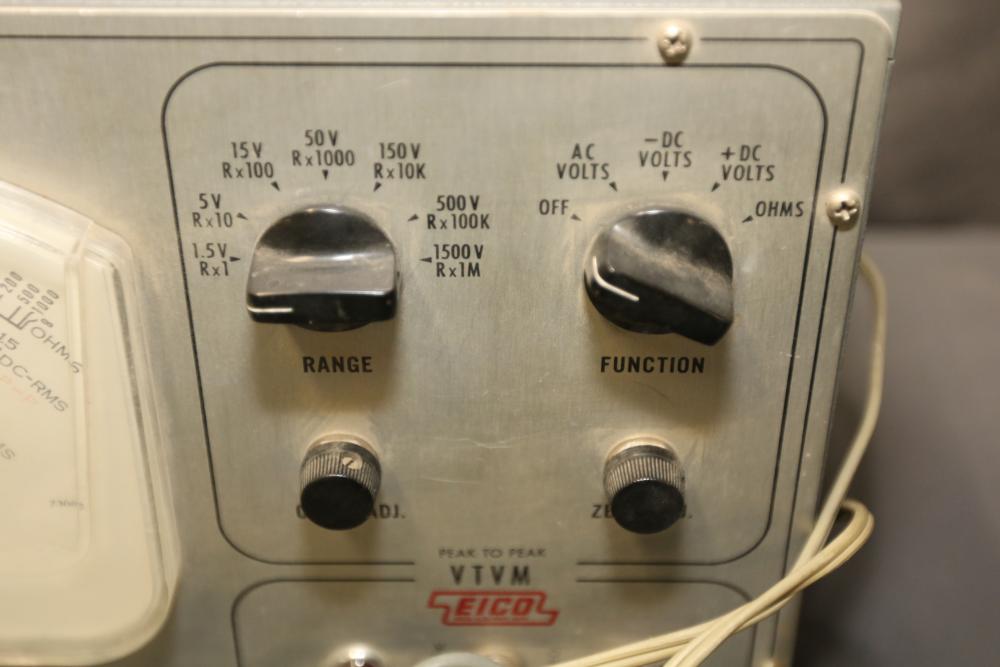 Eico Model 249 Vintage Electronic Vacuum Tube Voltmeter. Features a metal casing with a large analog display, multiple range and function knobs, and reset options. Includes attached cables and original probe. Shows visible wear consistent with age. Pickup only.