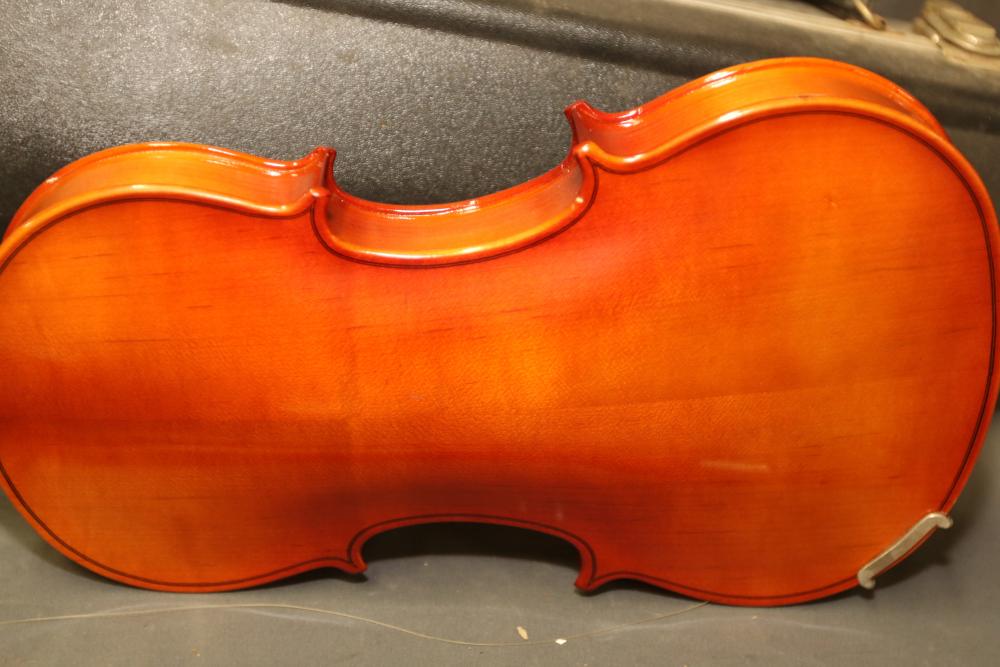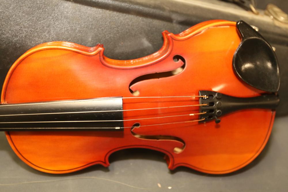 Carlo Robelli HV-100 4/4 Beginner's Violin with bow, bridge, Paganini violin rosin, and hard carrying case included. The violin shows a polished wood finish, black tuning pegs, and chin rest. The set includes all shown accessories, accommodating entry-level use. Pickup only.