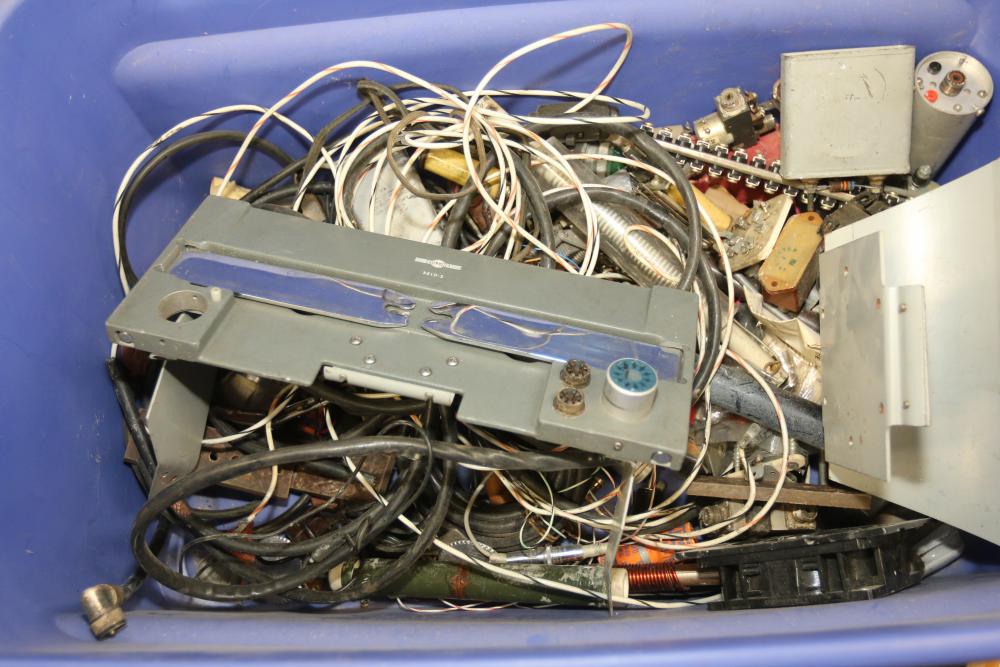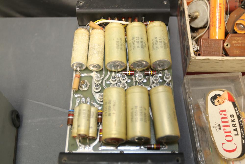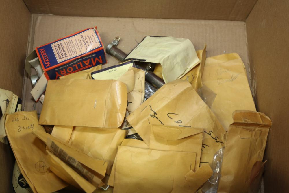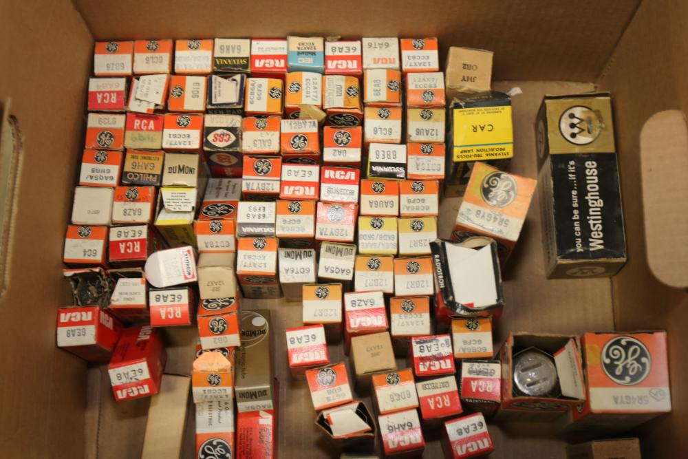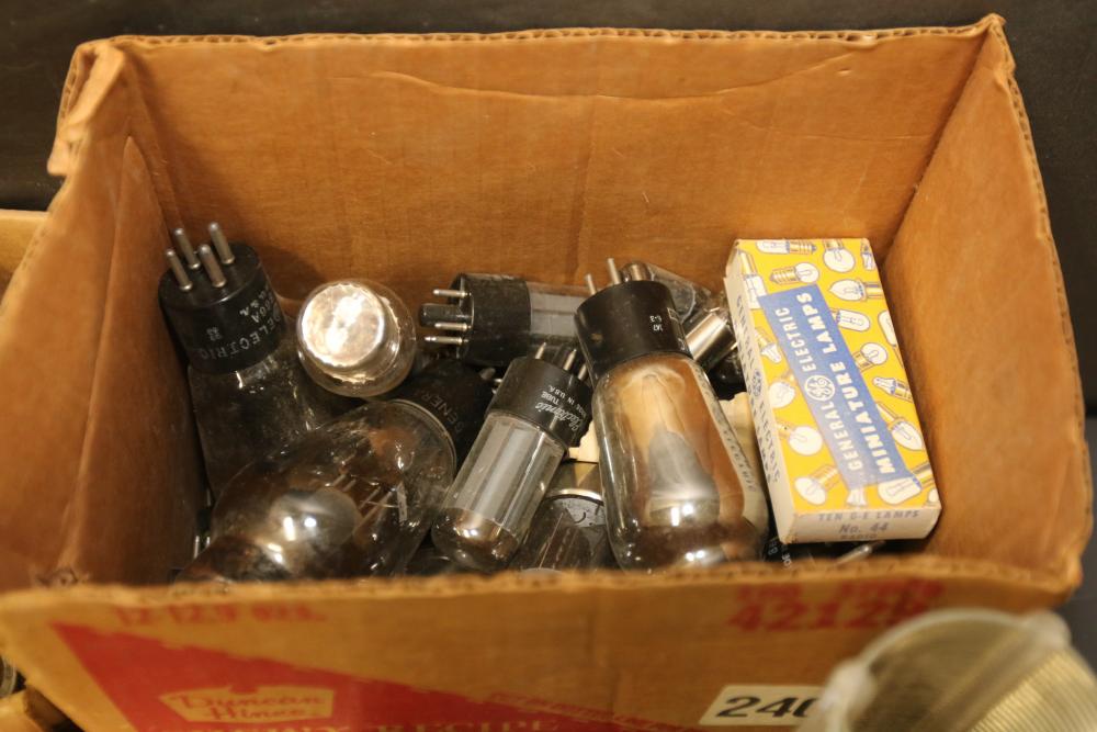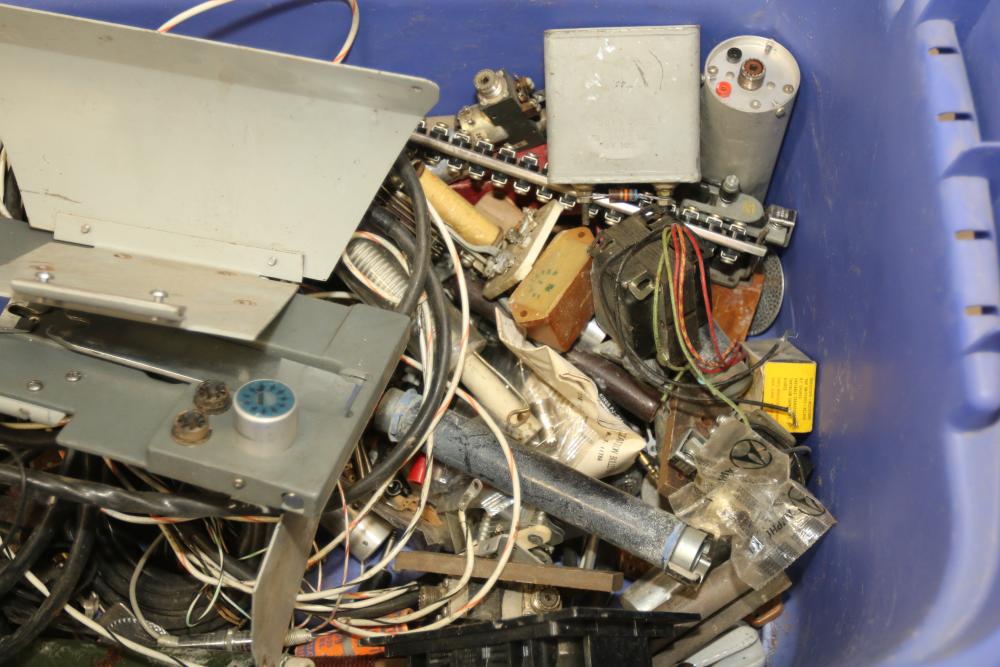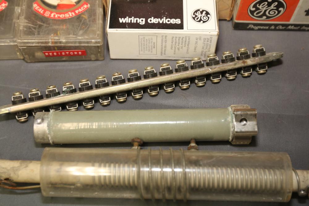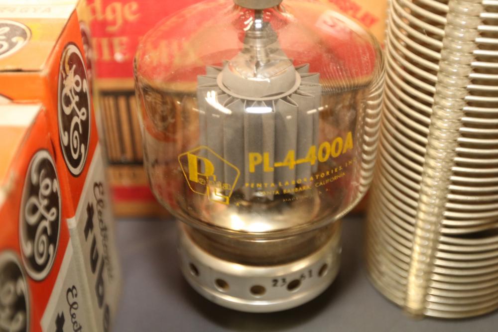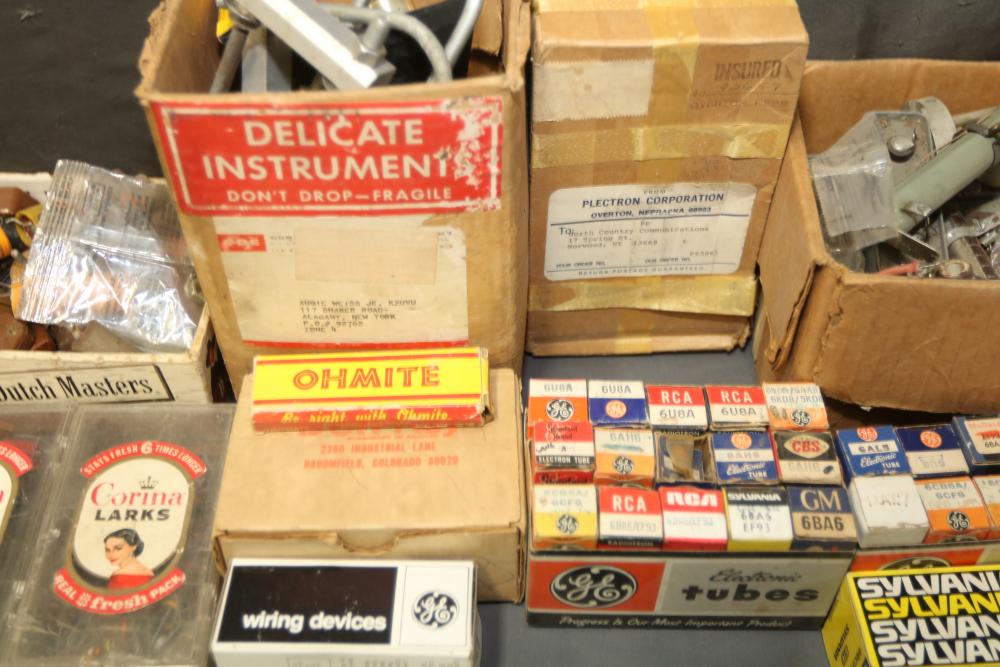Electronics and ham radio accessories including fuses, electron tubes (GE and RCA), multiple wiring devices, Collins Winged Emblem MP-1 Mobile Power Supply, Collins Winged Emblem 351D-2 Mobile Mount, Penta PL-4-400A High Power Transmitting Tube, UTC S-61 Transformer, capacitors, resistors, and additional components. Pickup only.