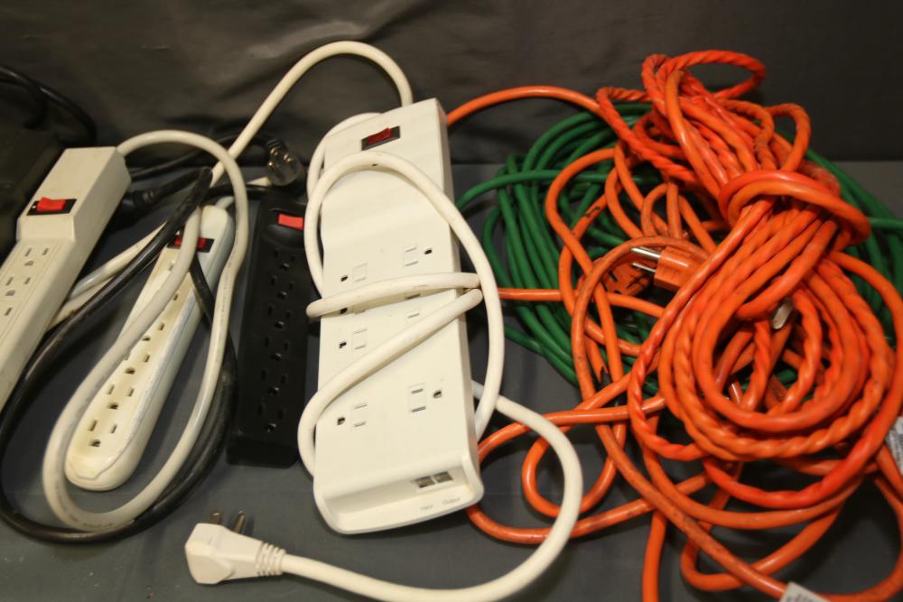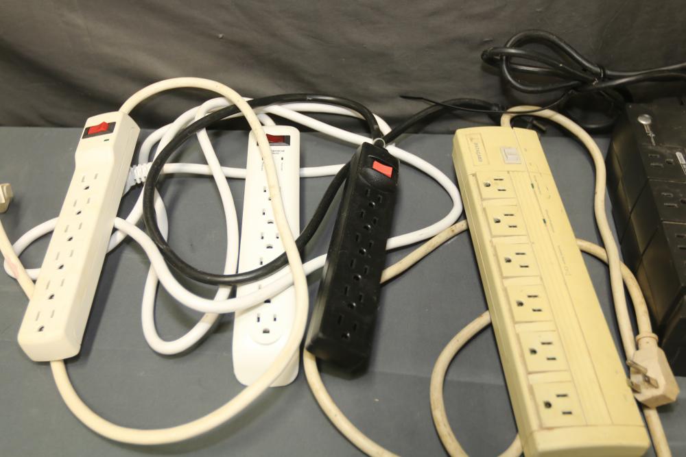 Power strips, surge protectors, and extension cords. Includes a variety of power strips with varying numbers of outlets, a surge protector, and multiple extension cords in different lengths and colors. Condition and functionality have not been verified. Pickup only.
