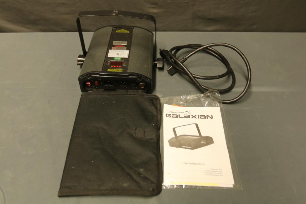 American DJ Galaxian 3D Laser Light. Includes the laser light unit, power cord, user manual, and a protective carrying case. The unit is designed with a function display and multiple input/output connections for versatile use. Pickup only.