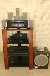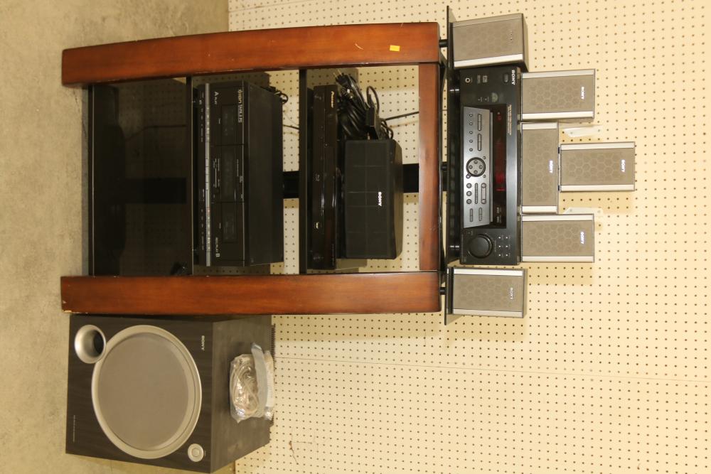 Four-Tier Multimedia Center with Glass Shelves and 4 Sony SS-MSP88 Satellite Speakers, 1 Sony CNP-88 Center Channel Speaker, 1 Sony SA-WMSP68 Powered Subwoofer with wiring, 1 Sony STR-K740P 5.1 Channel AV Receiver, 1 Sony SS-CN101 Center Speaker, 1 Pioneer BDP-430 Blu-Ray Player with Remote and Wiring, and 1 Ion Tape 2 PC Dual Cassette Deck Transfer Player featuring USB Conversion System. Pickup only.