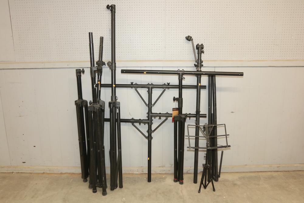 Music stands including speaker stands, drum stands, and music sheet stands. Includes brands such as Ludwig, Gator Frameworks, and St. Louis Stage Hardware. Pickup only.