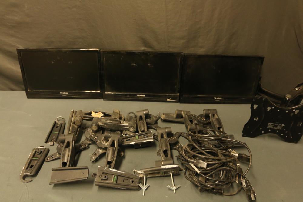 Quantity of 3 ViewSonic N1630W 15.6 inch 720p LCD TVs and power supply cords with Chief TS118SU Small Thinstall Dual Swing Arm Wall Display Mount. The wall display mount is missing some hardware. Includes multiple wall mount brackets. Pickup only.