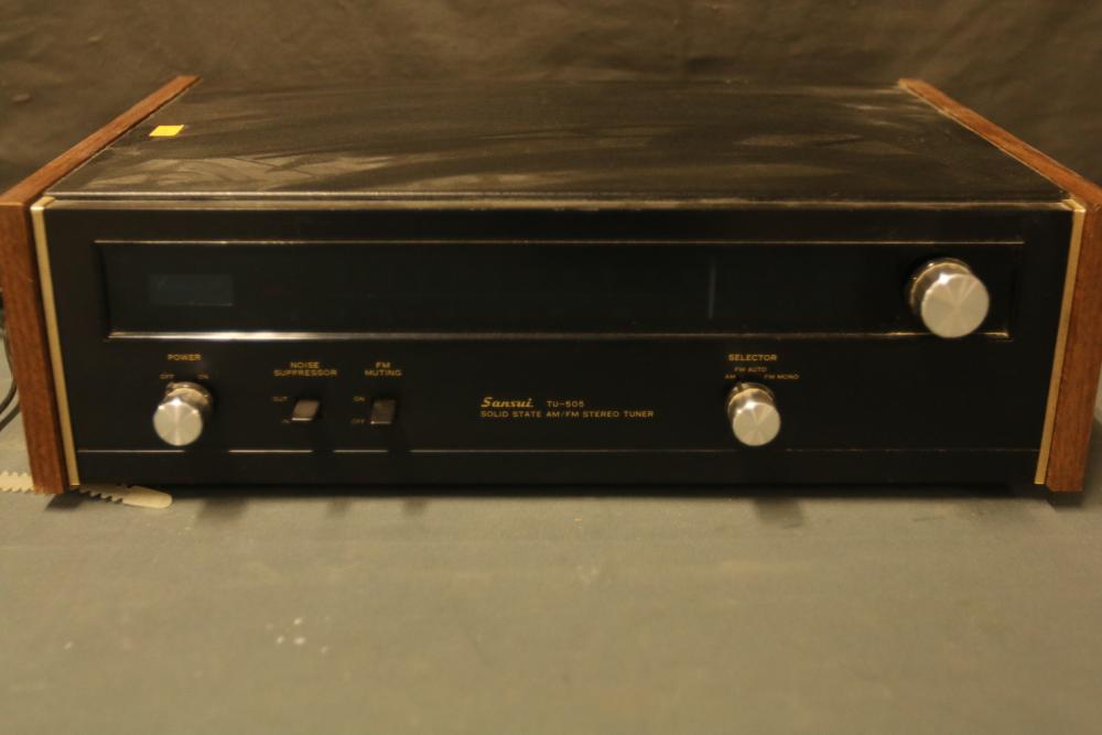 Vintage Sansui TU-505 Solid State AM/FM Stereo Tuner featuring a classic black design with wood side panels. Includes dials for power, selector, FM muting, and noise suppression. The tuner is in used condition with visible wear consistent with age. Rear panel features input/output connections and a power cord with minor wear. Pickup only.