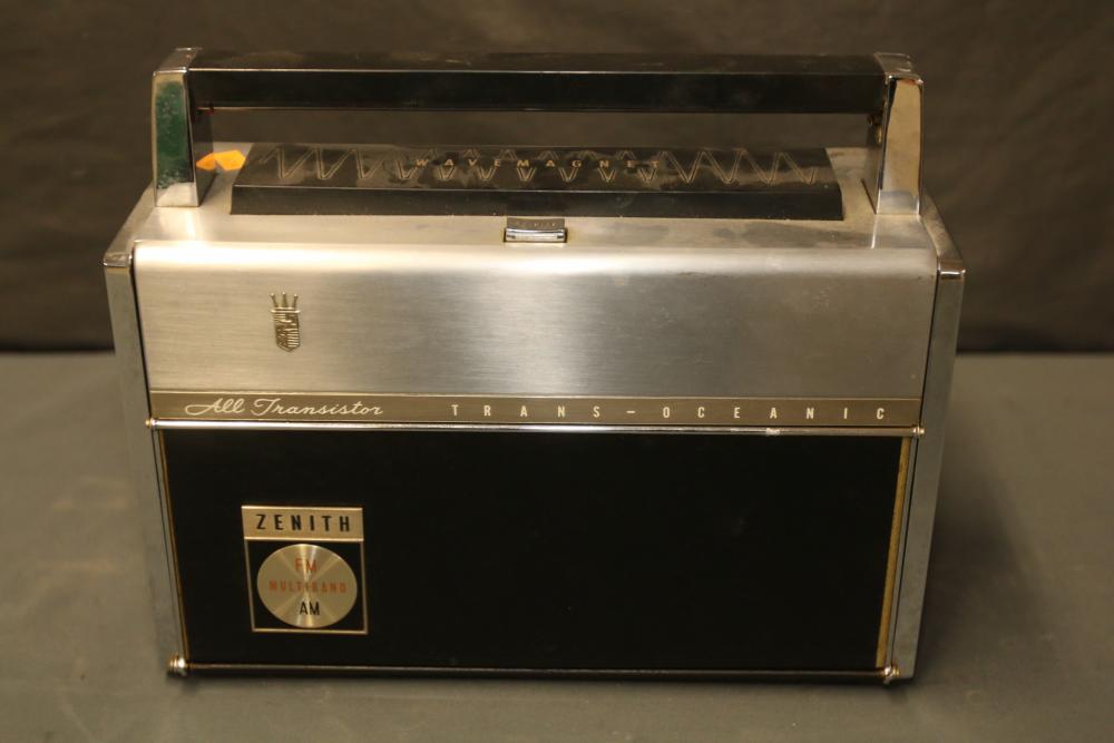 Vintage Zenith Trans-Oceanic FM/AM Multiband Royal 3000-1 Radio. Features a chrome and black exterior with a fold-out cover showcasing logs and charts. Includes dials for AM and FM tuning, external power supply input, and internal component layout. Appears to retain original labels and documentation within the compartment. Pickup only.