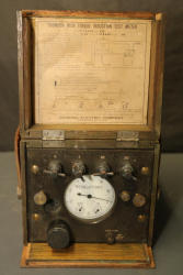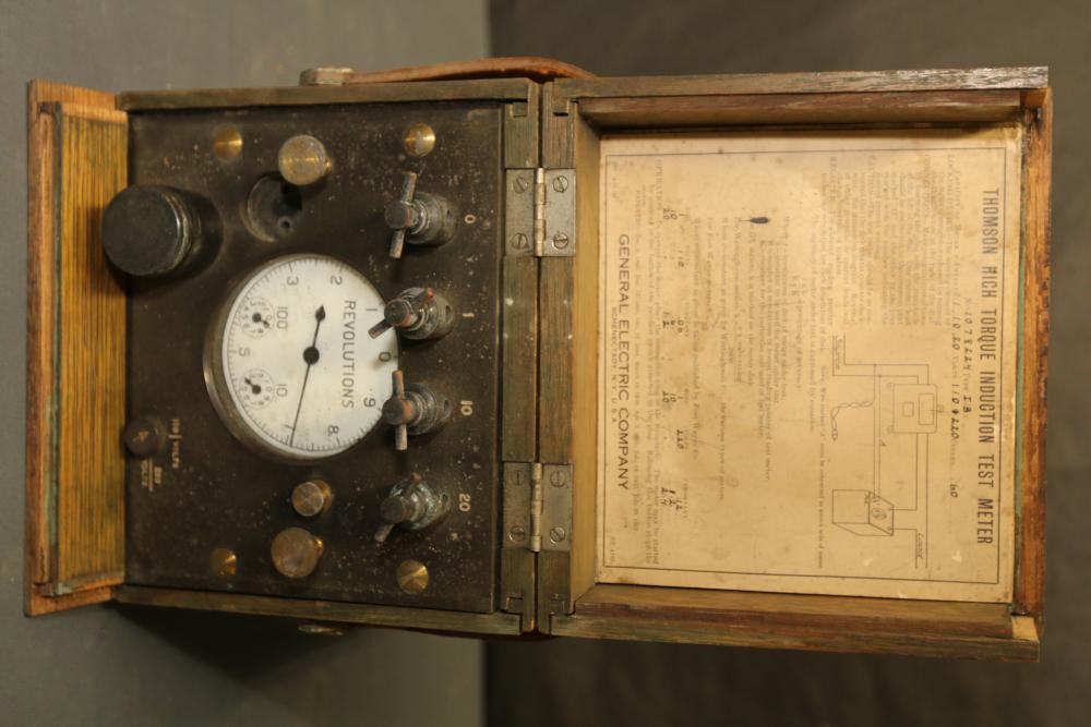 Vintage General Electric Thomson High Torque Induction Test Meter Type I.B. Encased in a wooden box with a leather handle and a metal clasp. Features an analog display marked 'Revolutions' with control knobs and operational details. Includes instructional text and diagrams inside the lid. Pickup only.