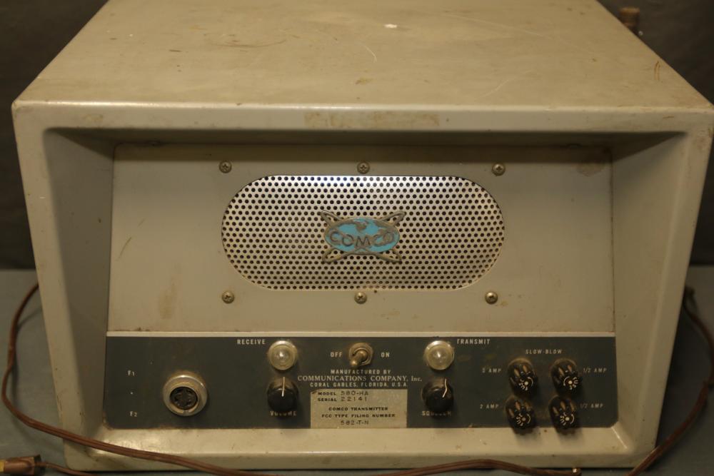Communications Company (ComCo) 580-HA Vintage Ham Radio Transmitter featuring a metal body with ventilation panels, control knobs for volume, squelch, and transmitter functions, and labeled electrical input/output terminals. The unit shows evidence of age and wear, including some scratches, discoloration, and dust. Power cord is included. Pickup only.
