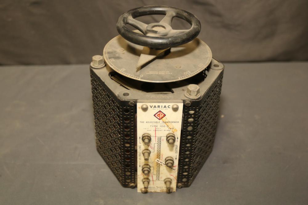 General Radio Variac Vintage Adjustable Transformer Type 100-Q. Features adjustable voltage output, durable metal housing with perforation for ventilation, and large control knob for precision adjustments. Designed for 10 amps and 115 volts. Pickup only.