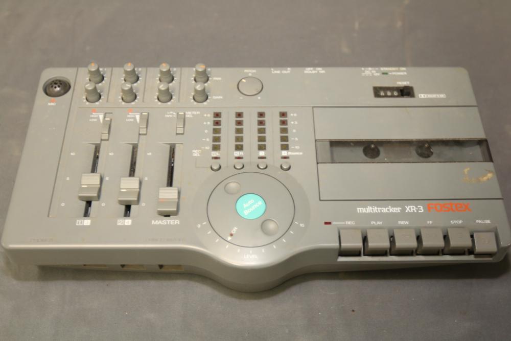 Fostex XR-3 Audio Multitracker featuring multiple input/output ports, manual controls, and a cassette deck. The unit allows for audio mixing and recording. Some signs of wear are present. Pickup only.