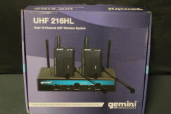 Gemini UHF-216HL Dual-16 Channel UHF Wireless System includes dual wireless receivers, body packs, and accessories. Features 250 foot operating range, interference protection, and options for up to 4 microphones. Includes cables, headsets, and power adapter. Pickup only.