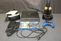 PlayStation 4 Bundle with Console, Controllers, VR Headset, and 2 Games. Includes PlayStation 4 console with power cord and AC adapter, one Sony DualShock4 wireless controller in black and one third-party DualShock4 wireless controller in blue, one Sony PlayStation Virtual Reality V1 headset with Sony PlayStation VR Processing Unit CUH-ZVR1, one PowerA Charge and Display Station for PlayStation VR with A/C adapter, two Sony PlayStation Motion Controllers Model CECH-ZCM1U, one copy of PlayStation VR Demo Disc, and one copy of Plants vs. Zombies Garden Warfare for PlayStation 4. Pickup only.