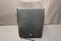 Dayton Audio Sub-80 80-Watt Powered Subwoofer, featuring an 8-ohm impedance and adjustable gain and frequency controls. The back panel provides input and output connections for low and high-level configurations, along with phase and auto/on-off switch options. Some visible wear and scratches are present on the exterior. Pickup only.