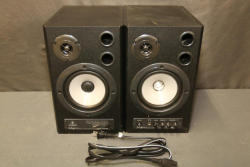 Behringer MS40 40-Watt Two-Way Active Stereo Digital Studio Monitor Speakers. Features digital and analog inputs and a compact black design. Includes power cord. Notable scuffs and surface wear visible on the exterior. Functional and ready for use. Pickup only.