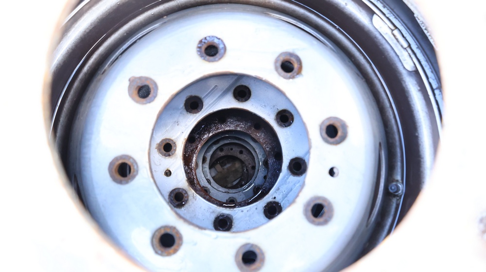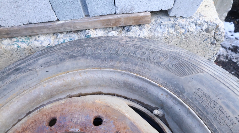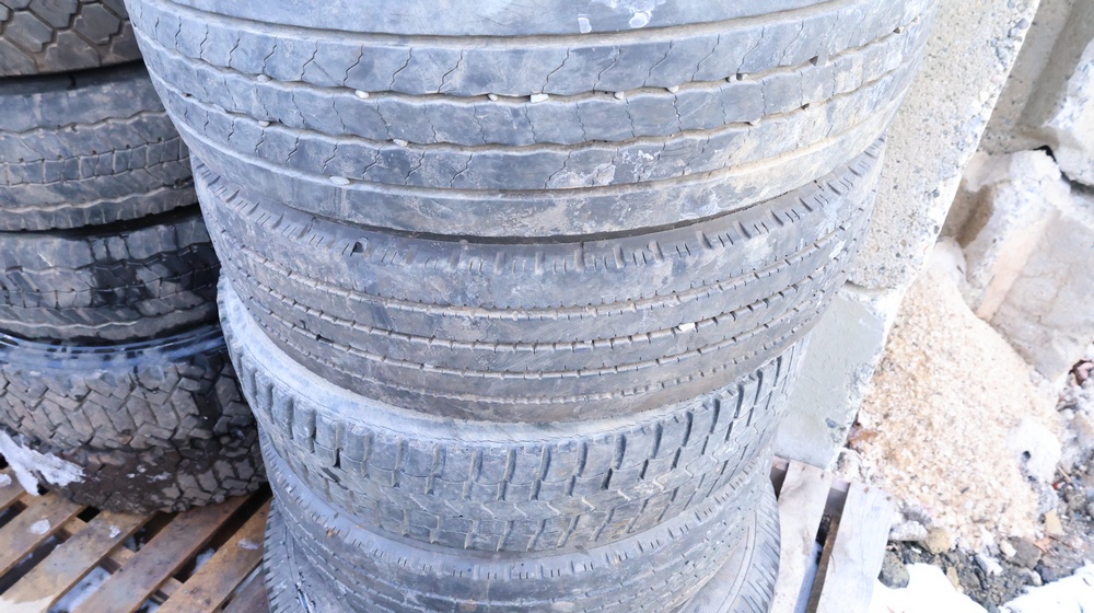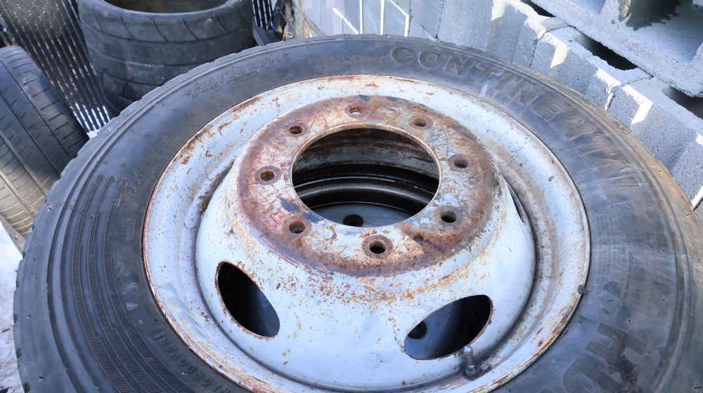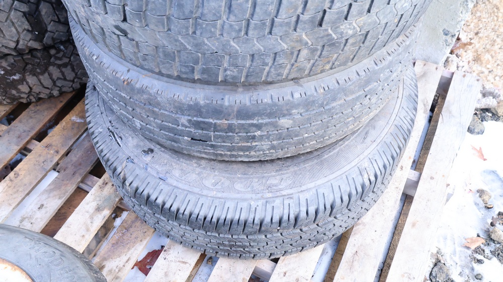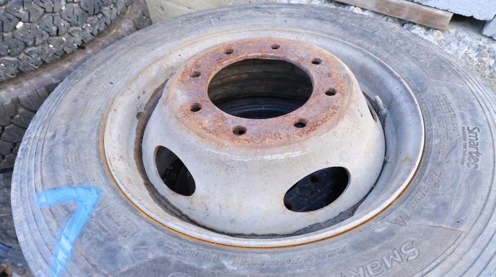 Selection of tires mounted on 10-lug steel rims, all removed from a Ford F-550. Tires include Hankook Smart Flex AH35 (225/70R19.5), Continental HDR (225/70R19.5), and Goodyear models, among others.