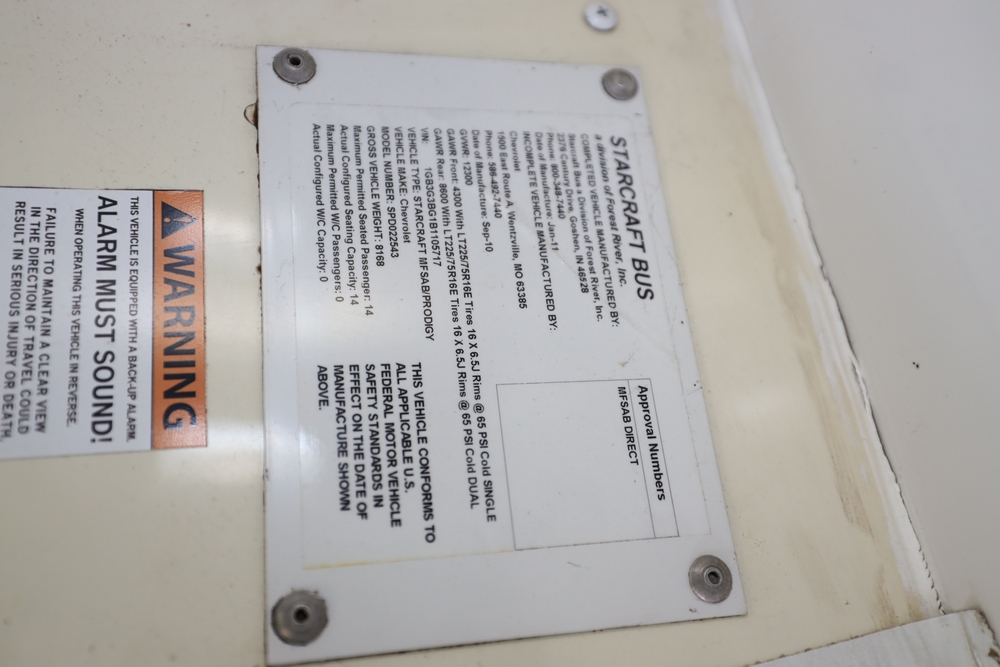 2011 Chevrolet Express 3500 Bus, Mfg. by Starcraft. VIN: 1GB3G3BG1B1105717. Engine: 6.0L V8 SPFI Flex Fuel. Odometer reading: 73738. Runs, drives, operates. Title & key available.