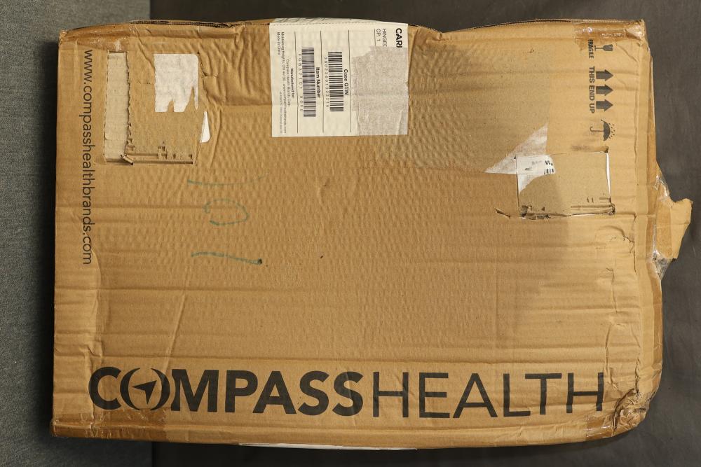 Carex FGB32100 Elongated Hinged Toilet Seat Riser. Designed to provide an elevated seat for comfort and convenience. Features a hinged design for ease of cleaning and durability. The item is in its original packaging, though the box shows wear and damage. Pickup only.