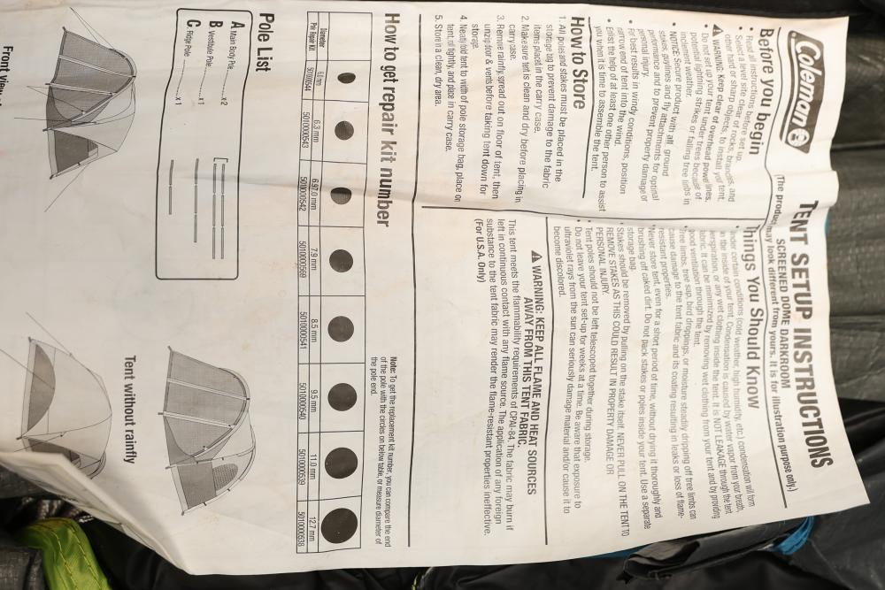 Coleman Screened Dome Darkroom Tent Kit and Oaskys 3 Season Sleeping Bag in Pink and Purple. Includes a Coleman tent with setup instructions and a pink sleeping bag. Tent bag shows Coleman logo and red handles, while sleeping bag features specifications for materials, size, and temperature range. Pickup only.