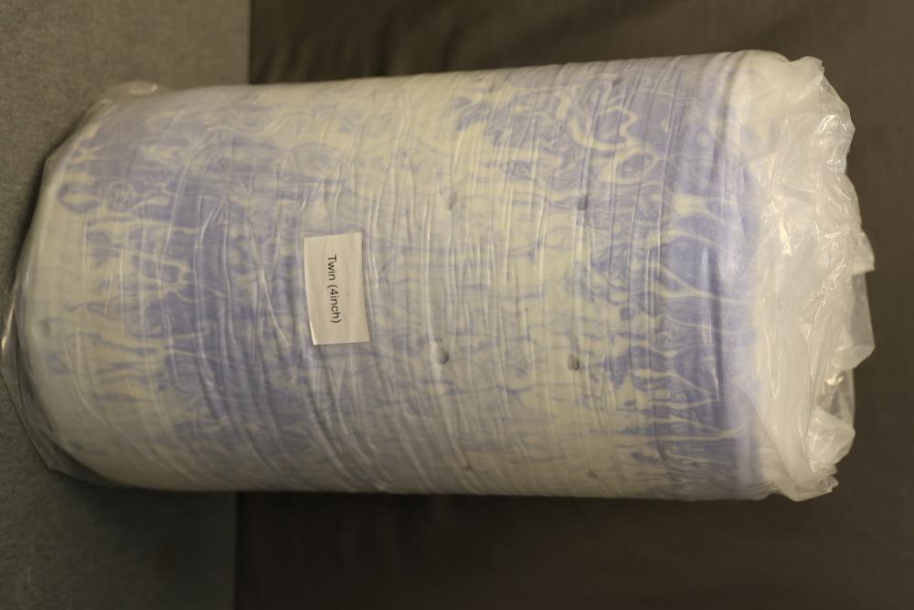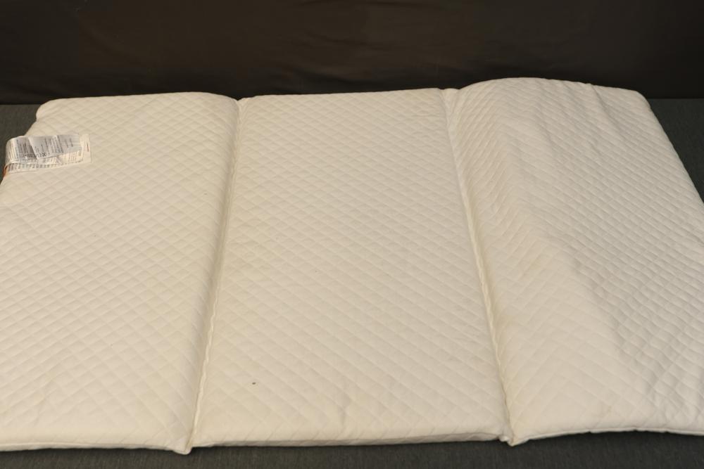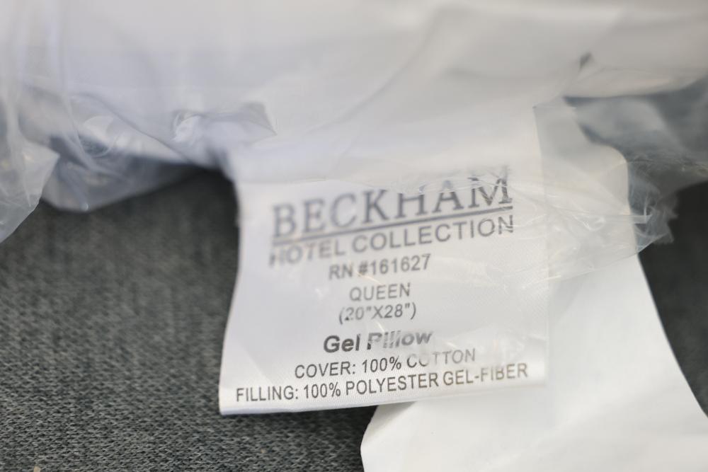 Bedding Package Featuring Pillows, Memory Foam Topper, Portable Foam Pad, and Storage Bags. Includes 2 Beckham Hotel Collection Gel Pillows in King Size (1 not in packaging), 1 Oeko-Tex Standard 100 Pillow(not in packaging), 3 Beckham Hotel Collection Down Alternative Pillows, 1 Beckham Hotel Collection Gel Pillow in Queen Size, 1 Perlecare 4-Inch Memory Foam Mattress Topper in Purple, 1 Contour Legacy Leg and Knee Memory Foam Side Sleeper Support Pillow (not in packaging), 1 Pack and Play Tri-Fold Portable Foam Pad (not in packaging), and 1 Package of Vacuum Bags for Bedding Storage size 100 cm by 130 cm. Pickup only.