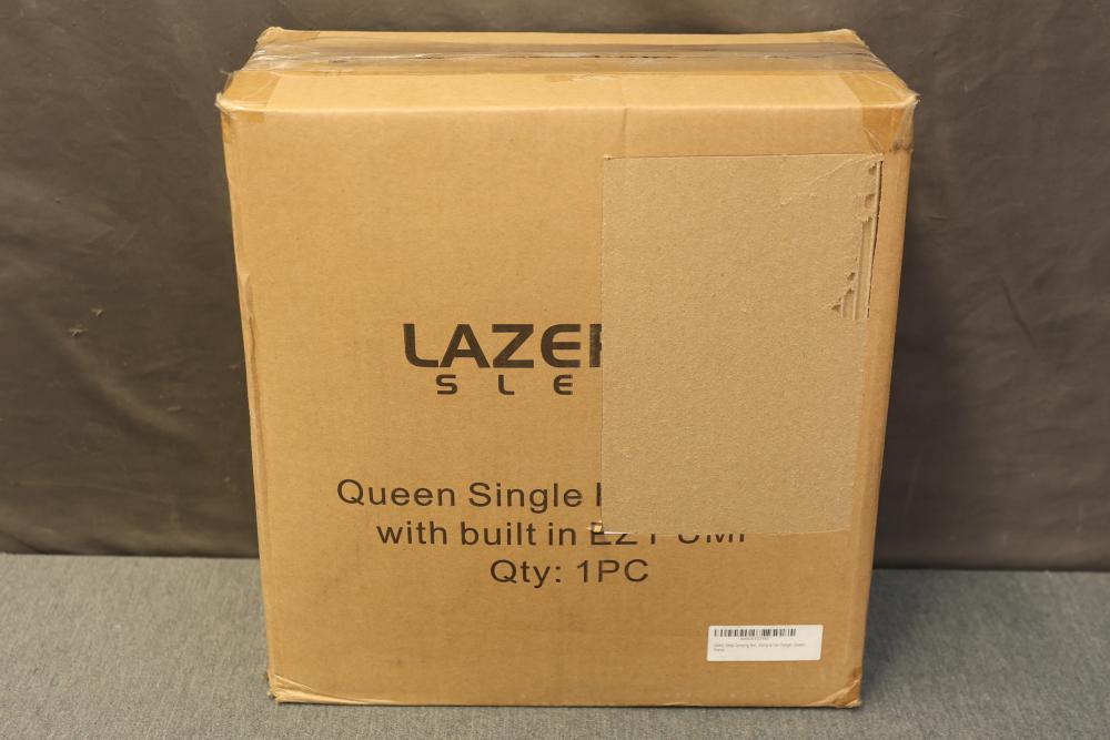 Lazery Sleep Queen Size Air Mattress with Built-In Electric Pump. Features a built-in electric pump for easy inflation and deflation. Comes in the original packaging with storage bag included. Designed with a red upper sleeping surface and beige sides. Suitable for home use or travel, offering convenience and comfort. Pickup only.