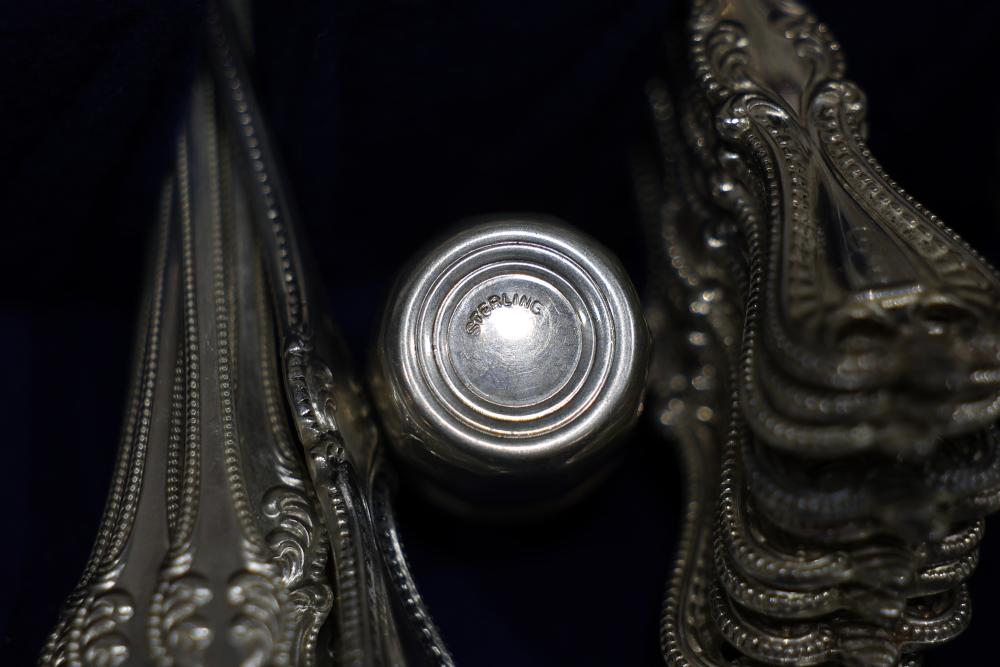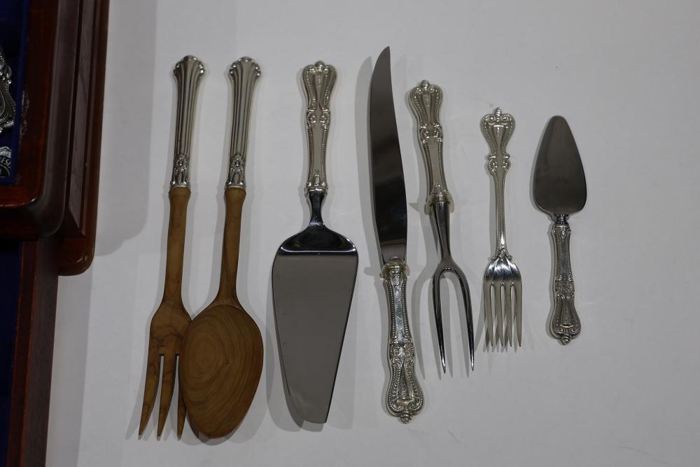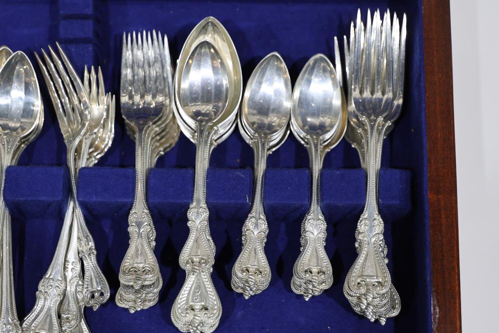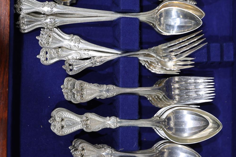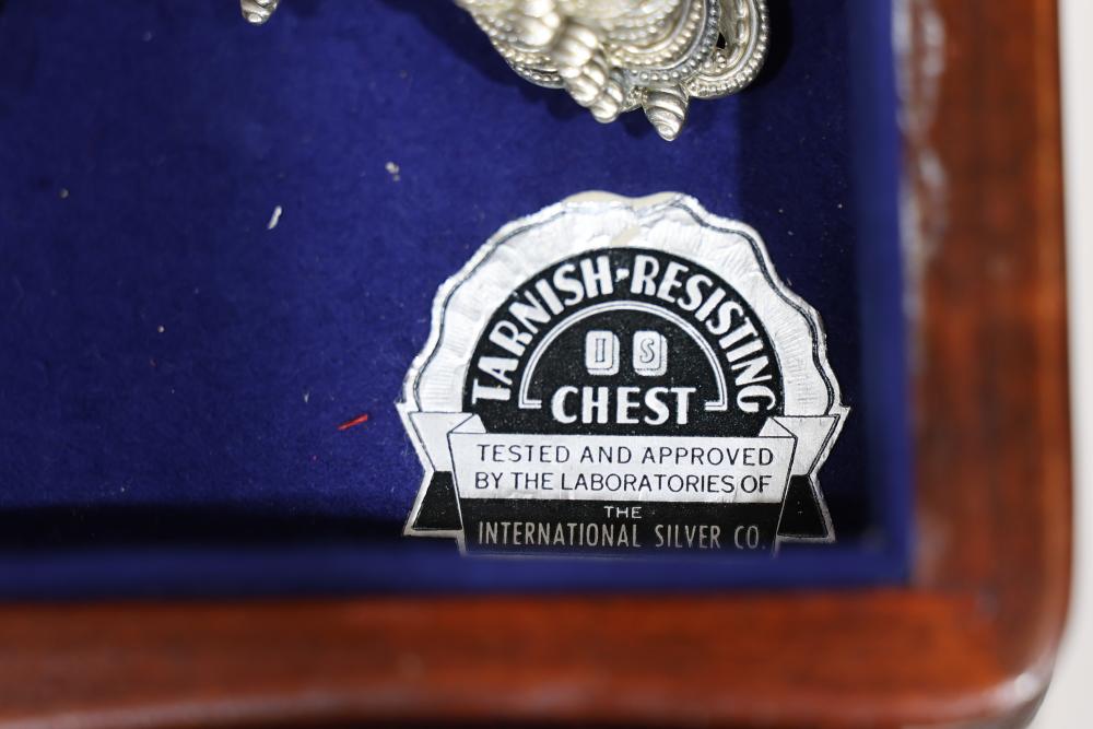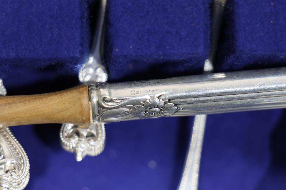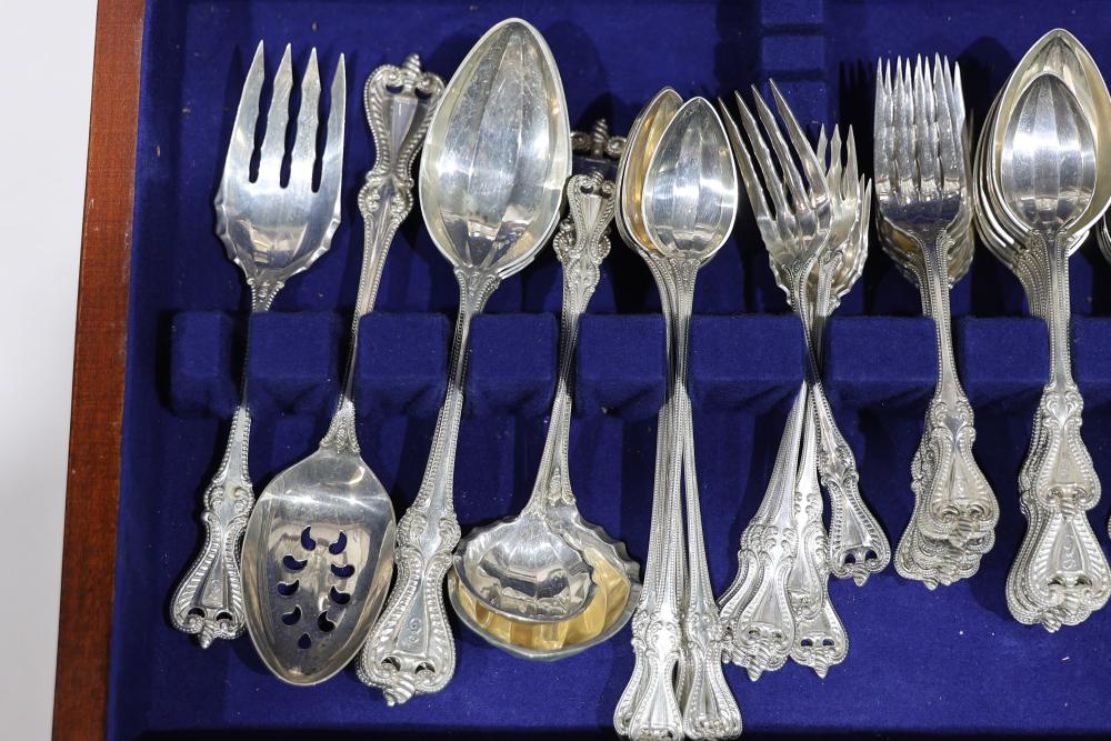 Sterling Silver Flatware Set in Tarnish-Resistant Chest. Includes 8 knives, 1 spoon, 1 butter knife, 2 cocktail forks, 1 meat fork, 1 knife, 1 wooden spoon, 1 wooden fork, 1 meat fork, 1 slotted spoon, 4 large serving spoons, 1 large laddle, 1 small laddle, 8 ice tea spoons, 6 cocktail forks, 10 dessert/cake forks, 8 tablespoons, 16 teaspoons, 9 dinner forks, 1 cake server, 1 cheese server, 3 salt & pepper shakers, 1 large serving spoon, 8 butter knives, 4 demi tass spoons, 1 ice tea spoon, and 1 small serving spoon. Sterling weight is 3,198 grams. Total weight is 4,176 grams.