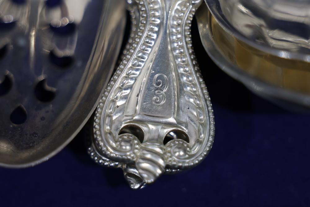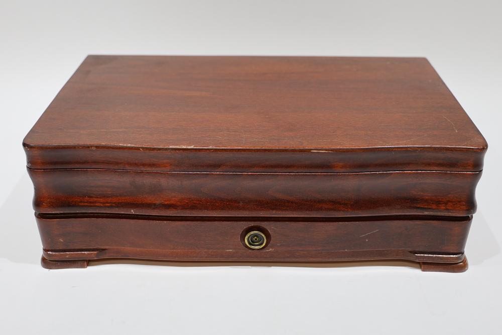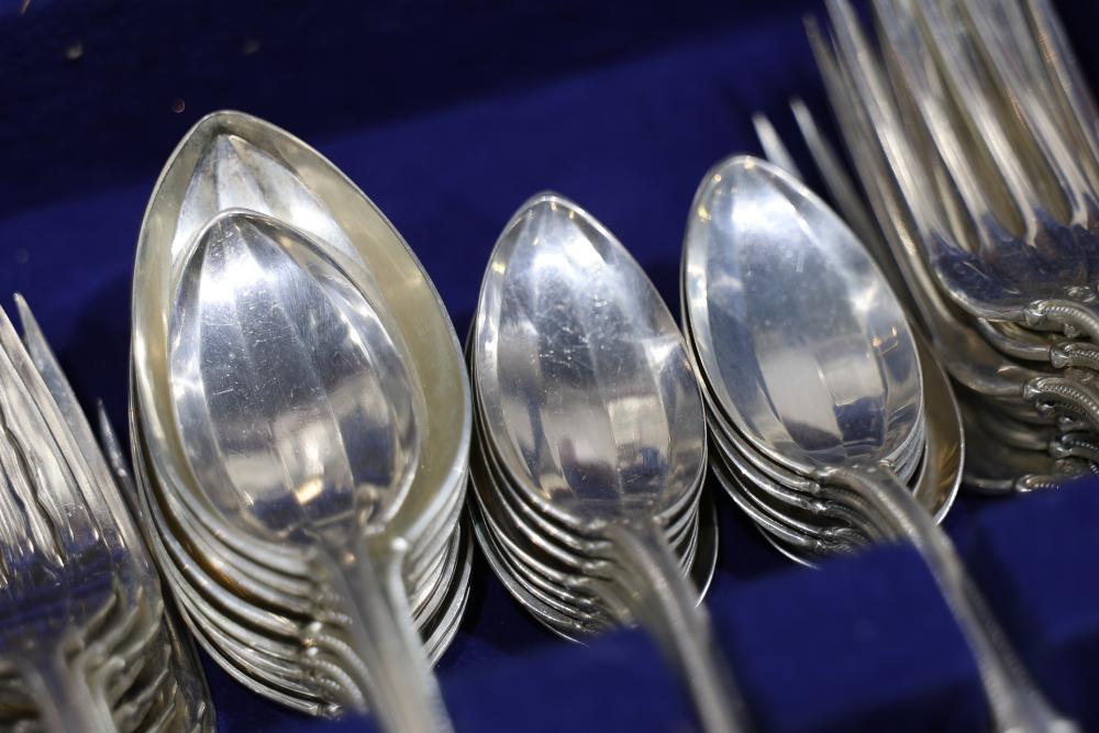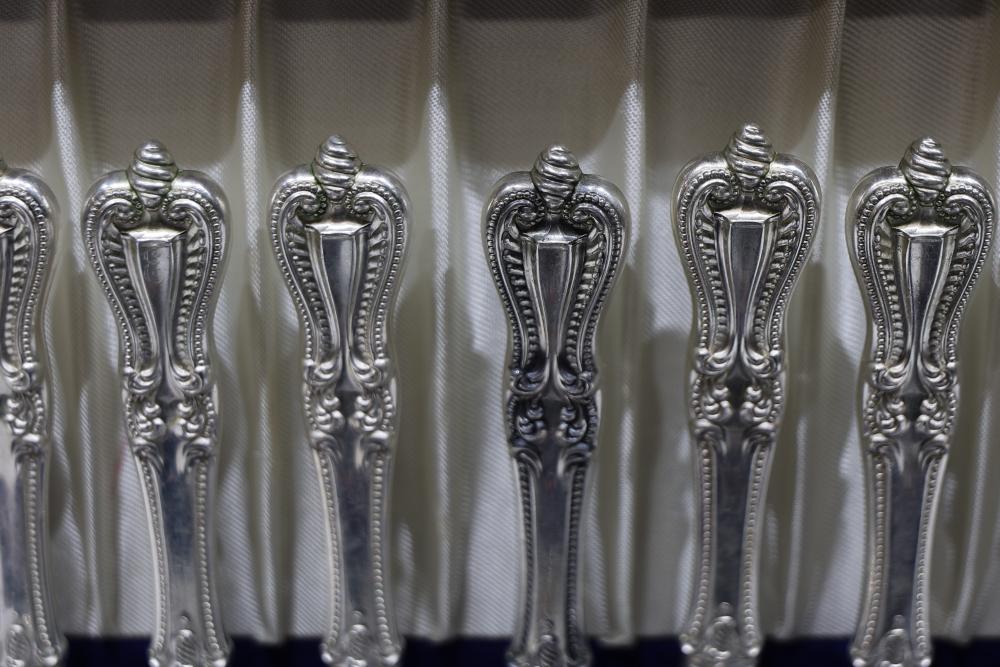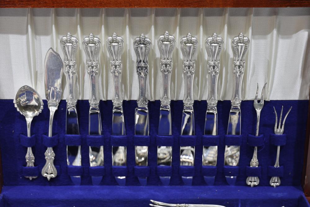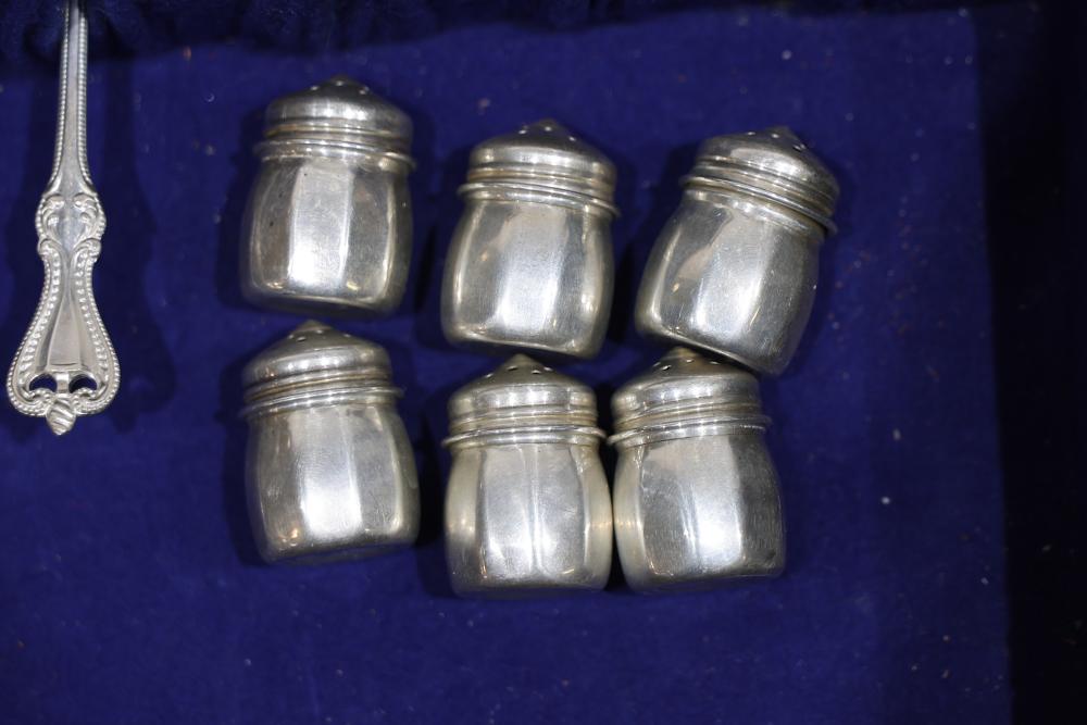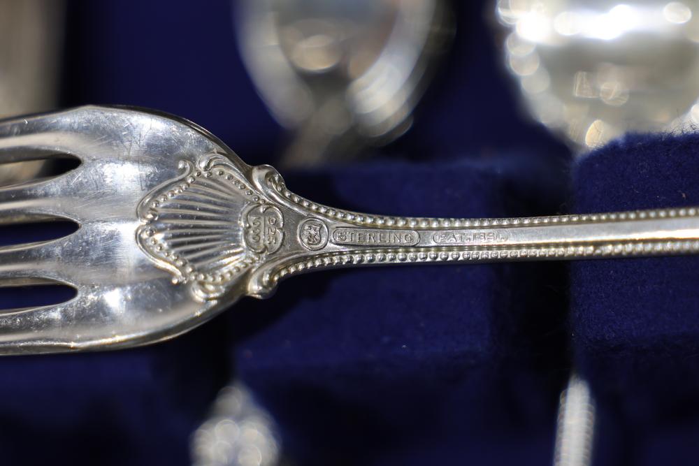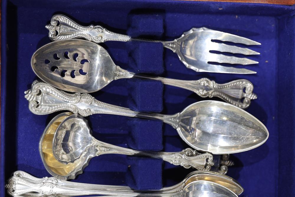 Sterling Silver Flatware Set in Tarnish-Resistant Chest. Includes 8 knives, 1 spoon, 1 butter knife, 2 cocktail forks, 1 meat fork, 1 knife, 1 wooden spoon, 1 wooden fork, 1 meat fork, 1 slotted spoon, 4 large serving spoons, 1 large laddle, 1 small laddle, 8 ice tea spoons, 6 cocktail forks, 10 dessert/cake forks, 8 tablespoons, 16 teaspoons, 9 dinner forks, 1 cake server, 1 cheese server, 3 salt & pepper shakers, 1 large serving spoon, 8 butter knives, 4 demi tass spoons, 1 ice tea spoon, and 1 small serving spoon. Sterling weight is 3,198 grams. Total weight is 4,176 grams.