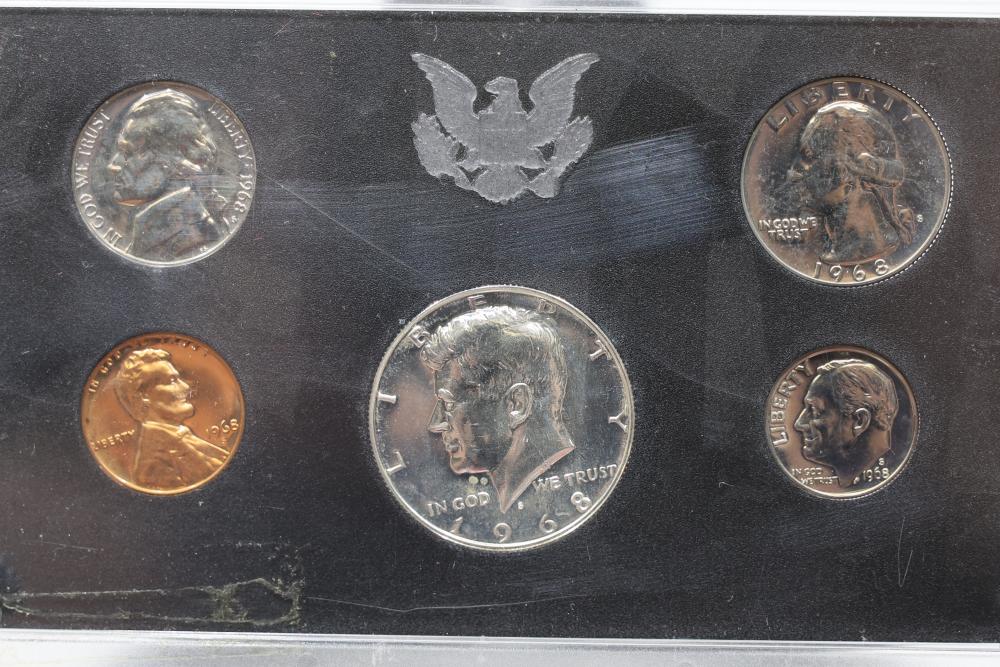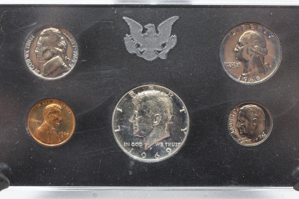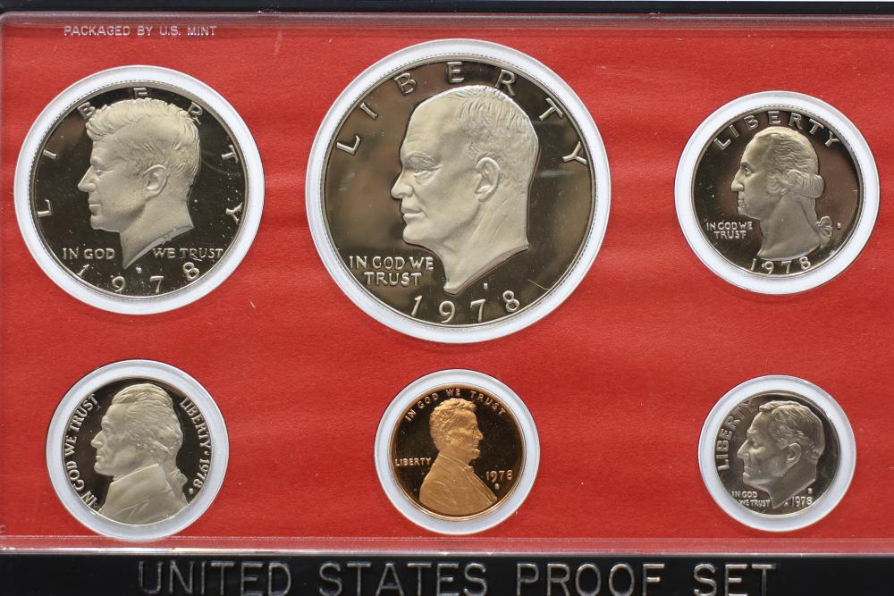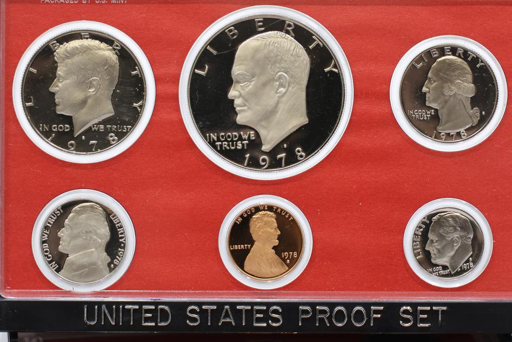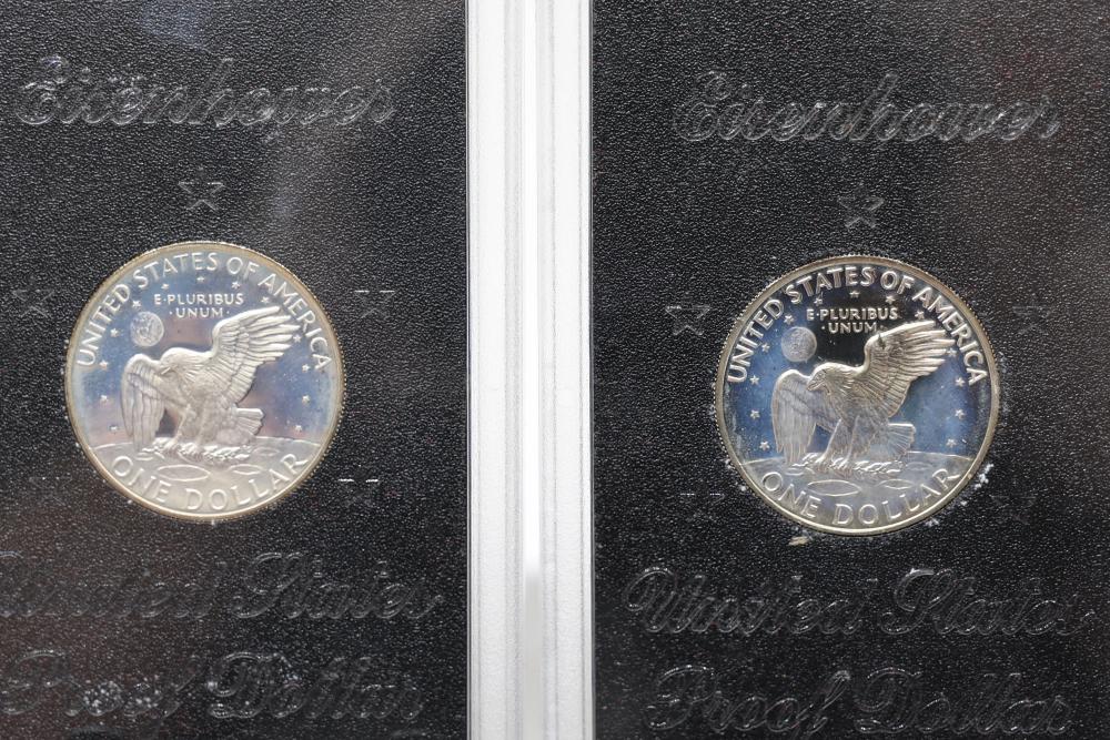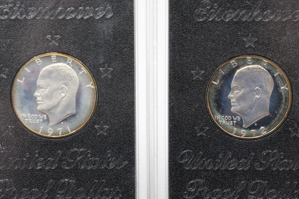 Proof Coin Sets and Two Eisenhower Dollar Coins with years including 1968, 1969, 1970, 1971, 1972, 1973, 1974, 1975, 1976, 1977, 1978, 1979, 1980, 1981, and 1982.