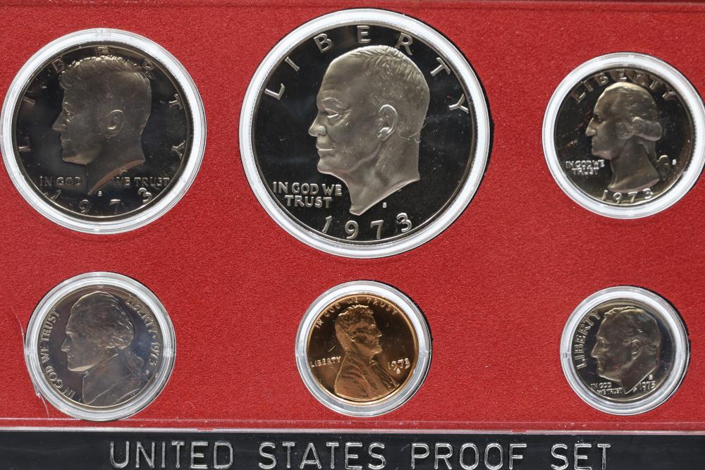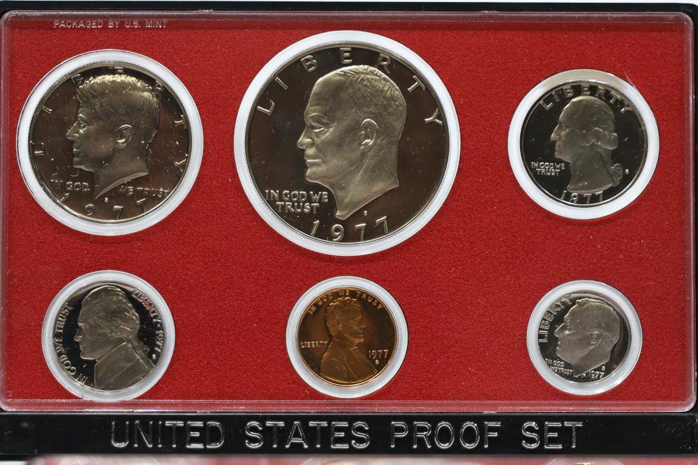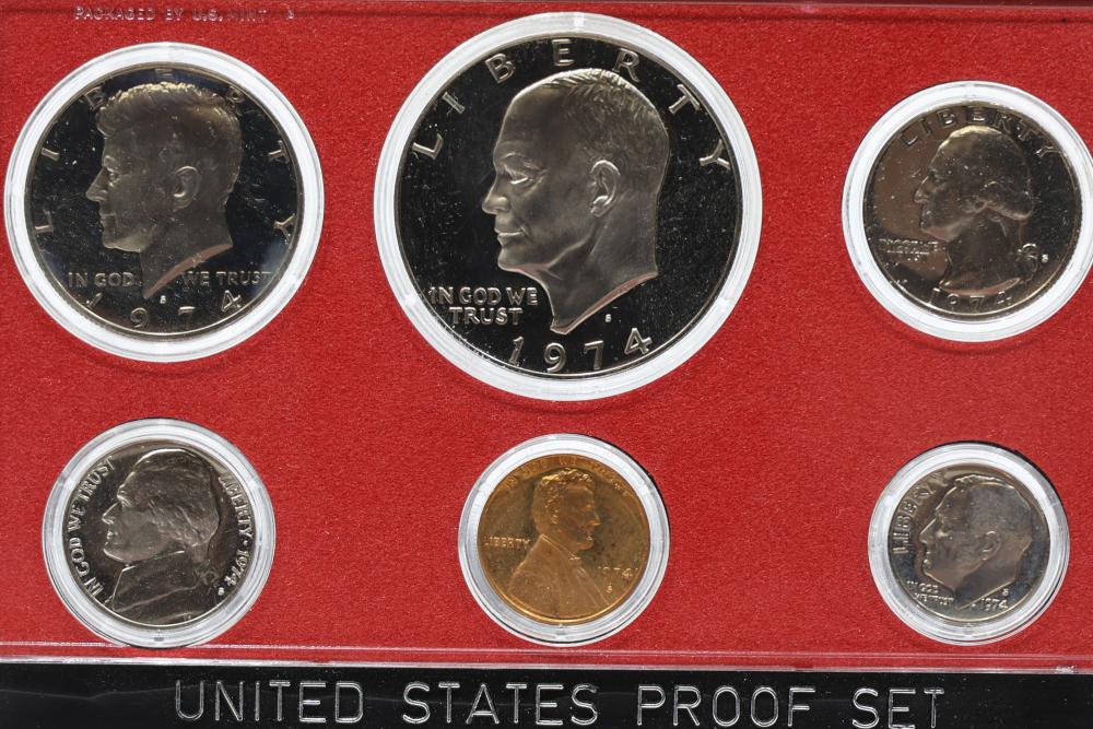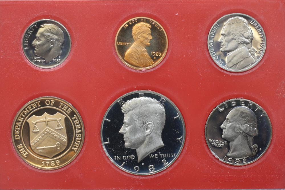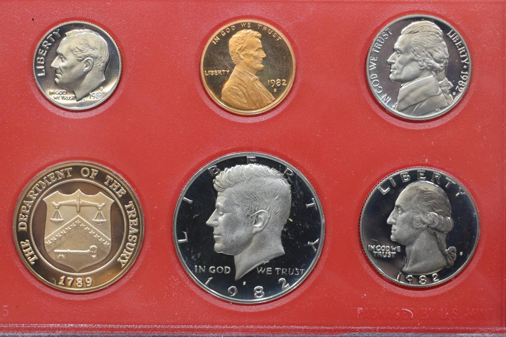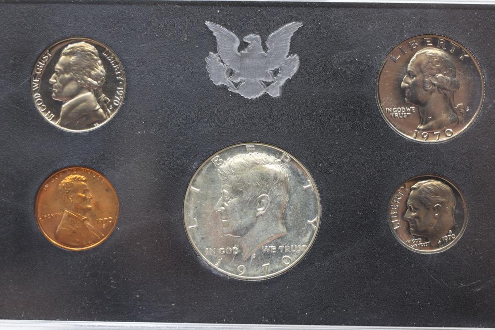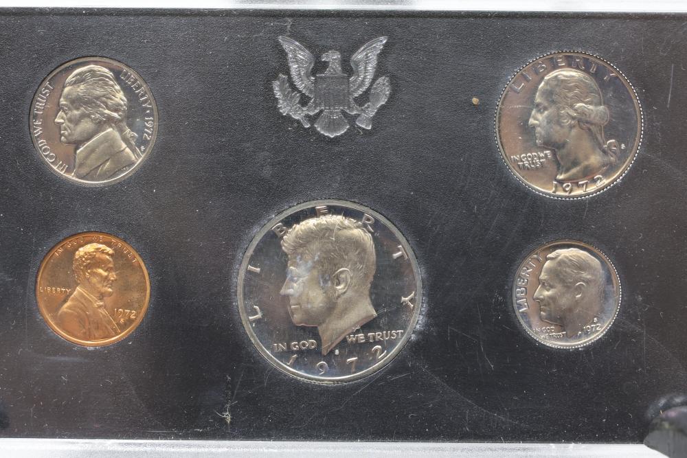 Proof Coin Sets and Two Eisenhower Dollar Coins with years including 1968, 1969, 1970, 1971, 1972, 1973, 1974, 1975, 1976, 1977, 1978, 1979, 1980, 1981, and 1982.