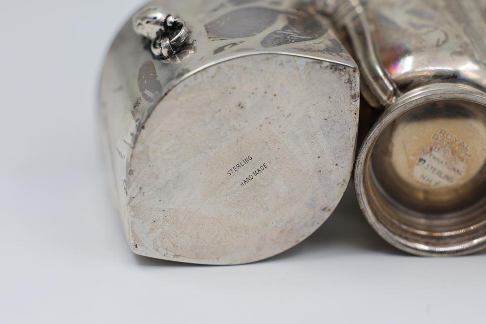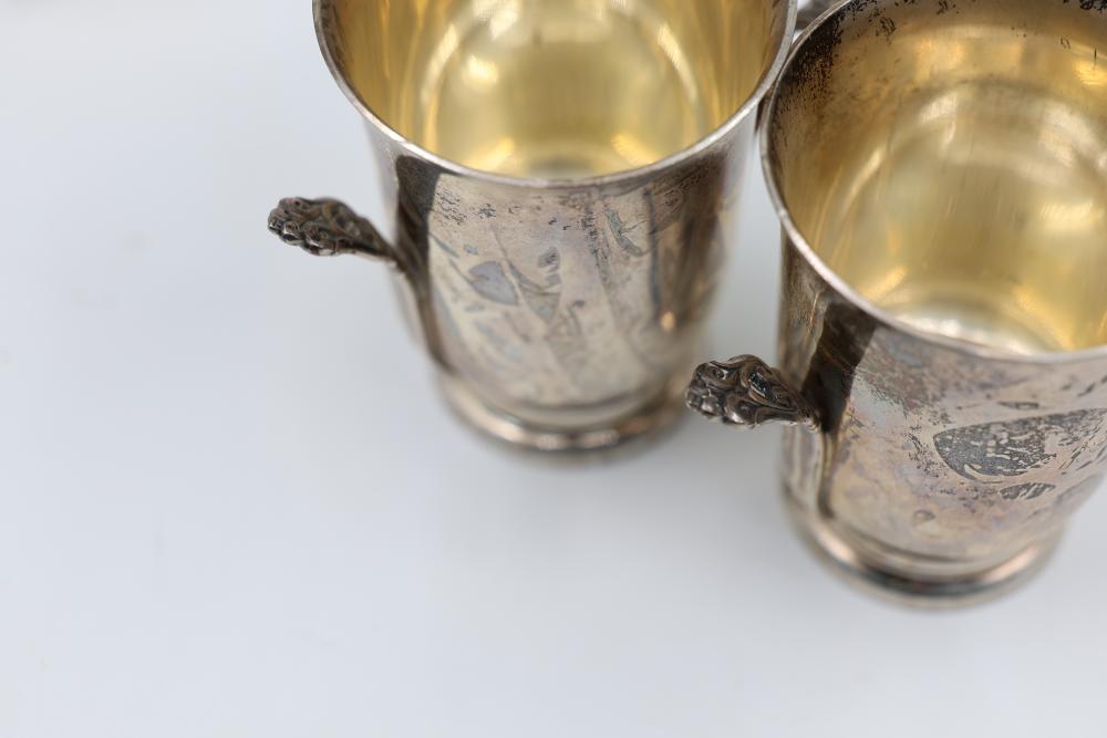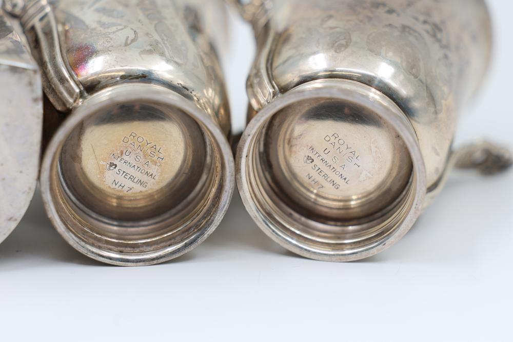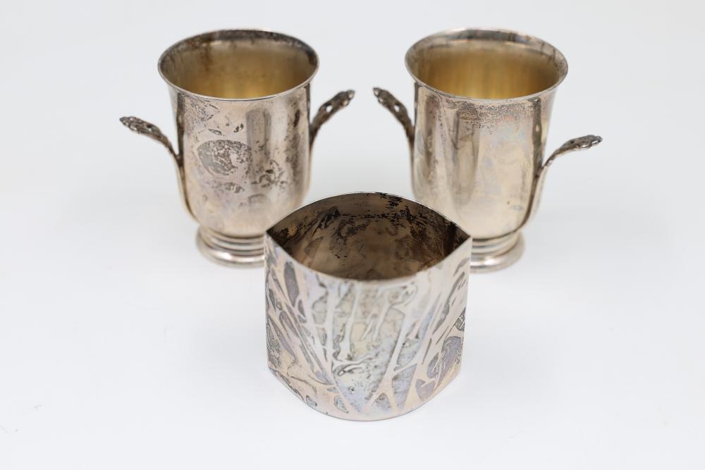 Sterling Silver Stamped Goblets and Napkin Ring Set. Includes two goblets engraved with a decorative pattern and two handles on each, and one napkin ring featuring an applied small decorative detail. Stamped Sterling on the base. Total weight being 305 grams.