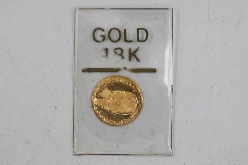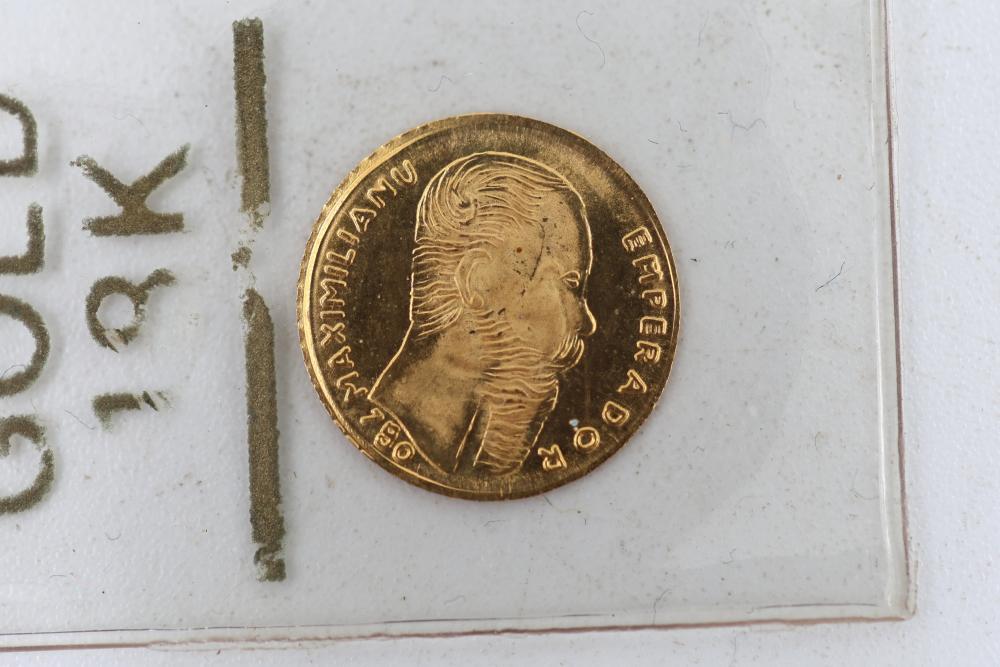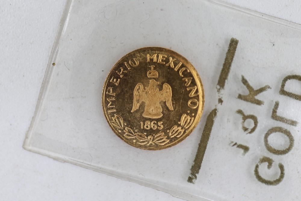 18k Gold Coin Emprerador Maxamillion 1865 Imperio Mexicano. This coin is composed of 18k gold and features the markings related to Emperor Maximilian I of Mexico from the year 1865 during the Second Mexican Empire.