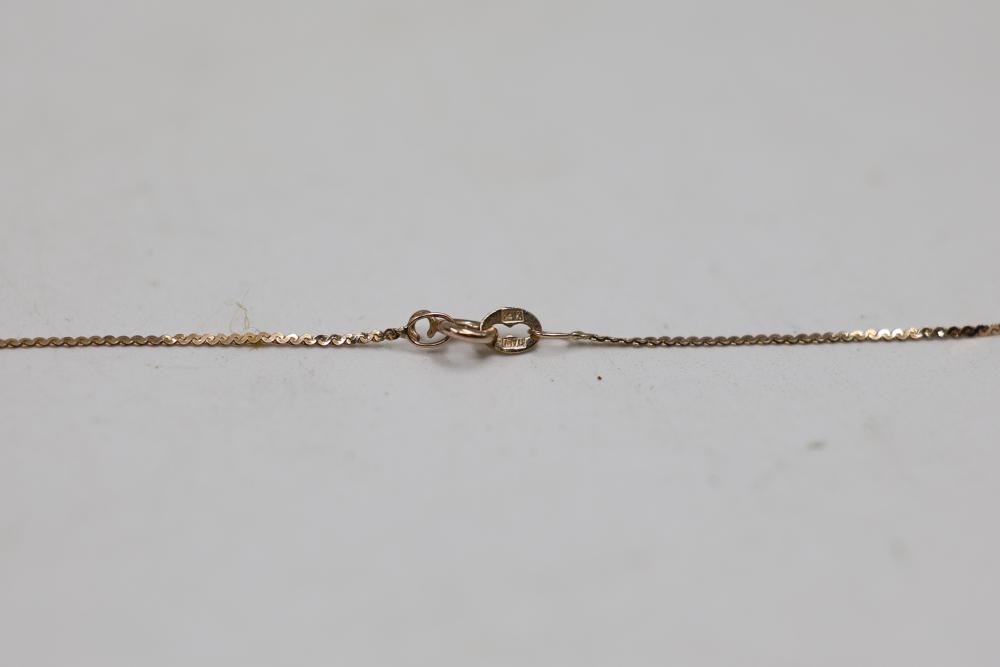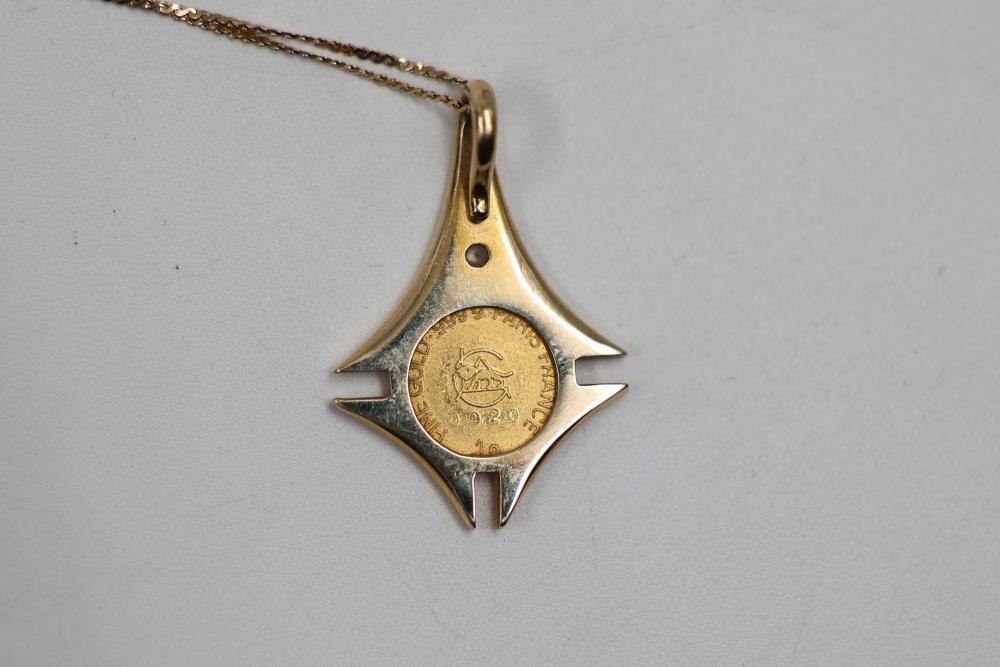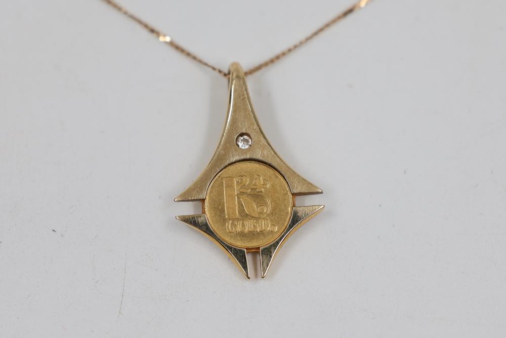 14k Stamped Gold Pendant necklace with Gold Coin Stamped "Fine Gold .999" and diamond accent. Features a thin gold chain with a lobster clasp and a pendant that includes an inset coin and a small diamond-like stone at the top. Total weight being 6 grams.