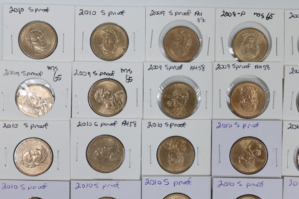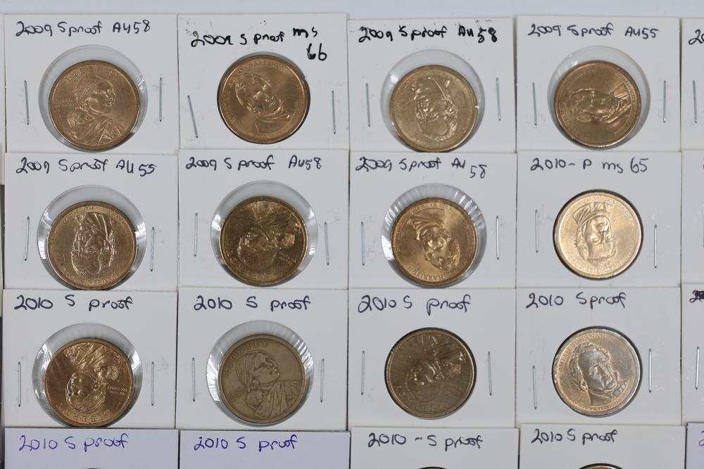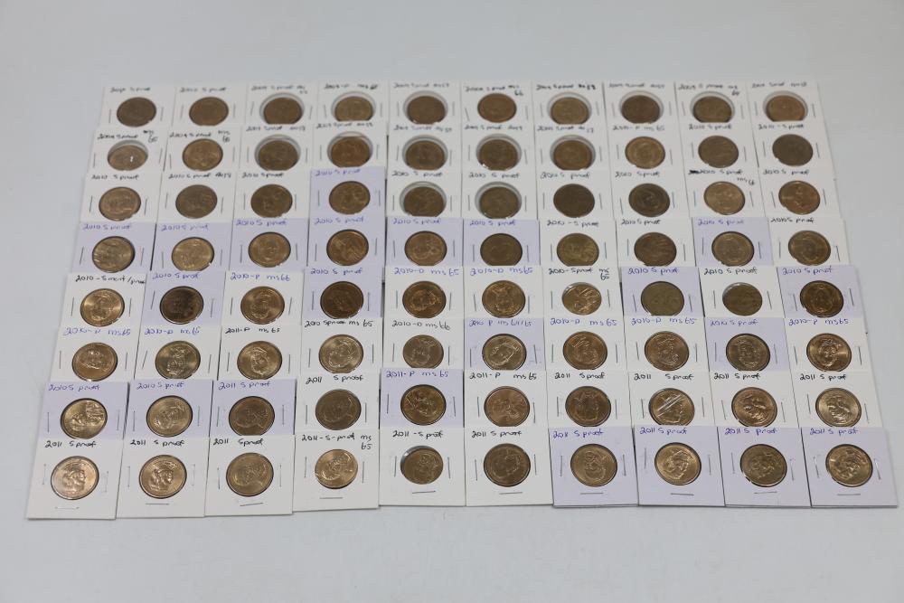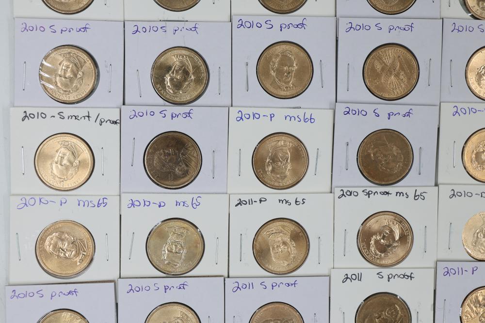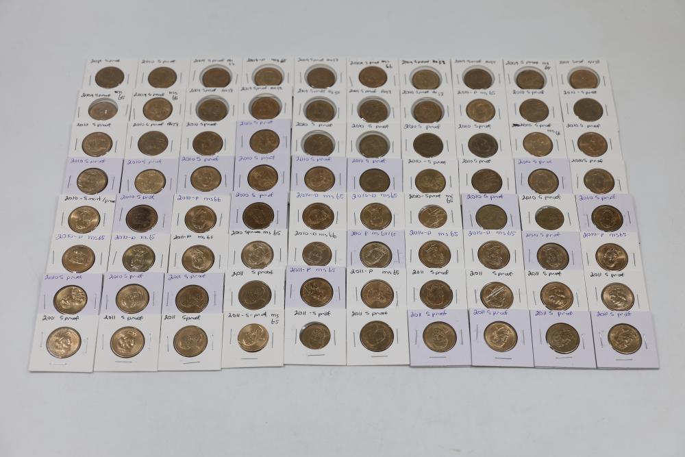 U.S. $1 Commemorative Presidential Dollars from years such as 2009, 2010, and 2011 in variable conditions. 80 coins in total.