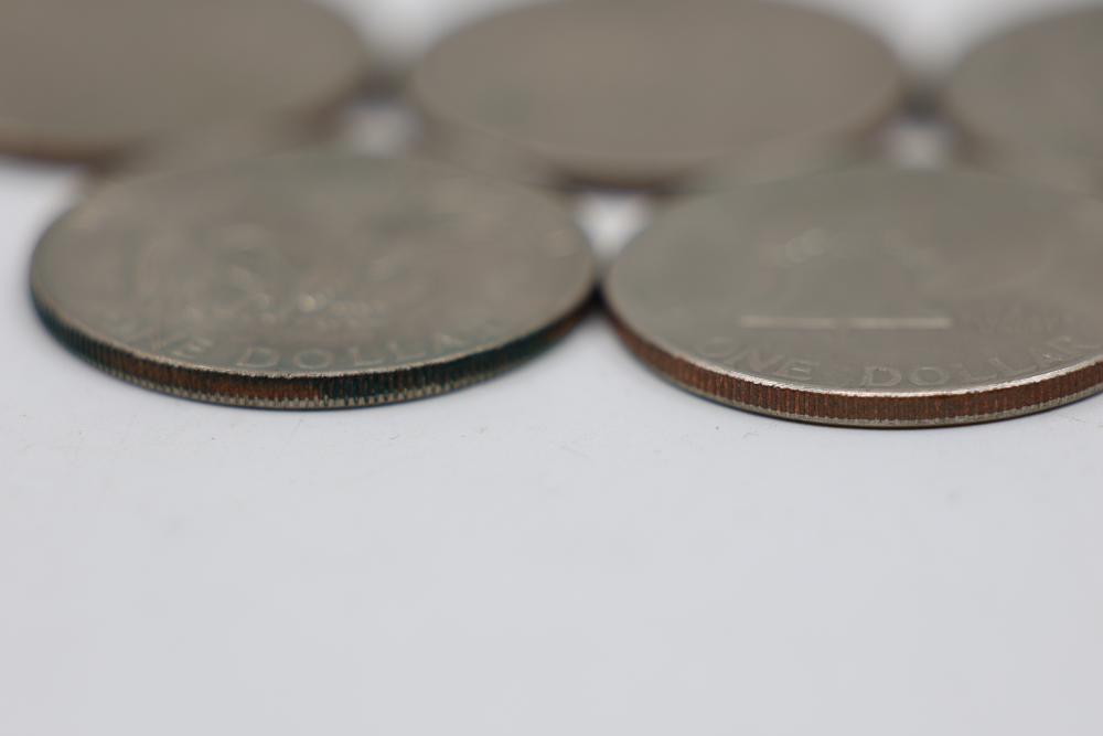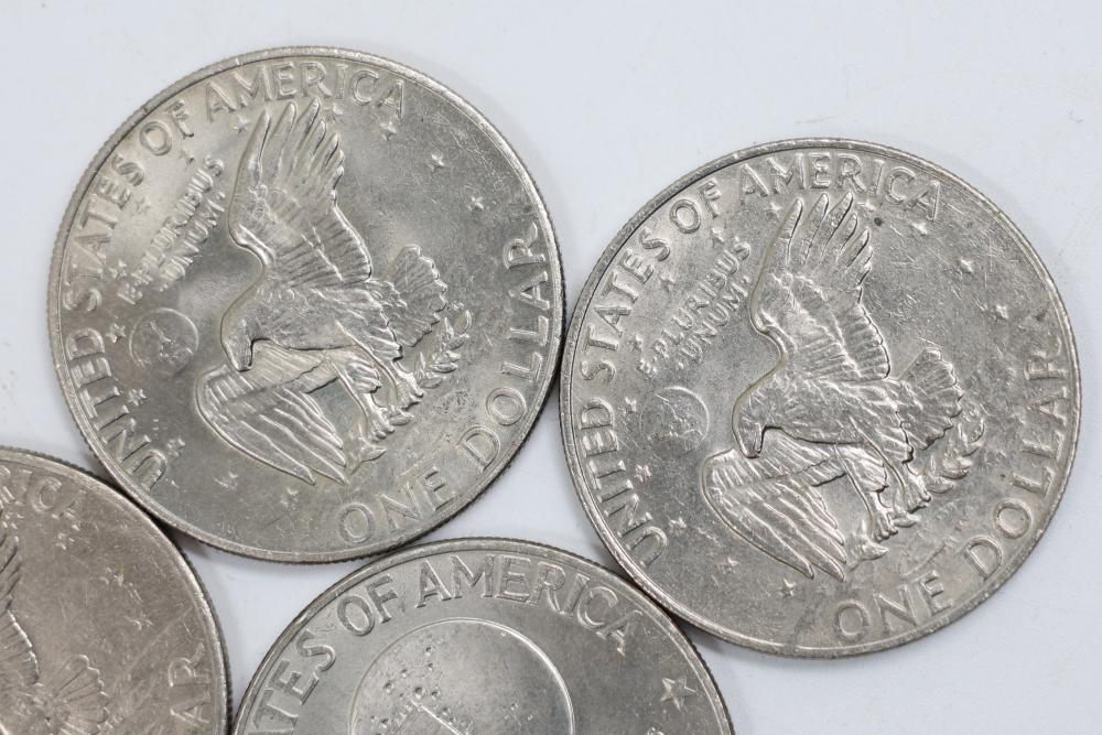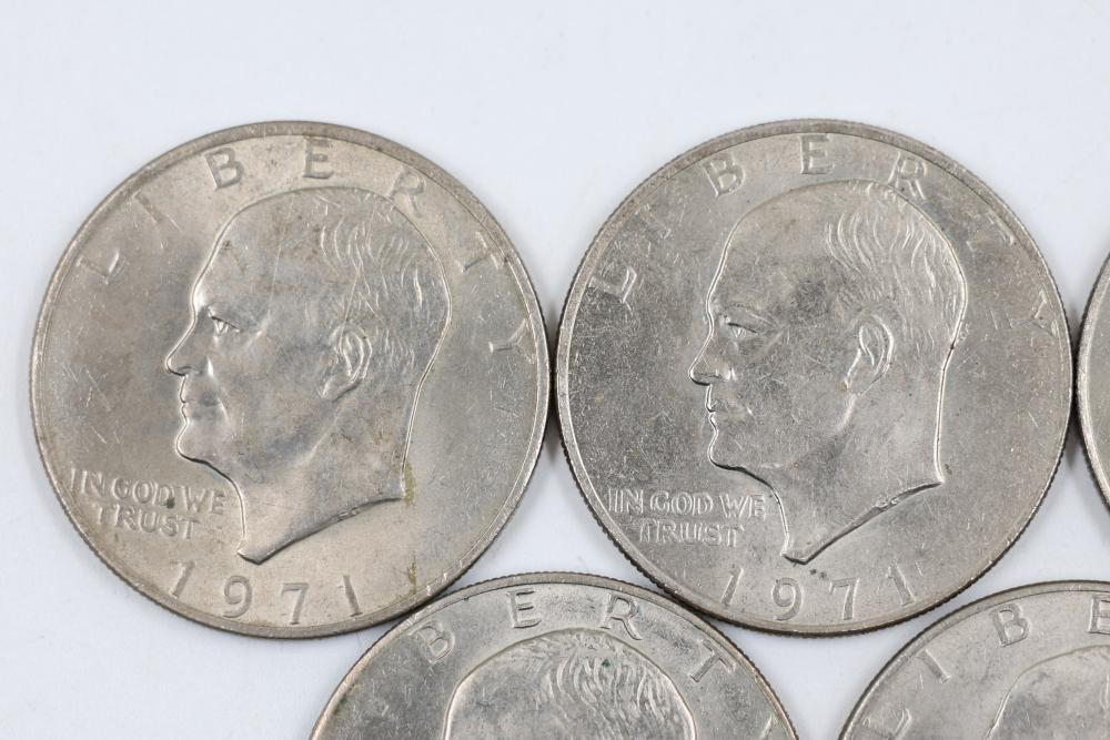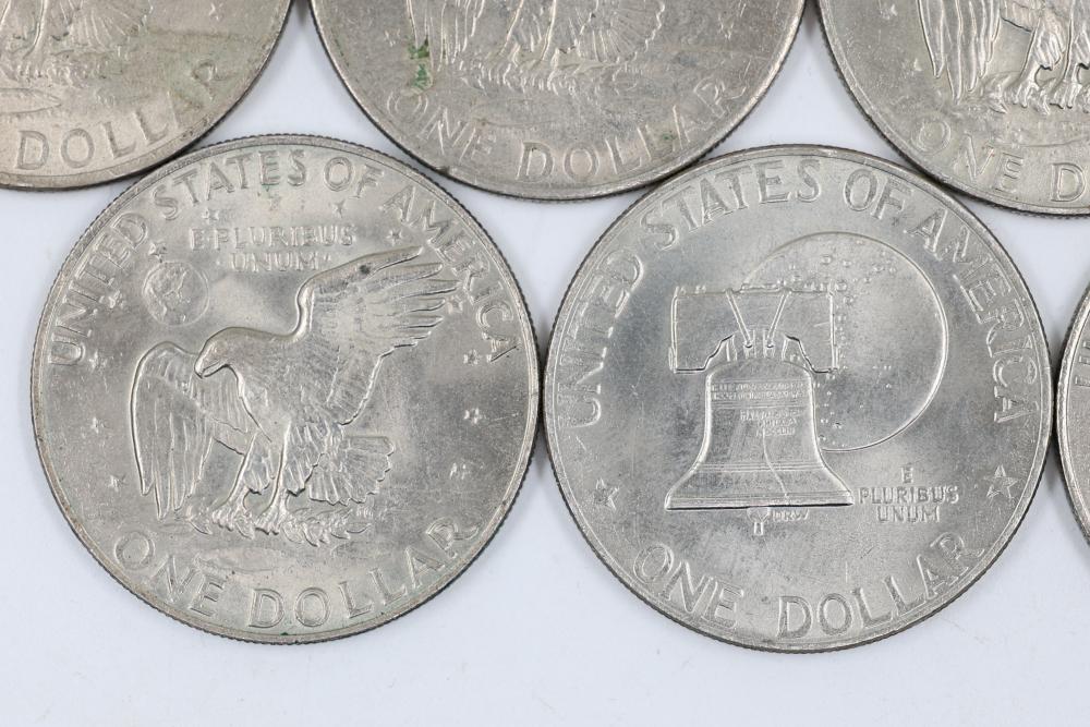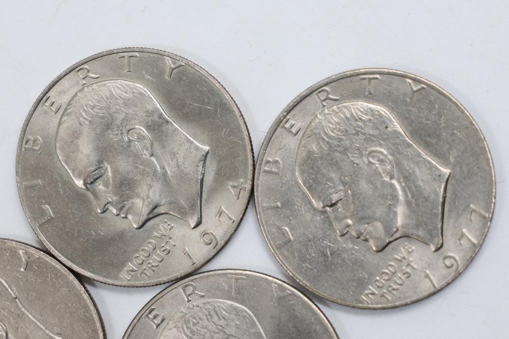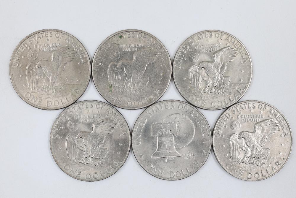 Six Eisenhower One Dollar Coins featuring dates 1971, 1974, and bicentennial year 1976.