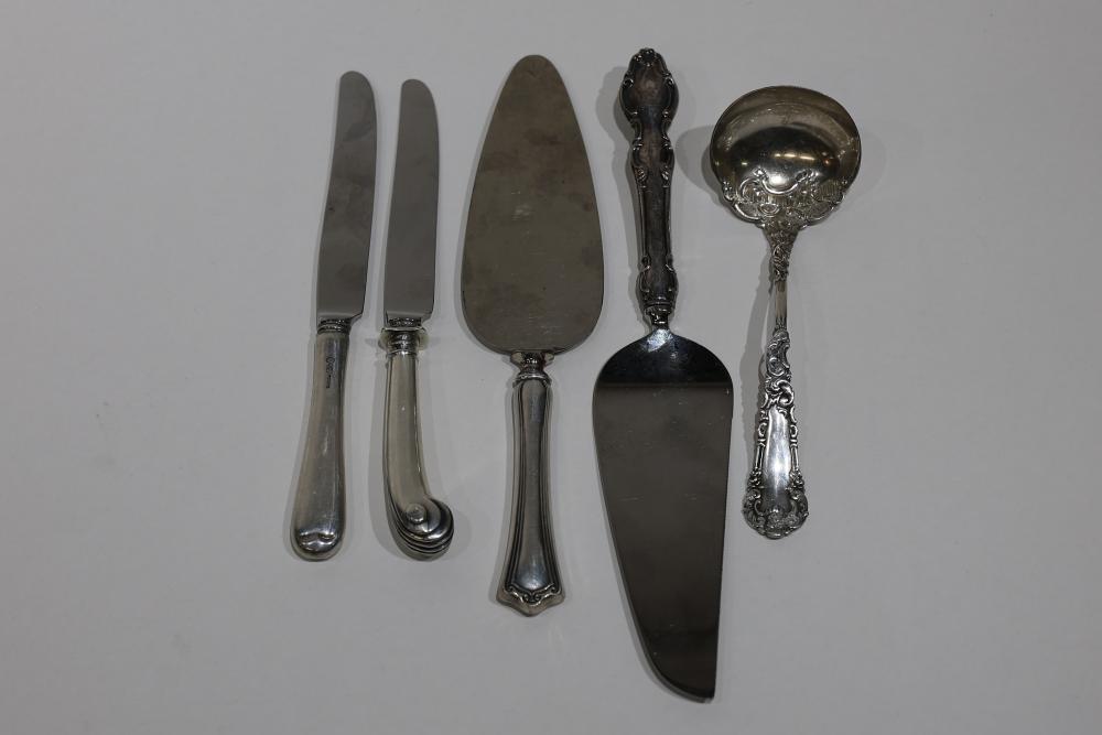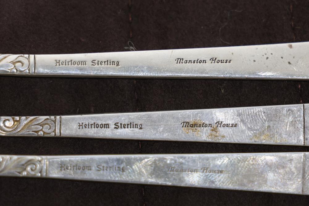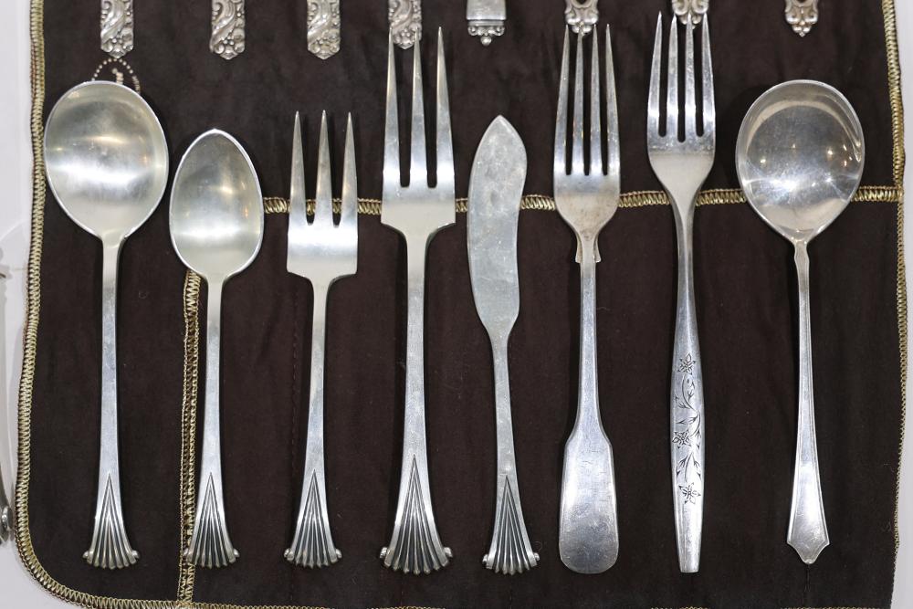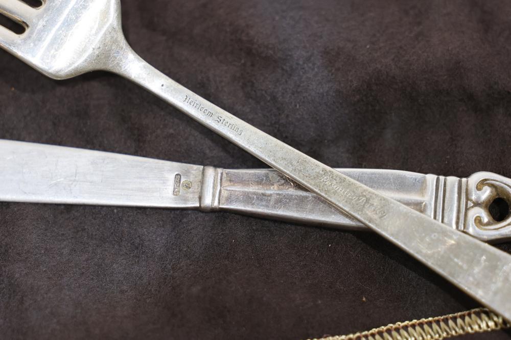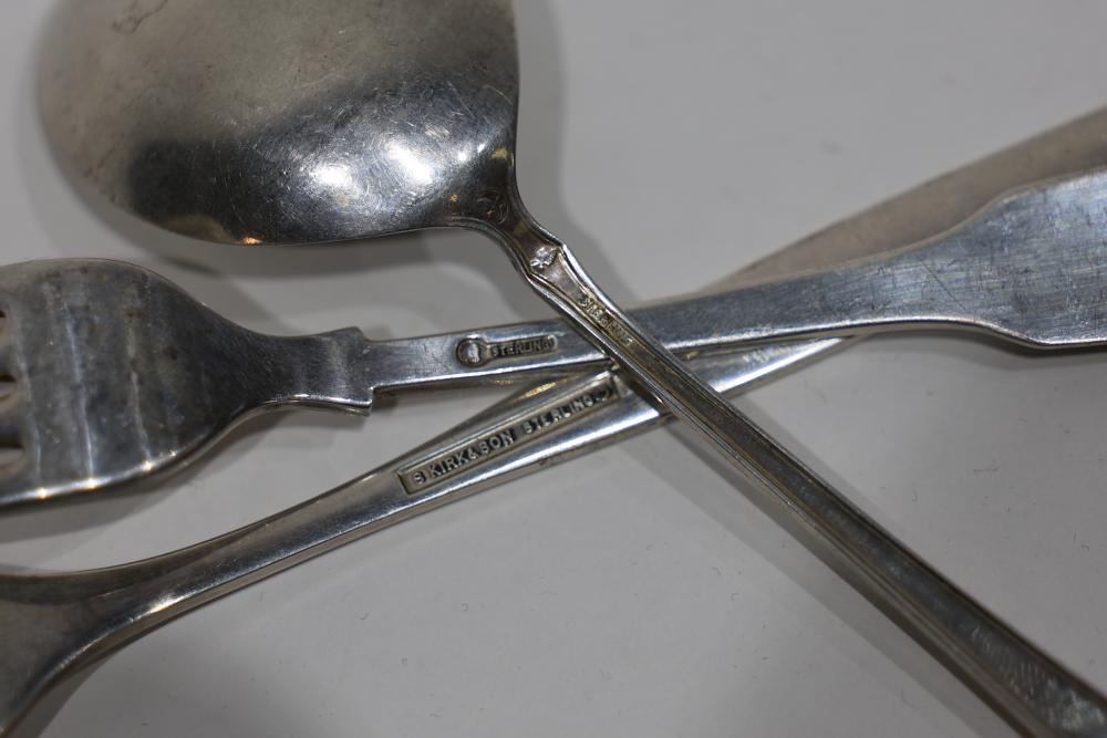 Sterling Silver Flatware and Serving Utensils featuring mixed patterns with items from brands including Heirloom, WM Rogers, and S. Kirk & Son. The collection includes forks, knives, spoons, and serving pieces. Some items display hallmarks and inscriptions. Total weight being 750 grams.