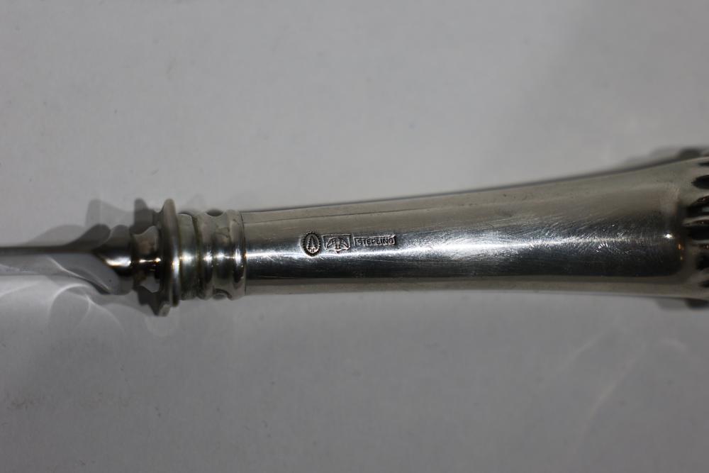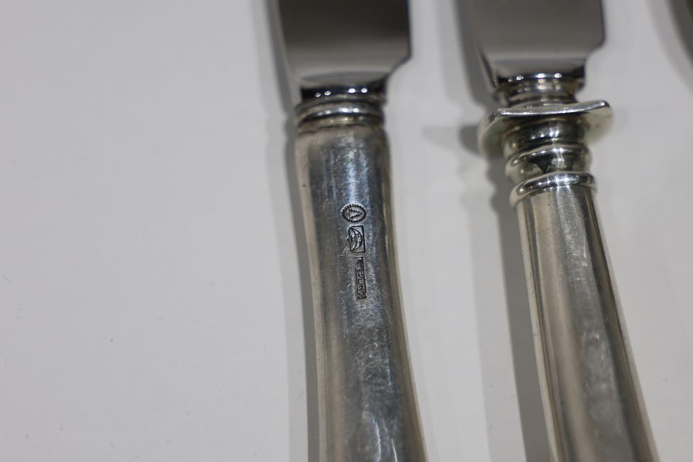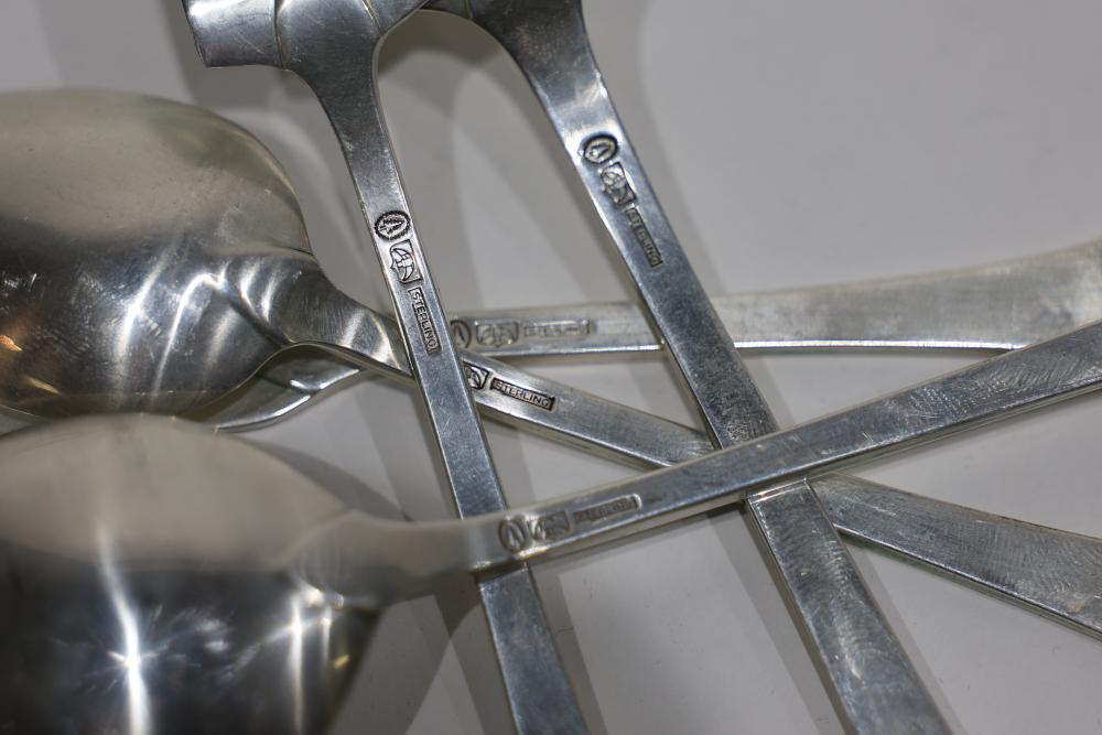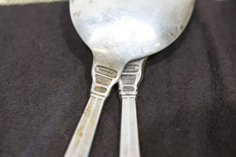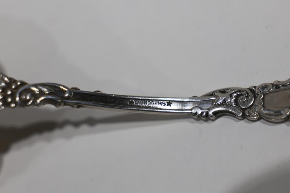 Sterling Silver Flatware and Serving Utensils featuring mixed patterns with items from brands including Heirloom, WM Rogers, and S. Kirk & Son. The collection includes forks, knives, spoons, and serving pieces. Some items display hallmarks and inscriptions. Total weight being 750 grams.