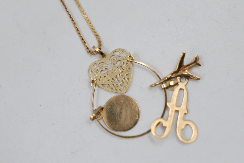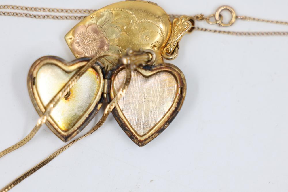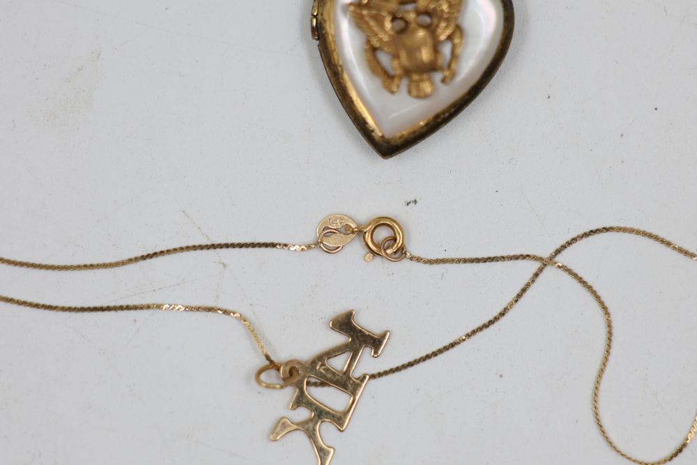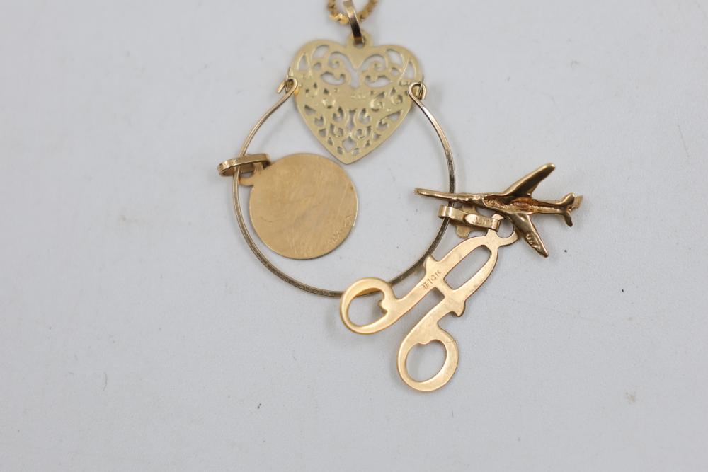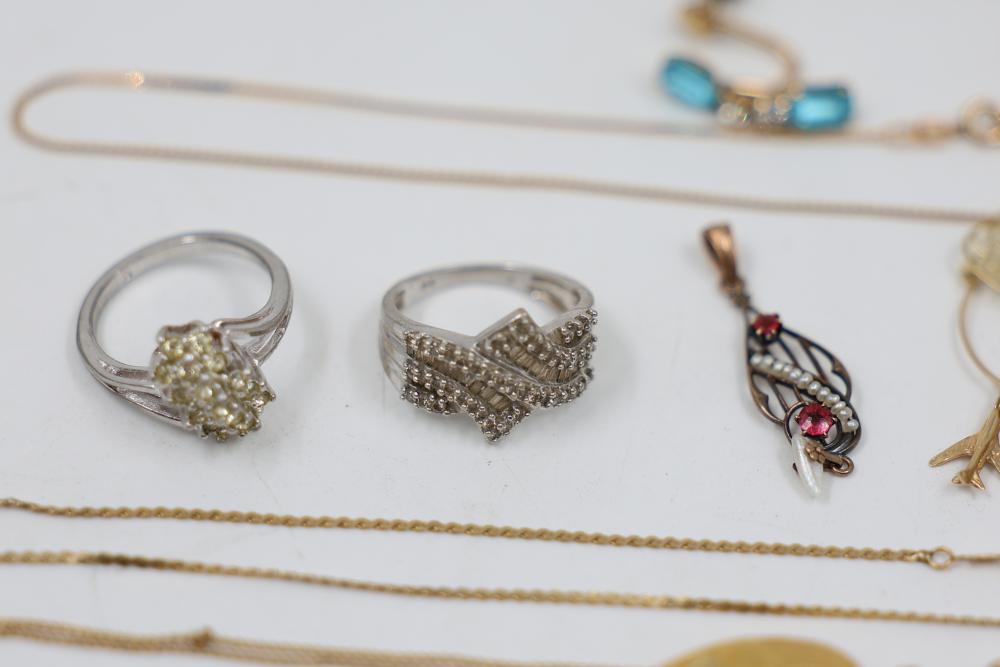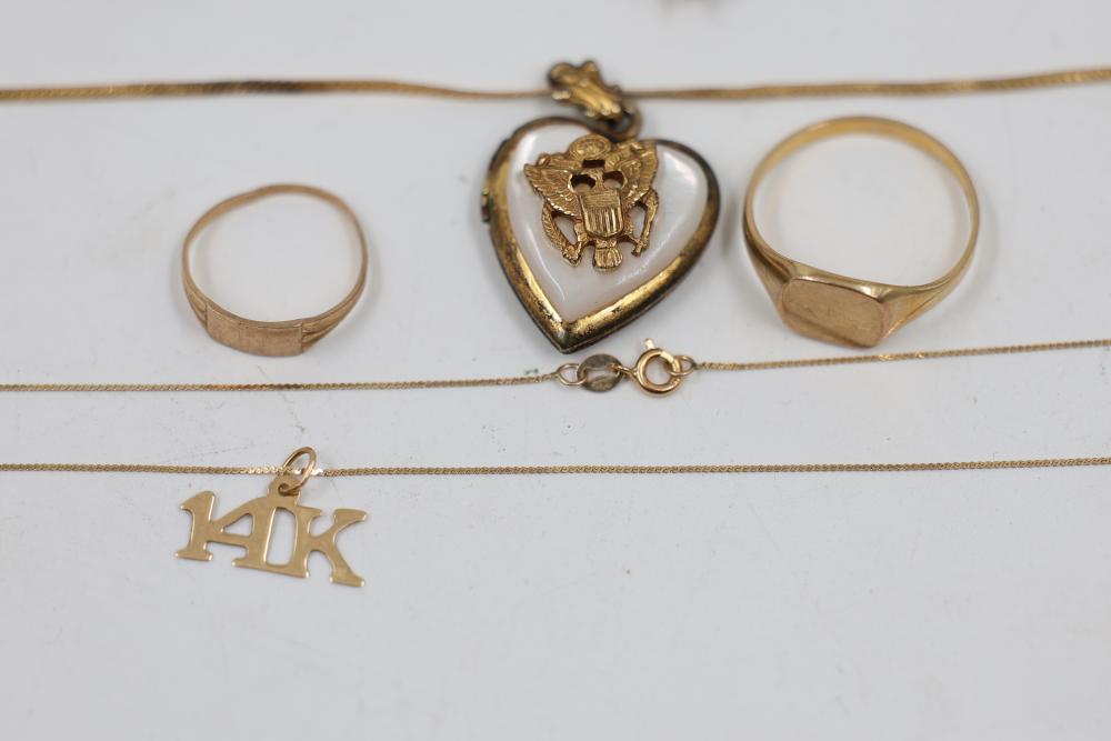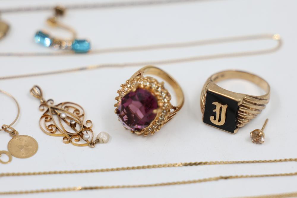 Gold and Silver Jewelry including multiple gold chains, rings featuring gemstones, gold lockets, and earrings with blue accents. Various items are Stamped as 10K and 14K gold. Gold weight is 20 grams. Total weight being 55 grams.