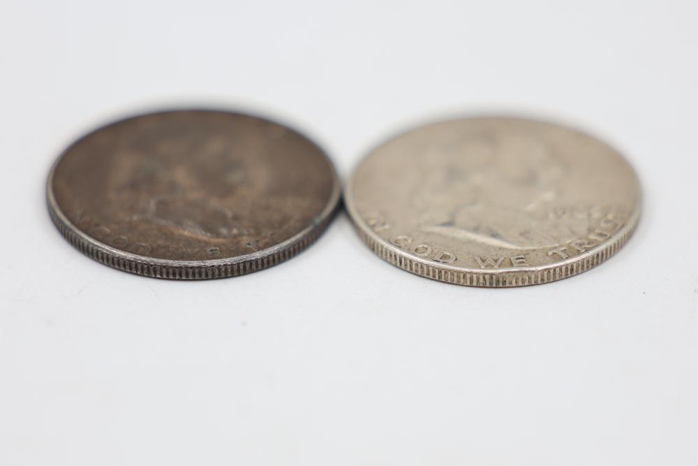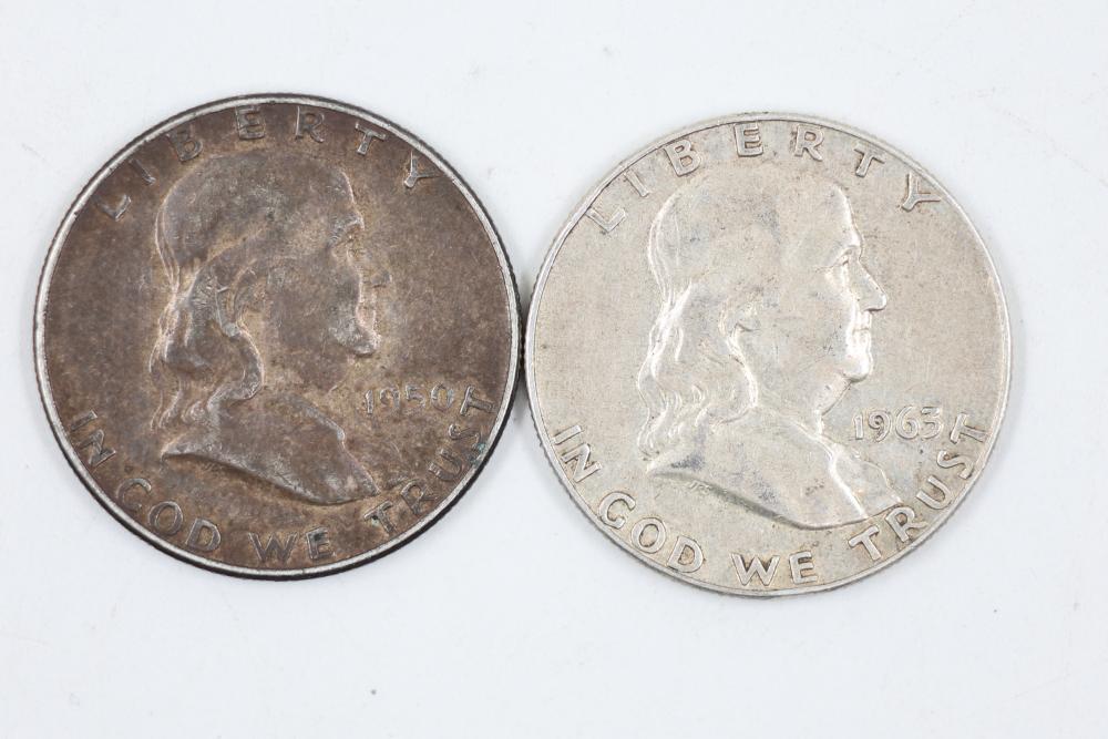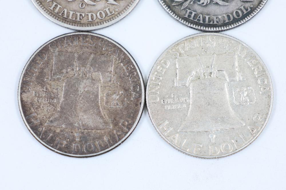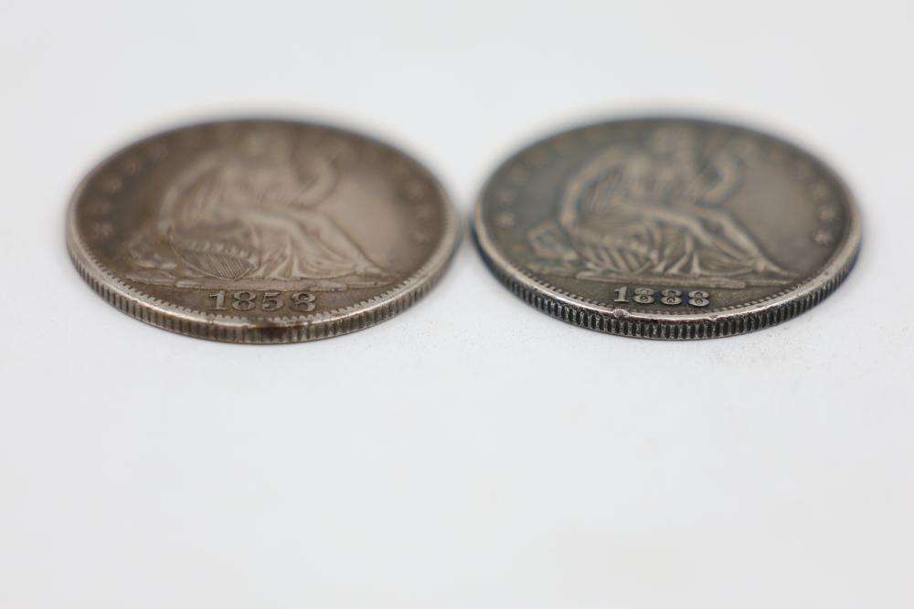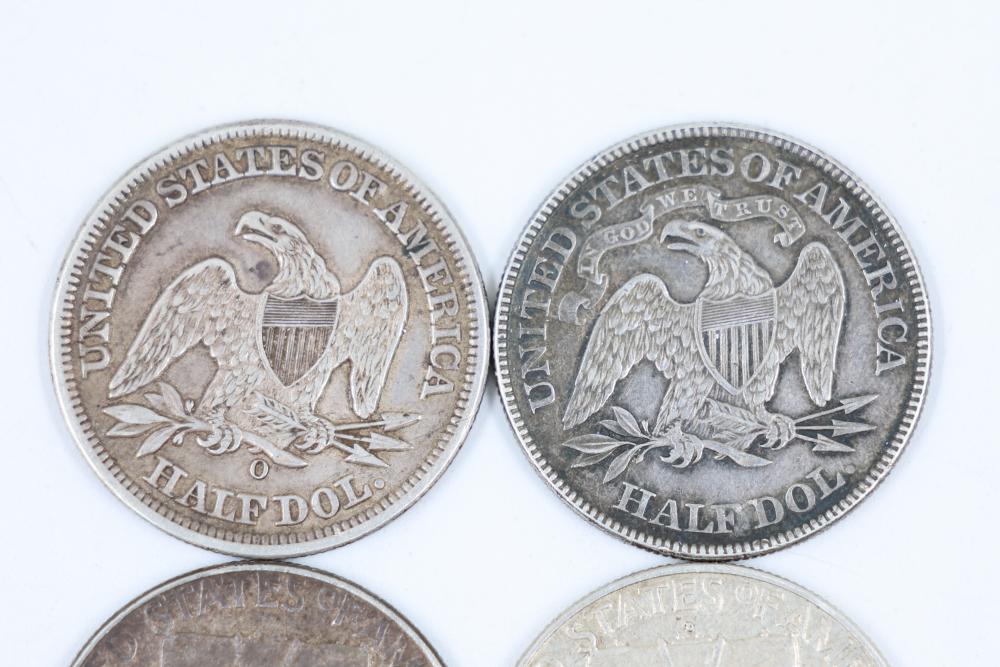 Four U.S. Half Dollars consisting of an 1858 Sitting Liberty O, 1888 Sitting Liberty, 1950 Benjamin, and 1965 Benjamin D Half Dollar.