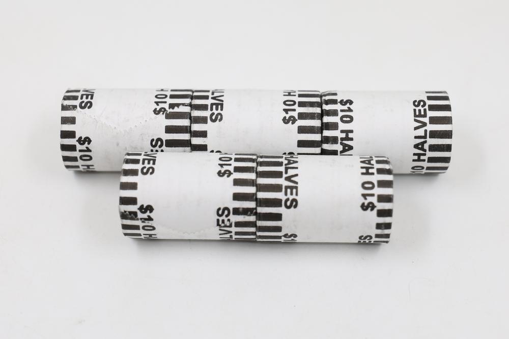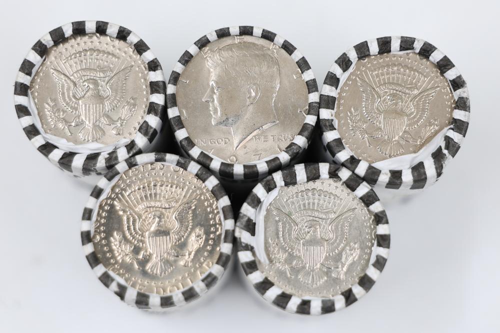 Five Rolls of Kennedy Half Dollars. Each roll contains $10 face value of coins. Coins feature classic Kennedy design on obverse and presidential seal on reverse.