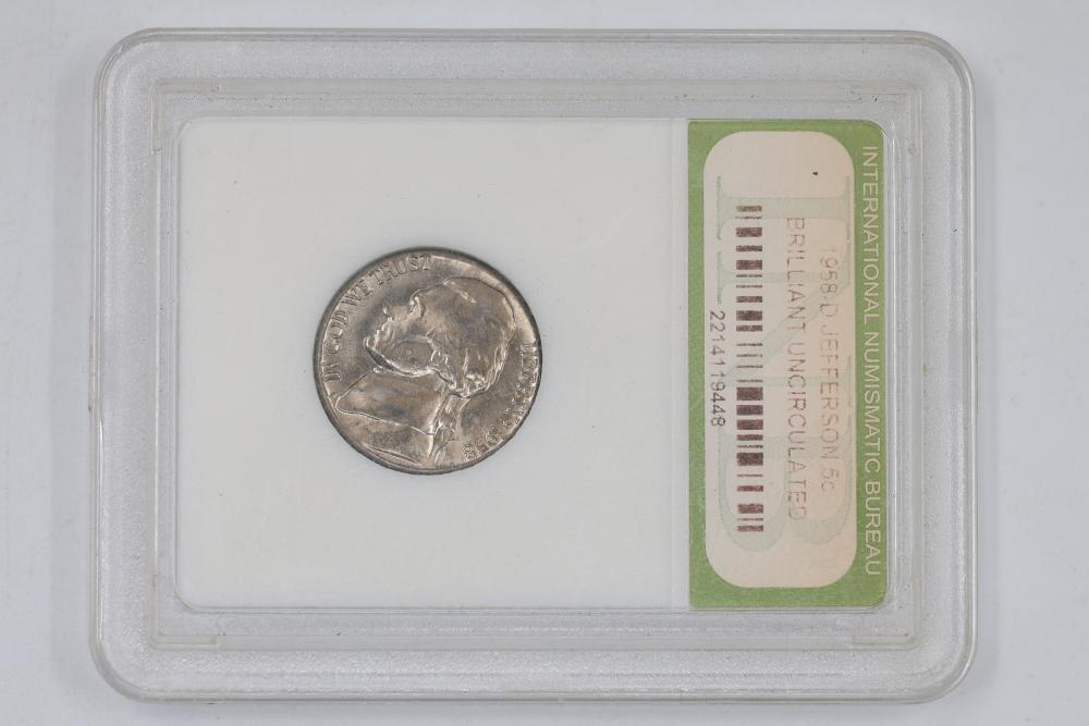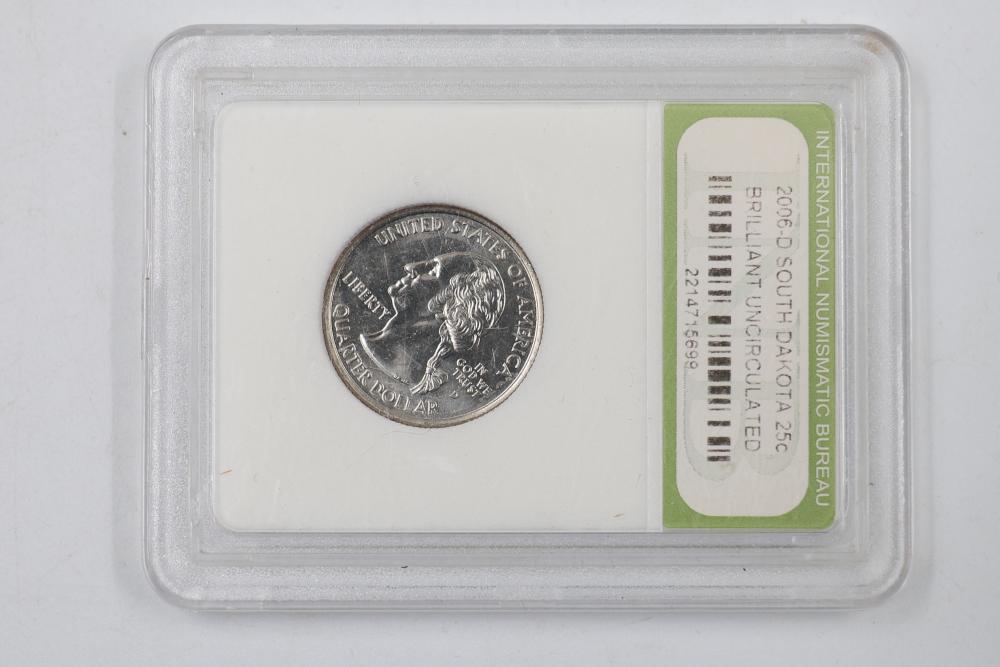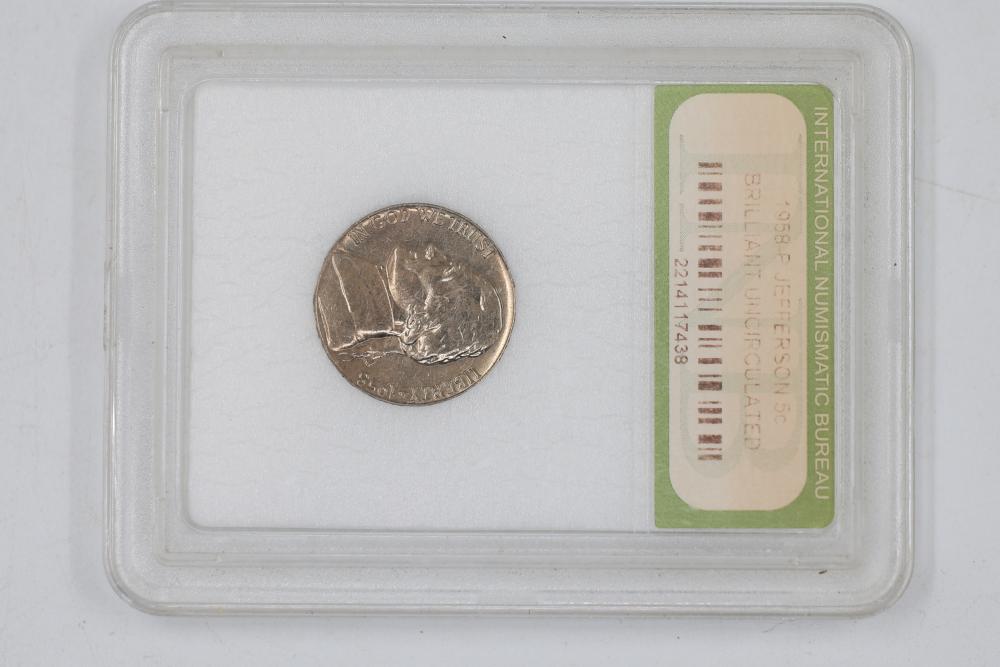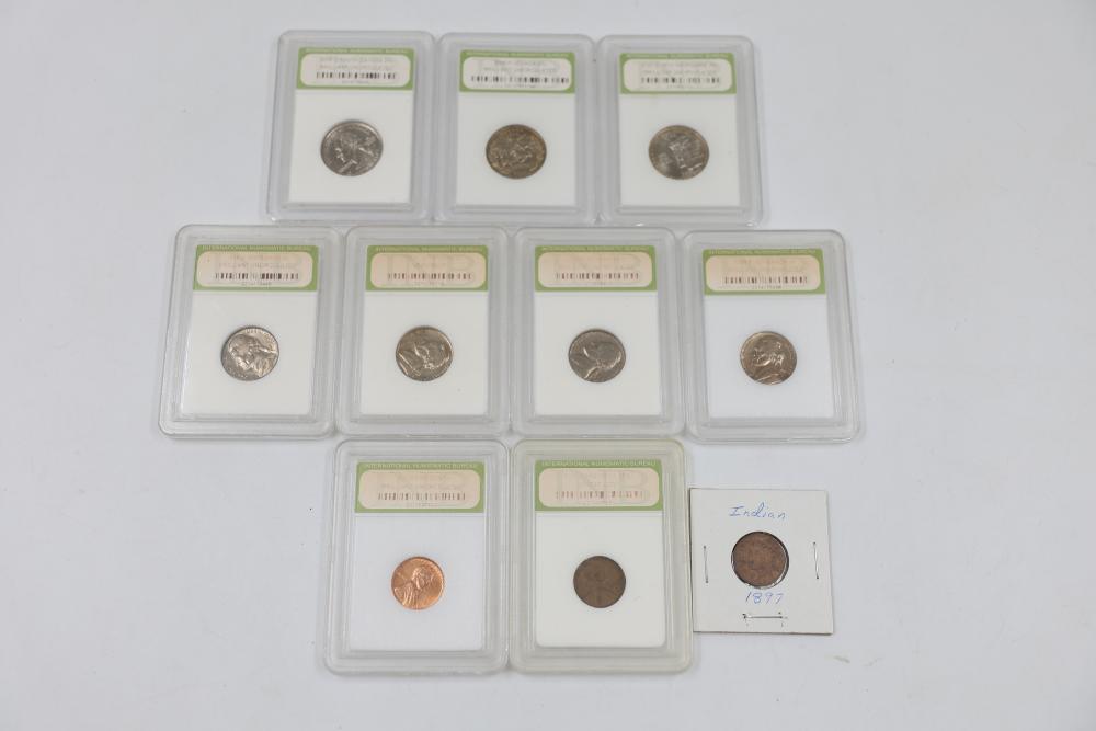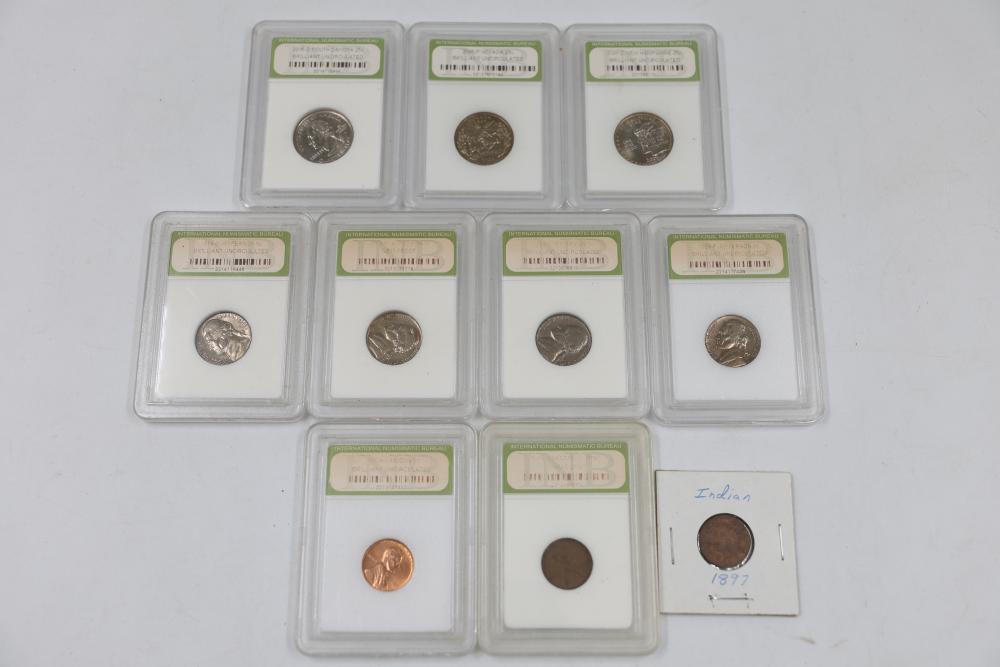 U.S. INB slabbed and graded coins incl 2000-D New Hampshire 25c , 2006- South Dakota 25c, 1954-P Jefferson 5c, 1958-D Jefferson 5c, 1970-S Jefferson 5c, 1959-P Lincoln 1c, 1954-S San Franciso Wheat Cent, and a 1897 Indian Head 1c.