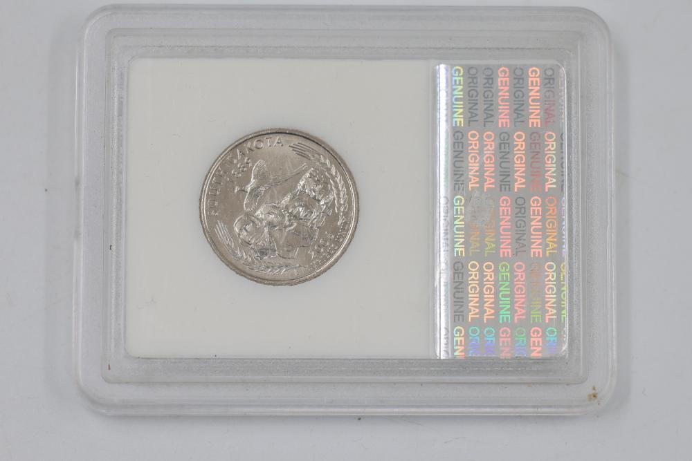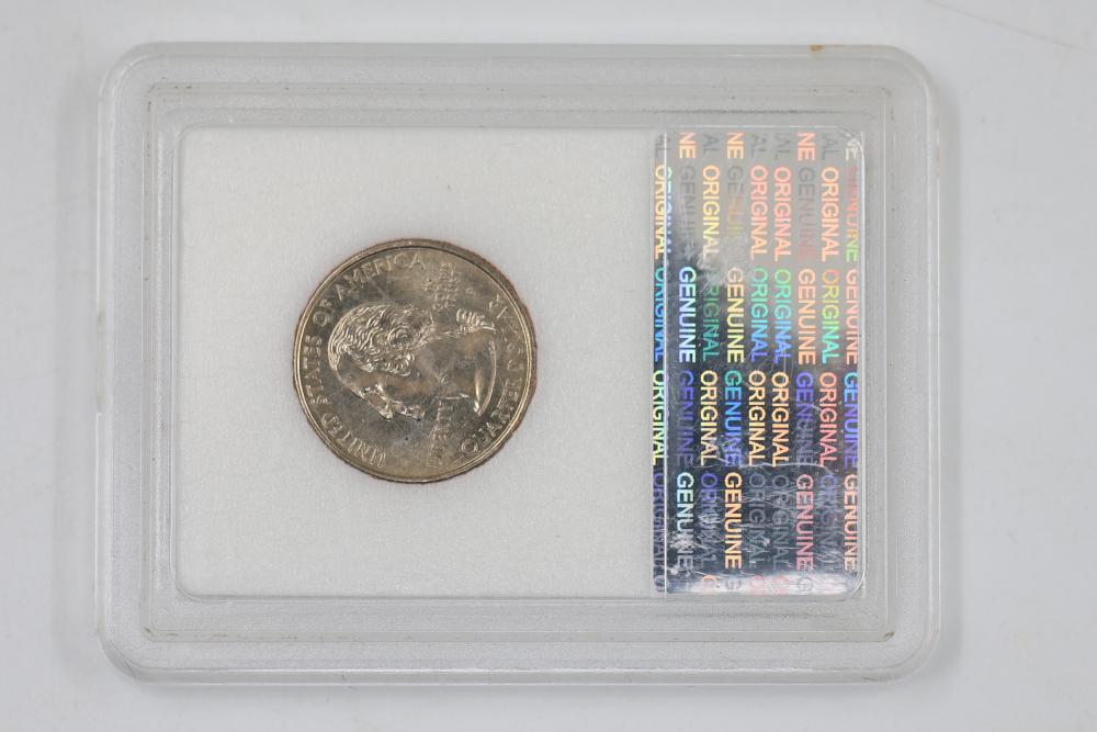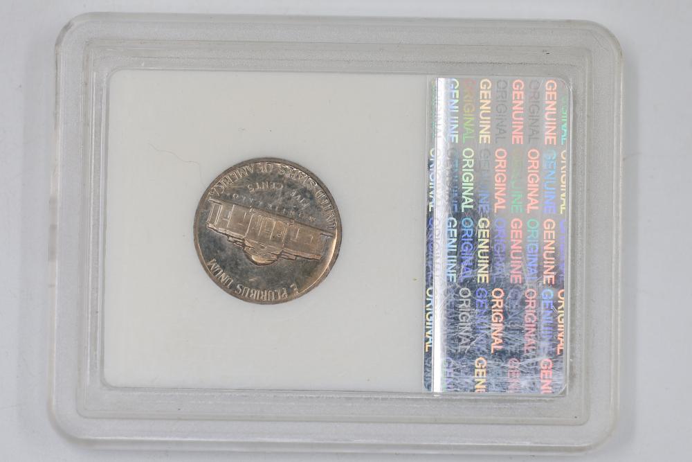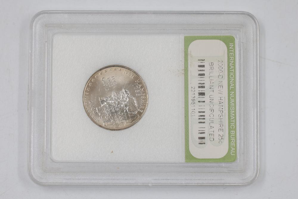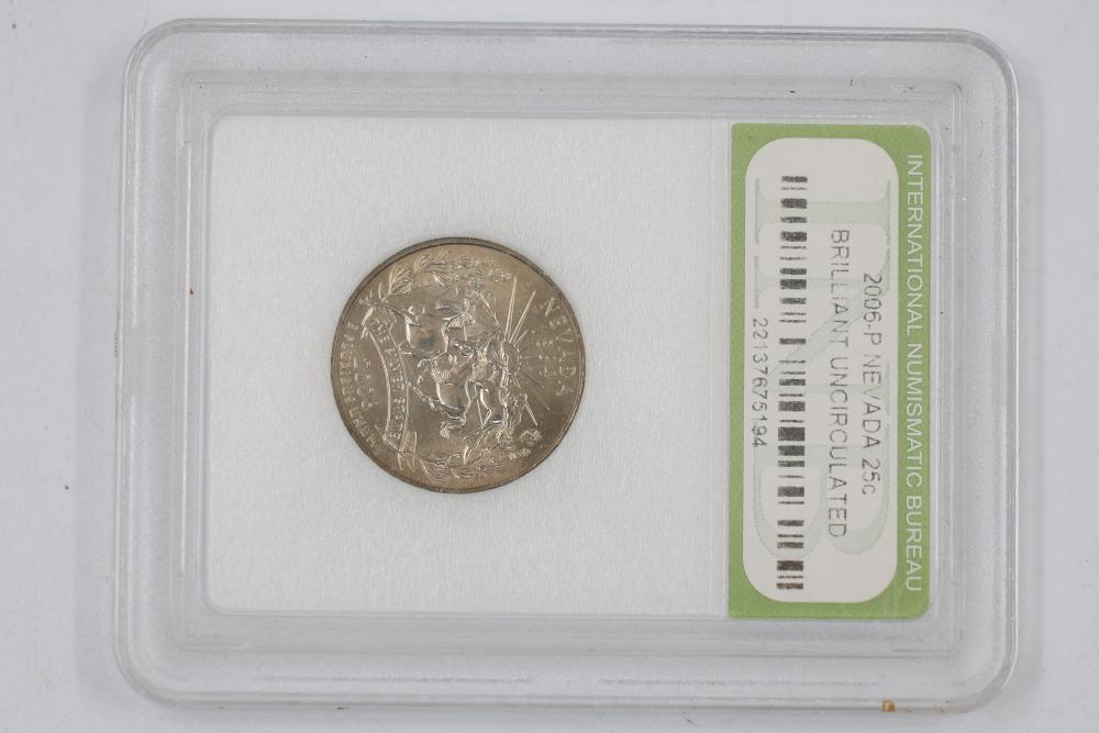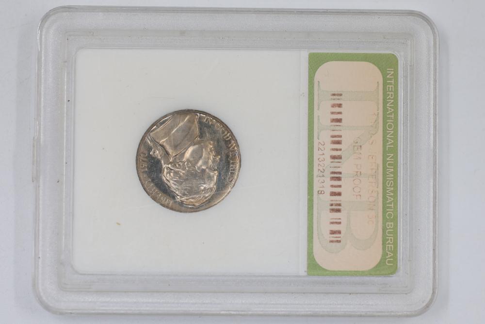 U.S. INB slabbed and graded coins incl 2000-D New Hampshire 25c , 2006- South Dakota 25c, 1954-P Jefferson 5c, 1958-D Jefferson 5c, 1970-S Jefferson 5c, 1959-P Lincoln 1c, 1954-S San Franciso Wheat Cent, and a 1897 Indian Head 1c.