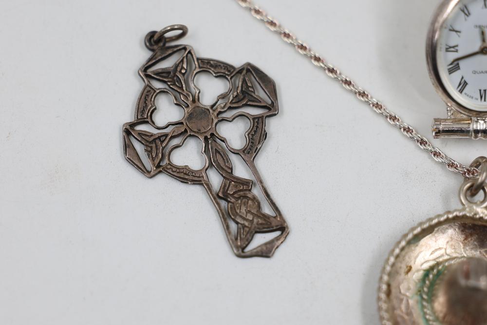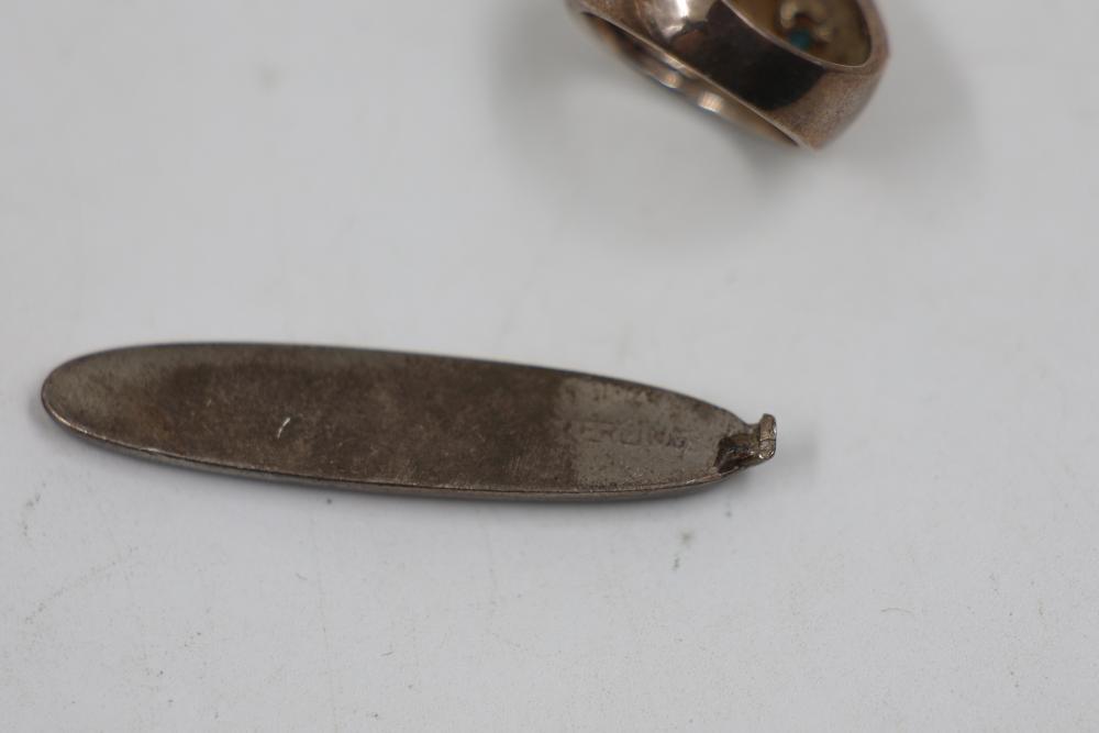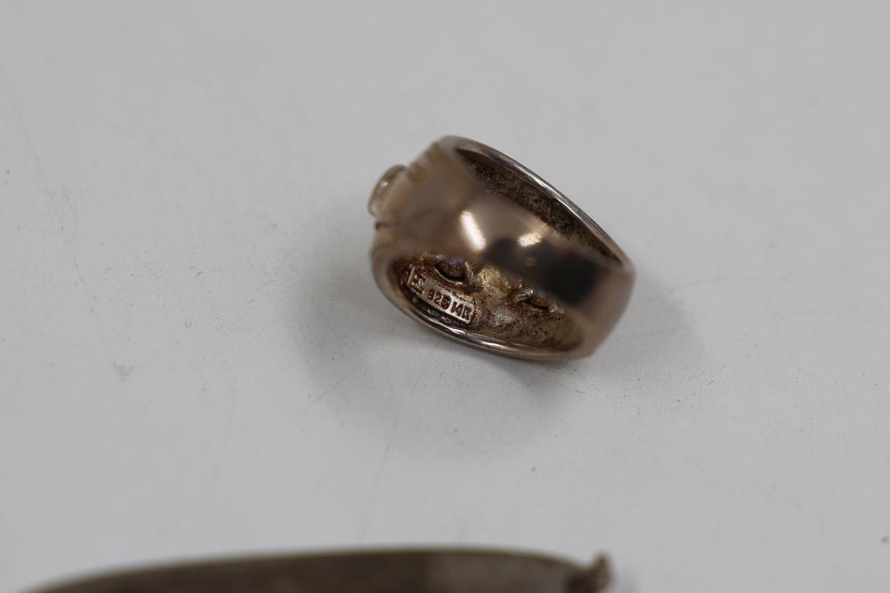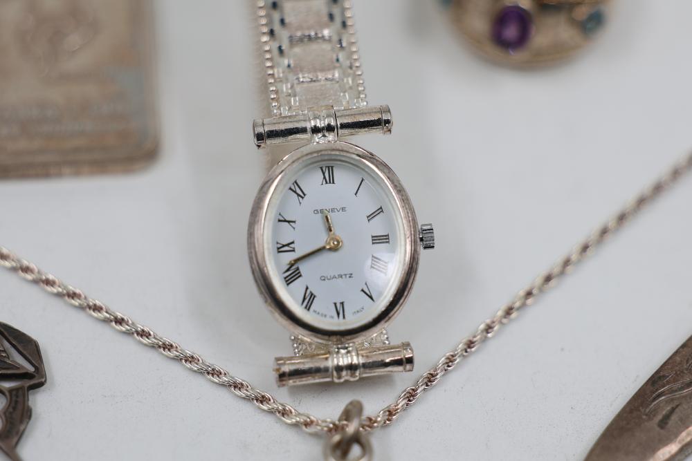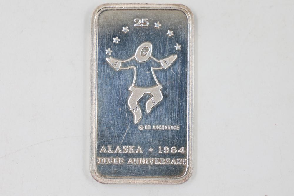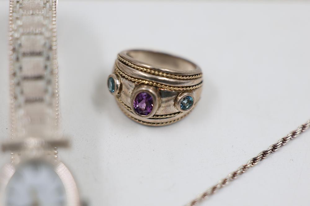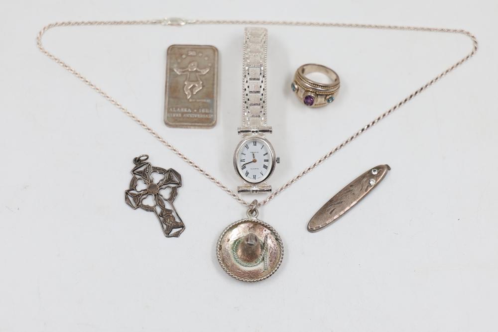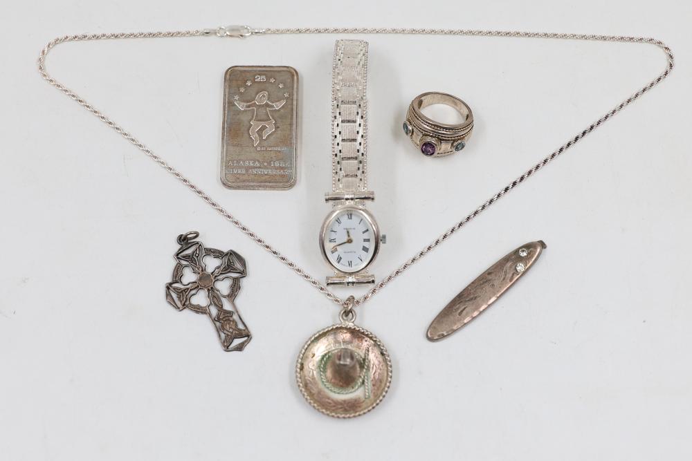 Sterling Silver Jewelry, 1984 Alaska Silver Bar, and 14k Stamped Ring. Includes a sterling silver Alaska 1984 25th Anniversary silver bar Stamped "Oxford", sterling stamped silver wristwatch, sterling silver chain necklace with pendant, sterling adn 14k stamped ring with purple and blue stones, and cross pendant. WEIGHT