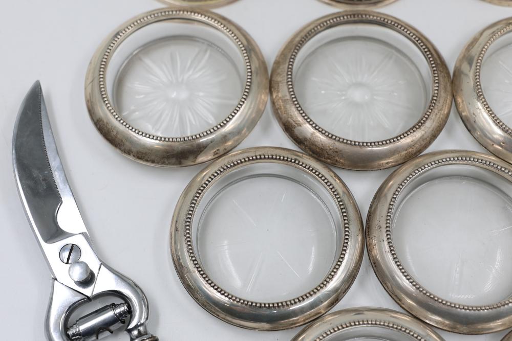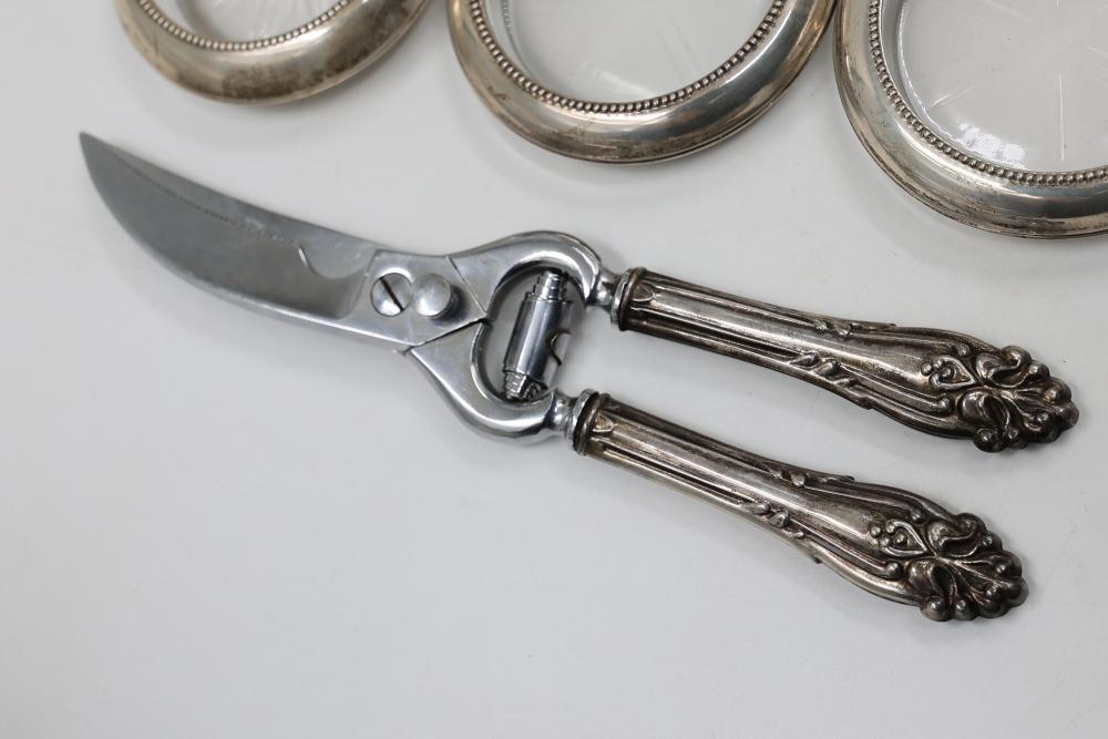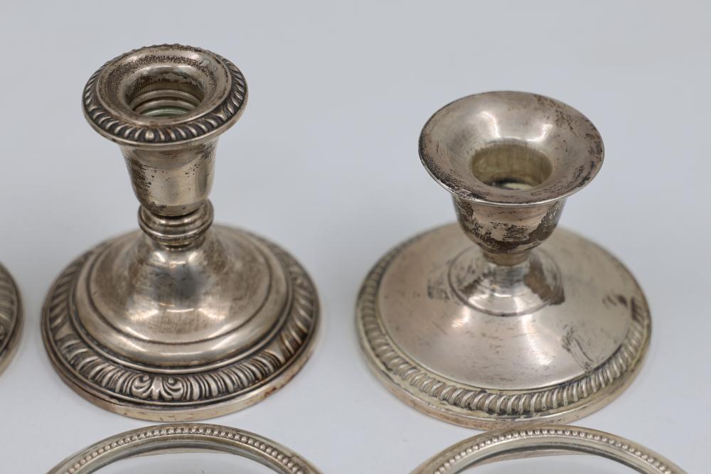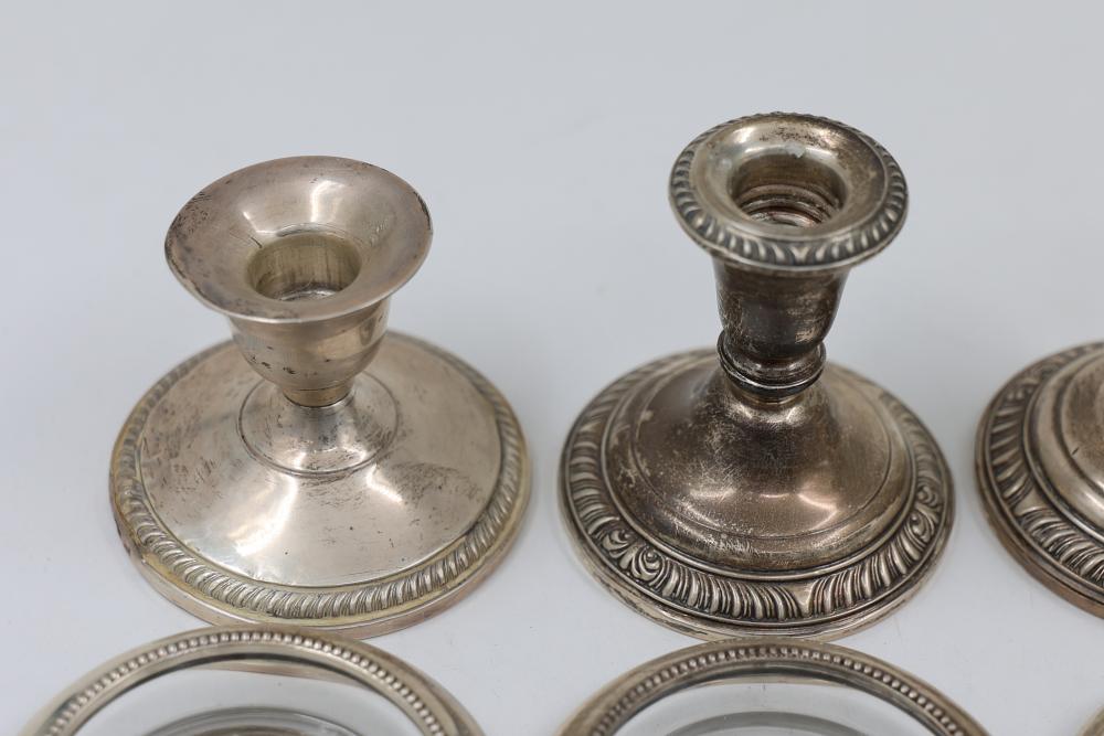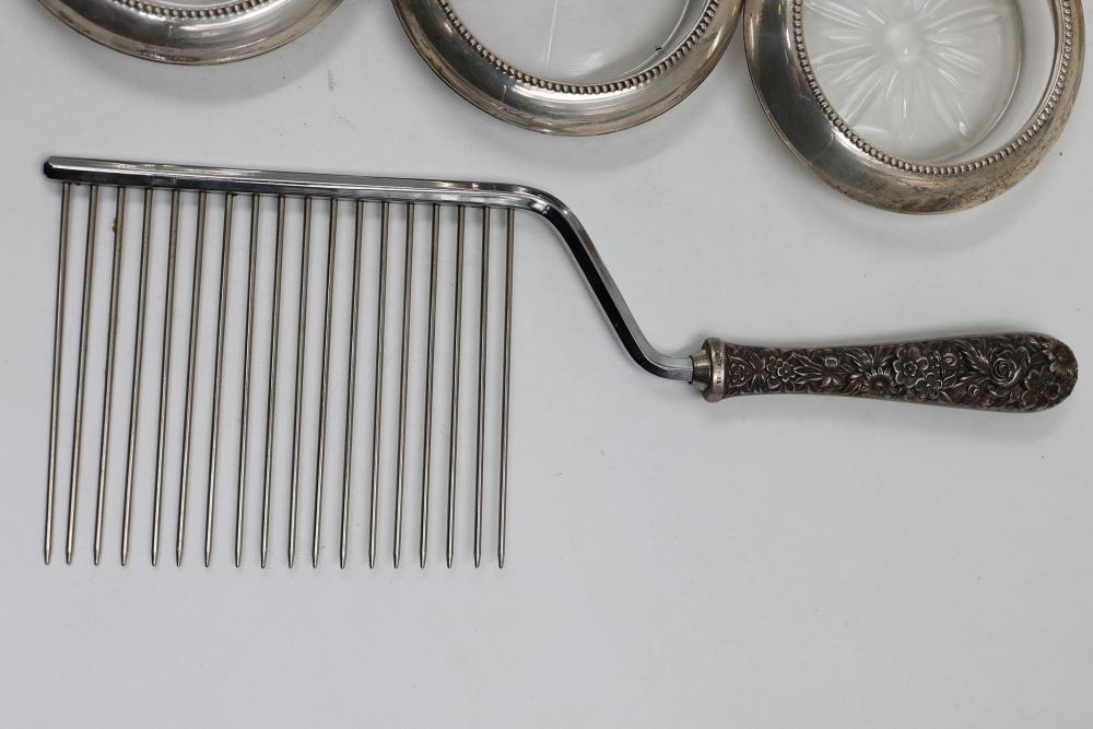 Sterling Stamped Silver Candle Holders and Table Accessories including four candlesticks, a set of small coasters with cut glass inserts, a comb with embellished handle, and kitchen scissors with decorative handles. Total weight is 2831 grams.