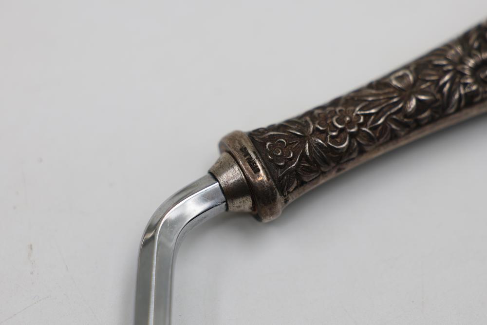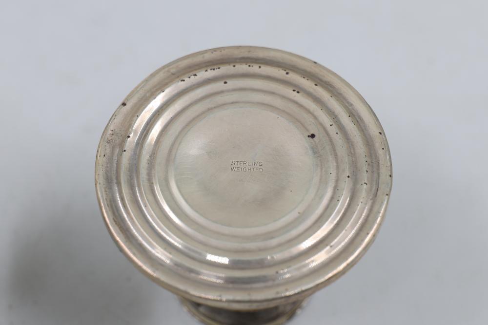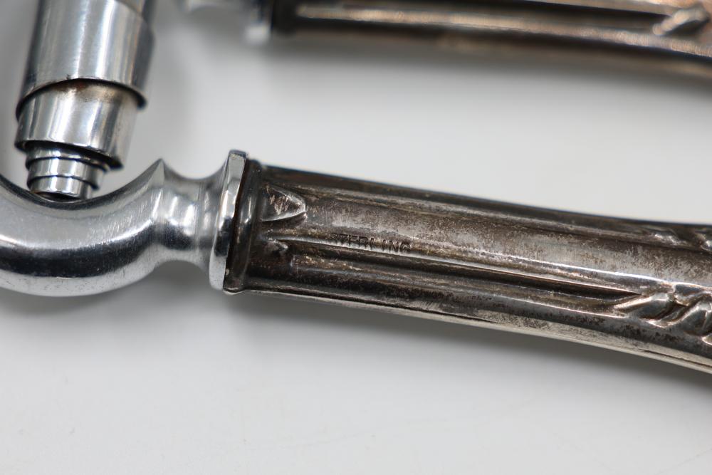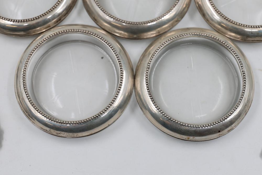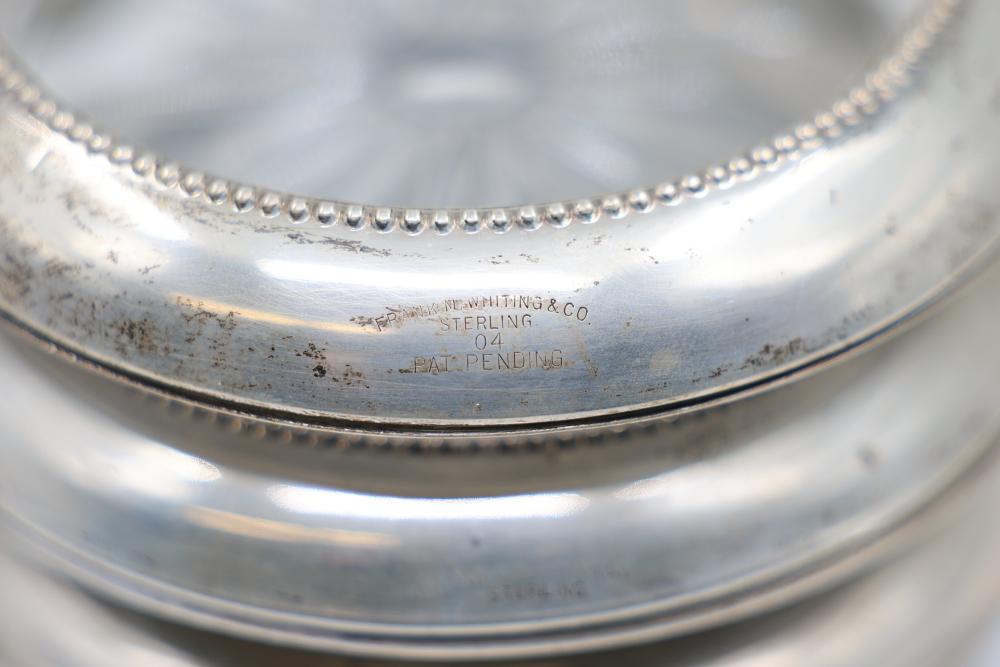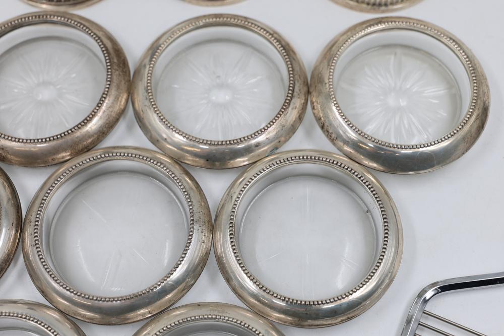 Sterling Stamped Silver Candle Holders and Table Accessories including four candlesticks, a set of small coasters with cut glass inserts, a comb with embellished handle, and kitchen scissors with decorative handles. Total weight is 2831 grams.