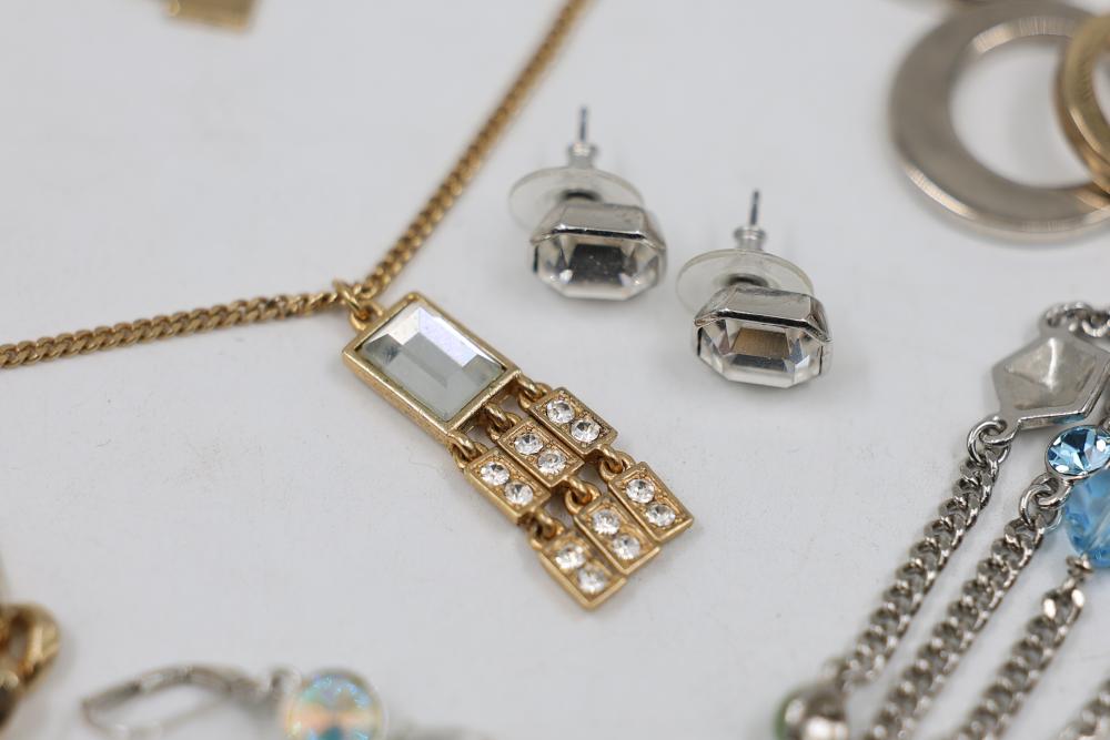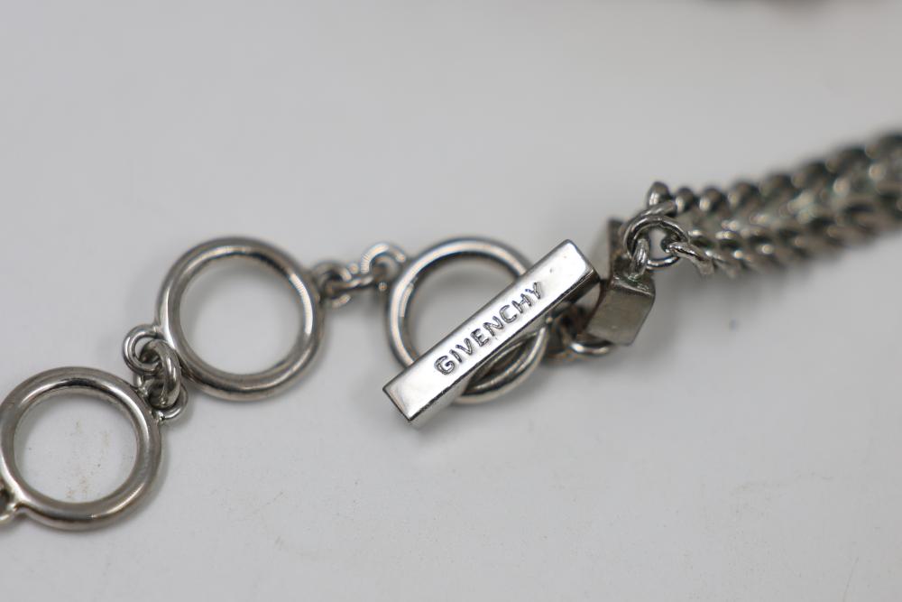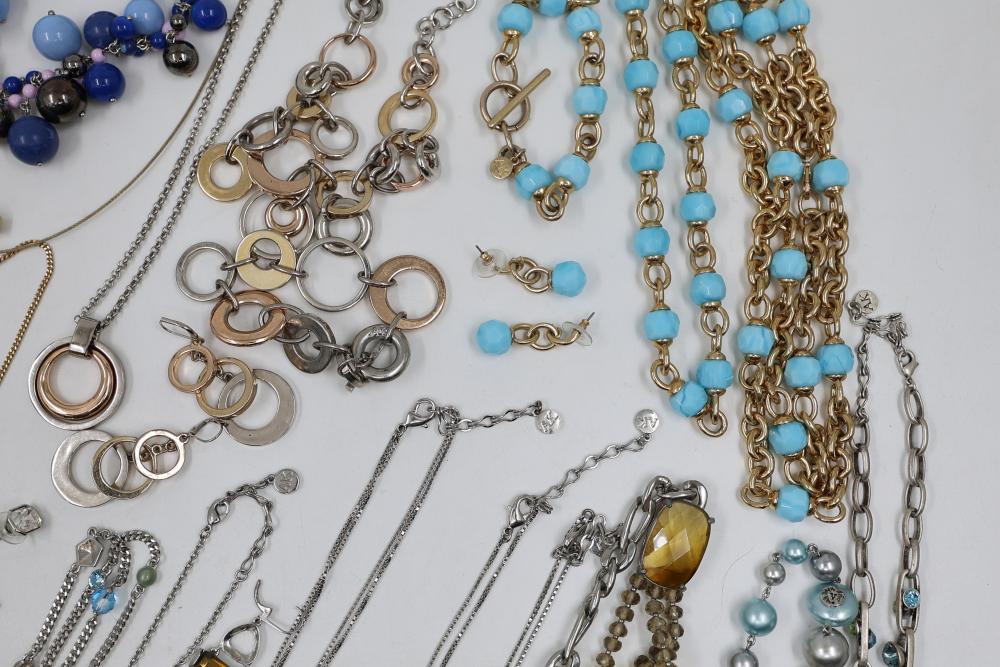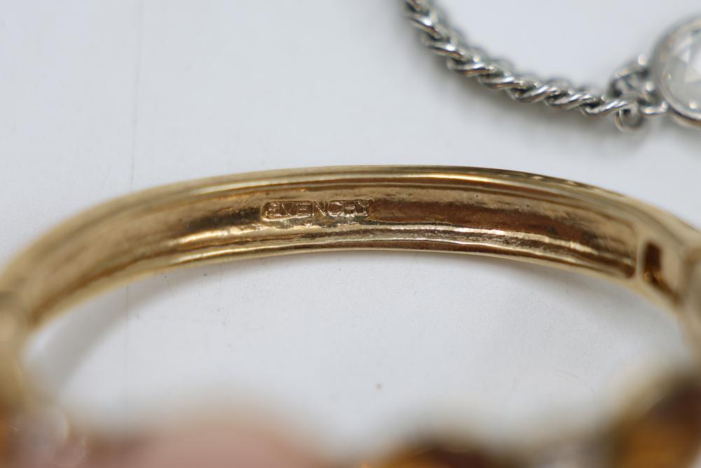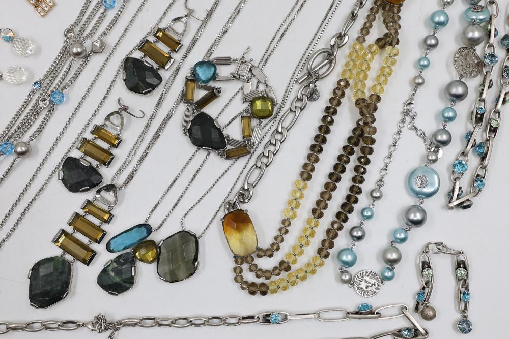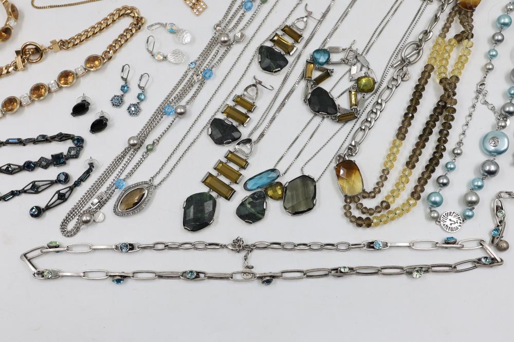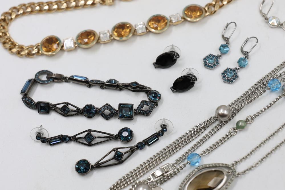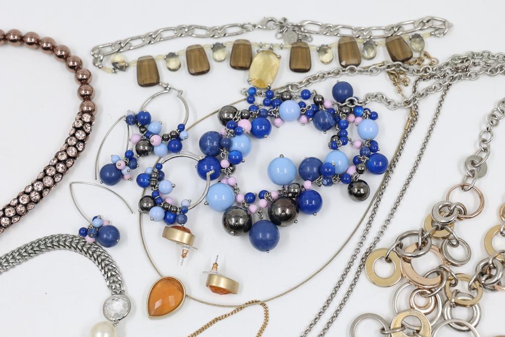 Costume Jewelry including necklaces, bracelets, and earrings in a variety of designs and materials. Items feature chains, beads, gemstone accents, and varied metal finishes, with many items Stamped Givenchy and AK.