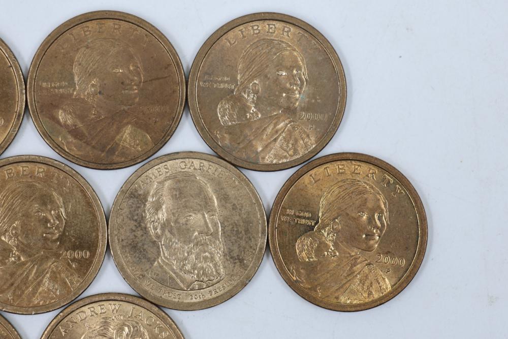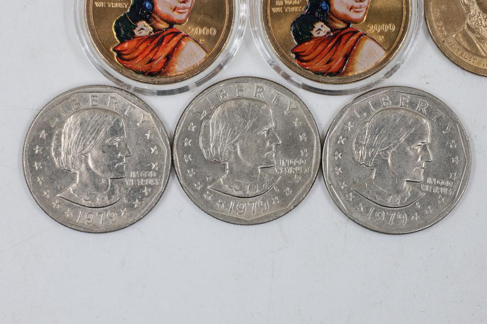 1979 Susan B. Anthony and Sacagawea Dollar Coins Set. Includes multiple Susan B. Anthony dollar coins from 1979 and Sacagawea dollar coins, some with colorful designs. 29 coins in total.