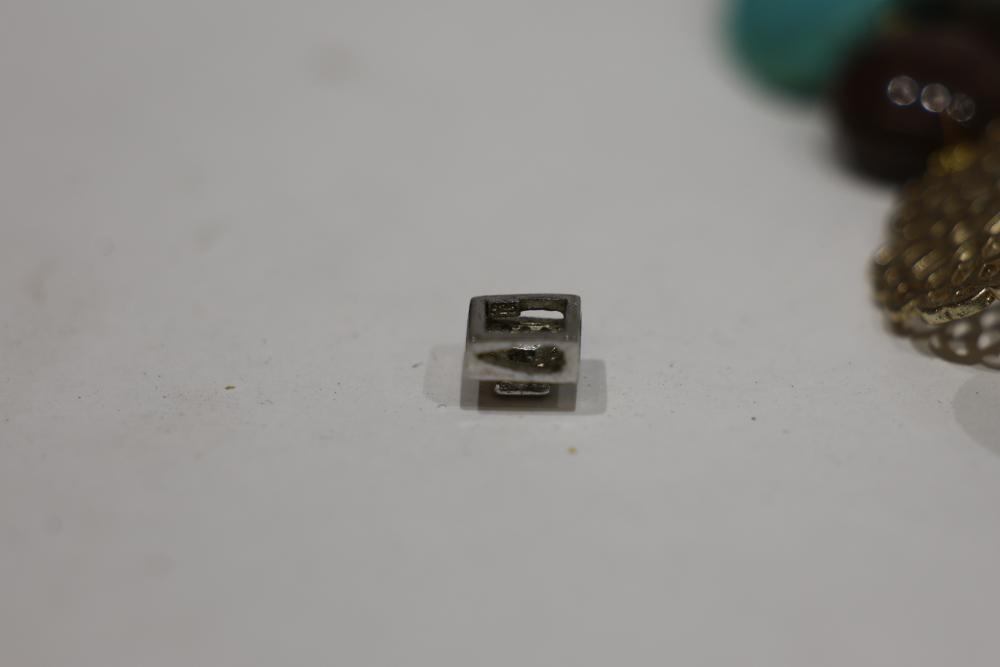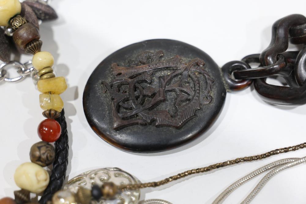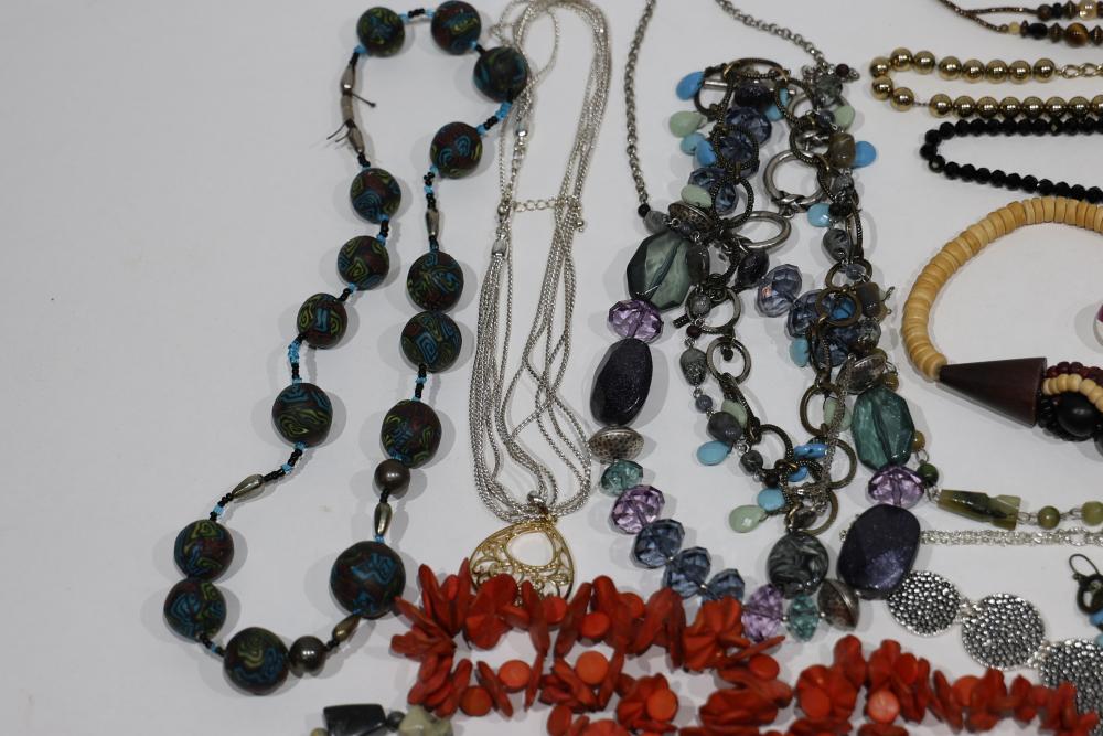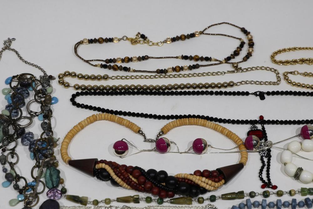 Costume Jewelry including necklaces, beaded designs, and pendants. Items feature a variety of materials, designs, and embellishments, including turquoise, coral-like beads, metal elements, and intricate pendants. Includes both chain and beaded styles, as well as a mixture of colors and shapes.