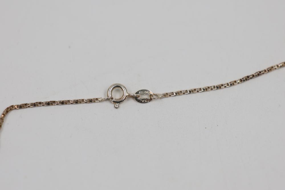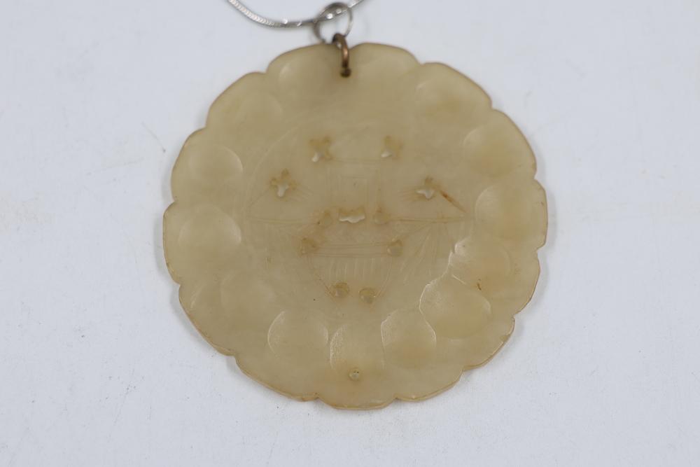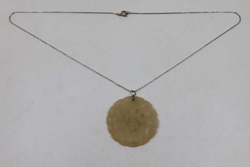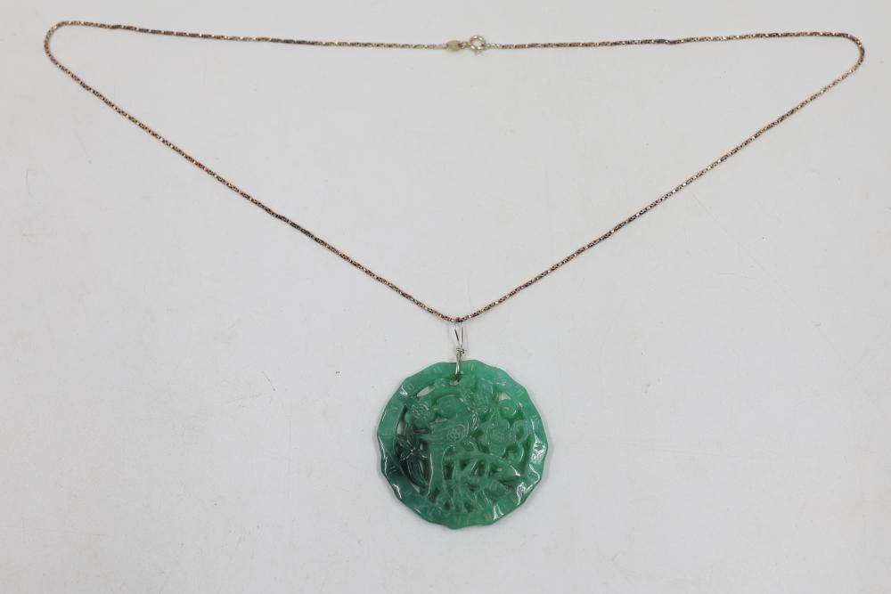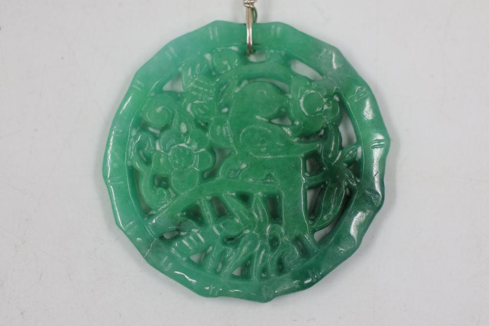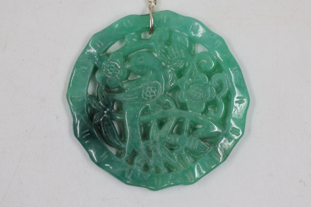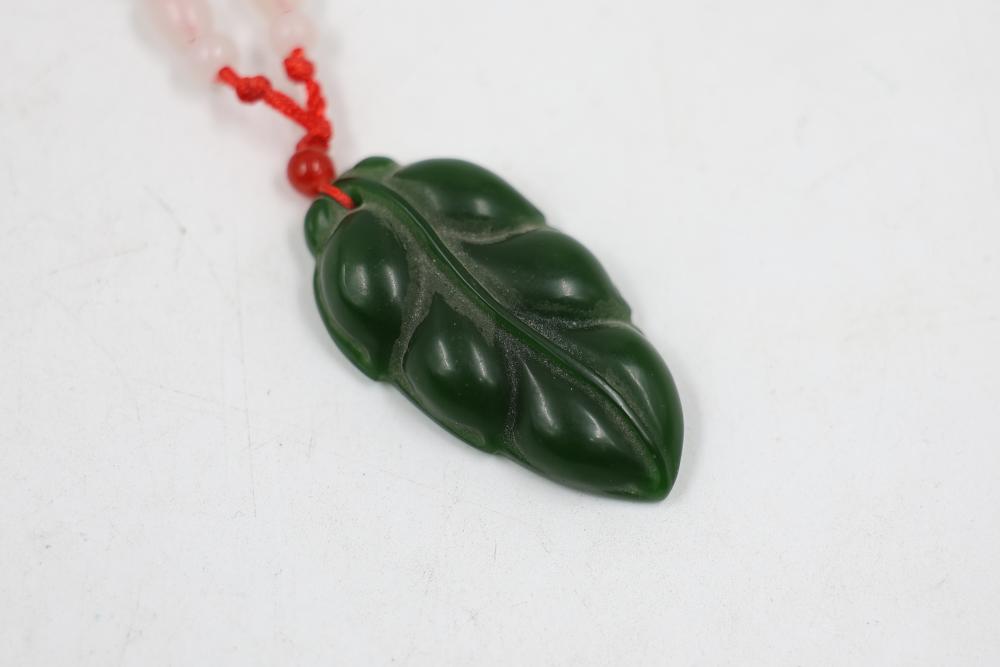 Three Pendant Necklaces with Cord and Metal Chains. Includes a green leaf-shaped pendant with a red cord, a round light-colored carved stone pendant on a metal chain, and a round green carved pendant on a metal chain.